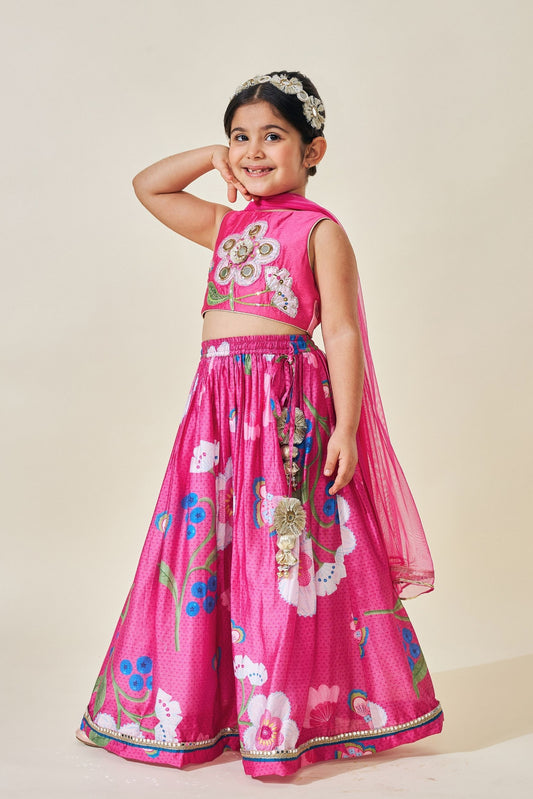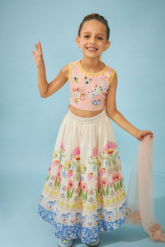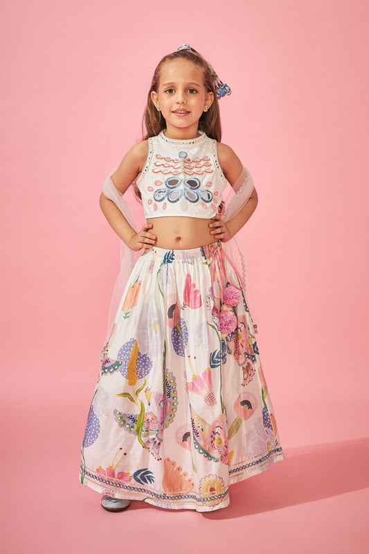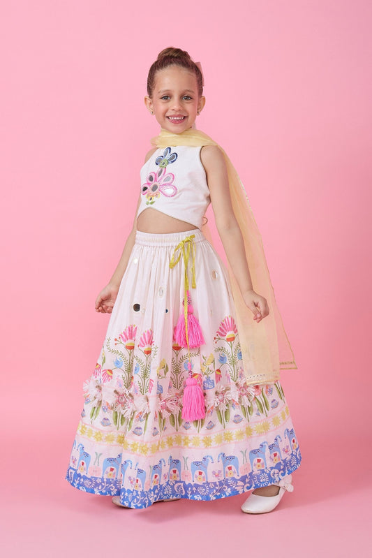 Dala Girls Skirt With Embellished Ivory Crop Top And Dupatta ( Set Of Three)