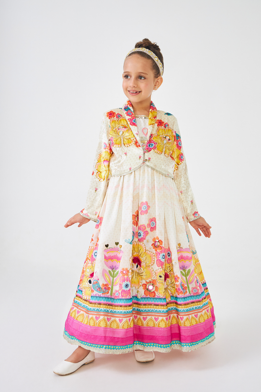 Freya Mustard Embellished Girls Long Dress With Jacket (Set of 2 Pcs)