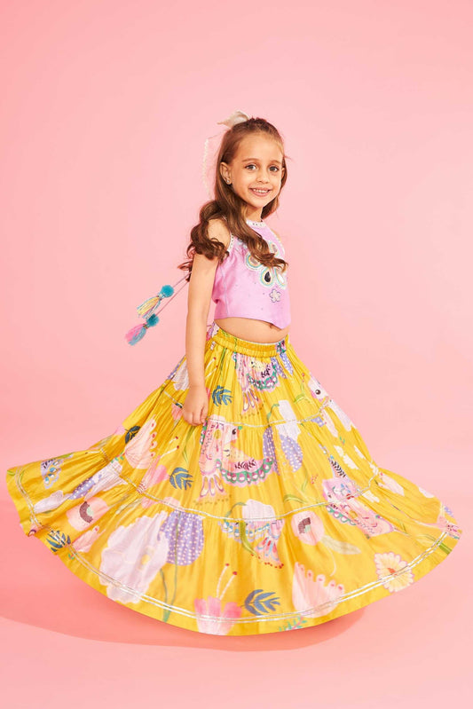 Yellow Bloom Girls Embellished Lavender Top With Tiered Skirt (3 Pc Set)