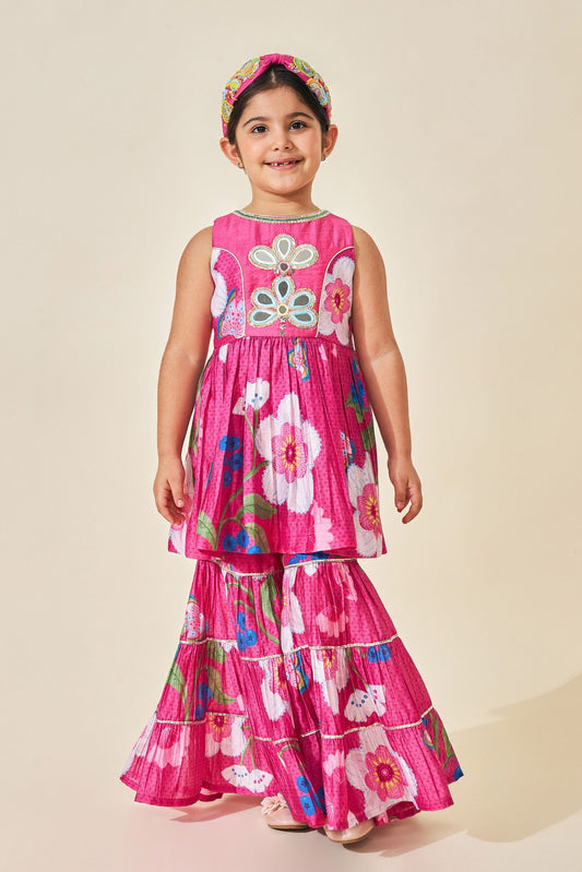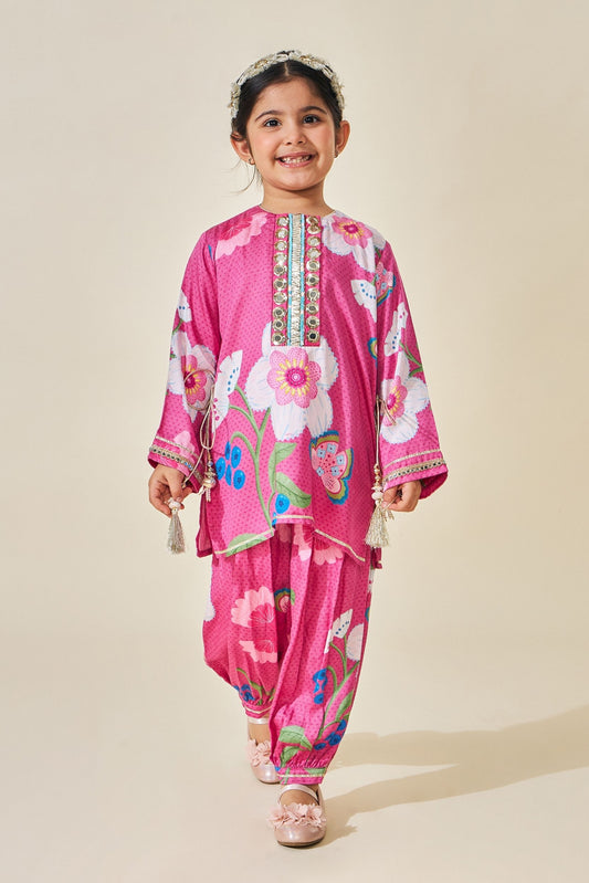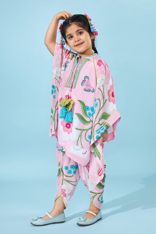 Raya Pink Girls Embellished Kaftan Top & Tulip Pant ( Set Of 2 pcs)