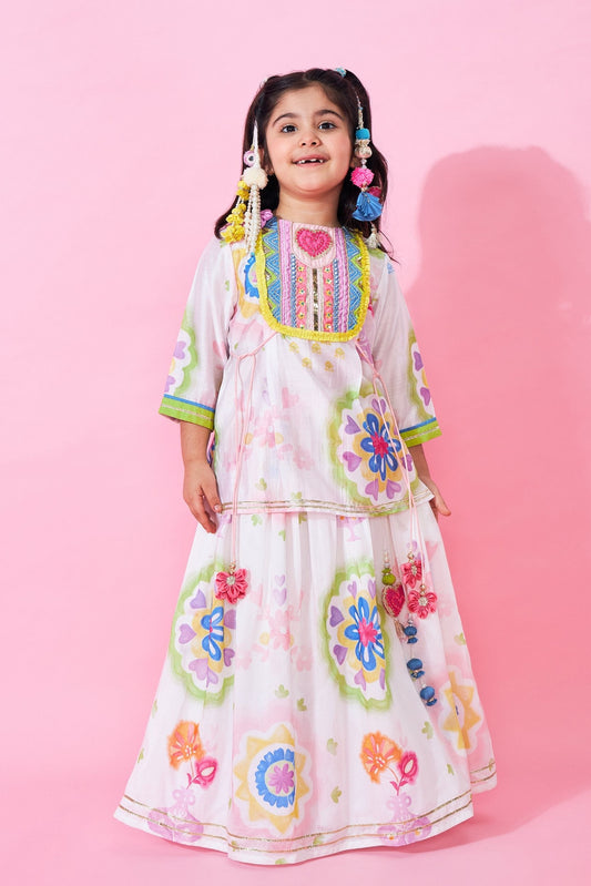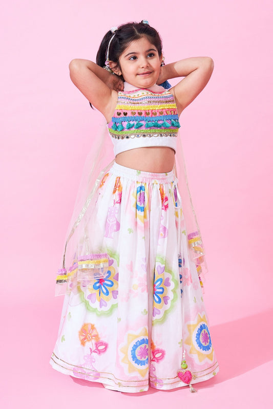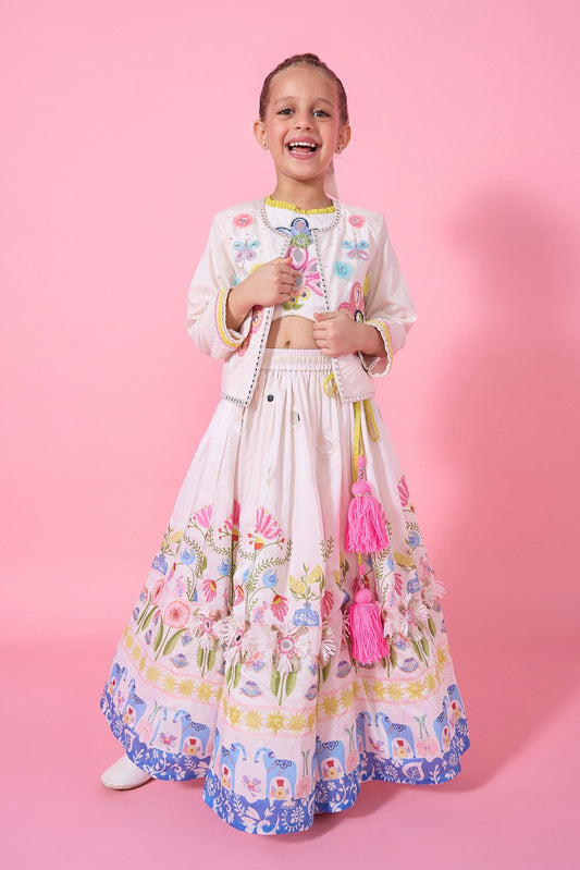 Dala Girls Skirt With Embellished Ivory Crop Top And Dupatta ( Set Of Three)