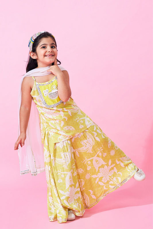 Poppy Yellow Girls Embellished Long Top and Flared Trousers with Dupatta ( Set of 3 pcs)