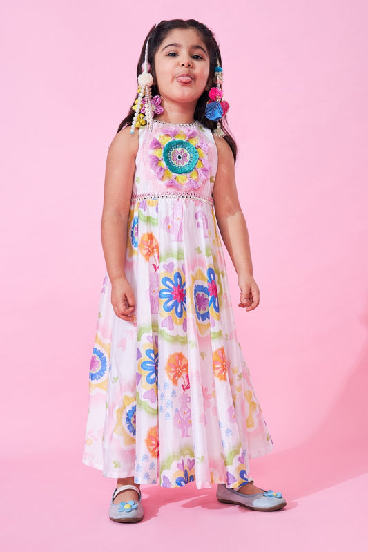 Ivory Long Embroidered Girls Top & Flared pant Set (Set Of Three)