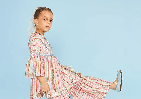 Riva Long Embroidered Girls Top & Flared Pant Set (Set of 3 Pcs)