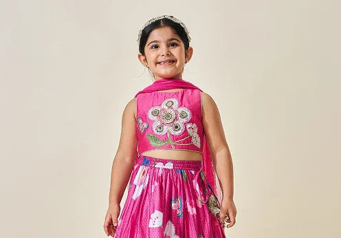 Raya Pink Girls Embellished Crop Top lehenga with dupatta ( Set Of 3 pcs)