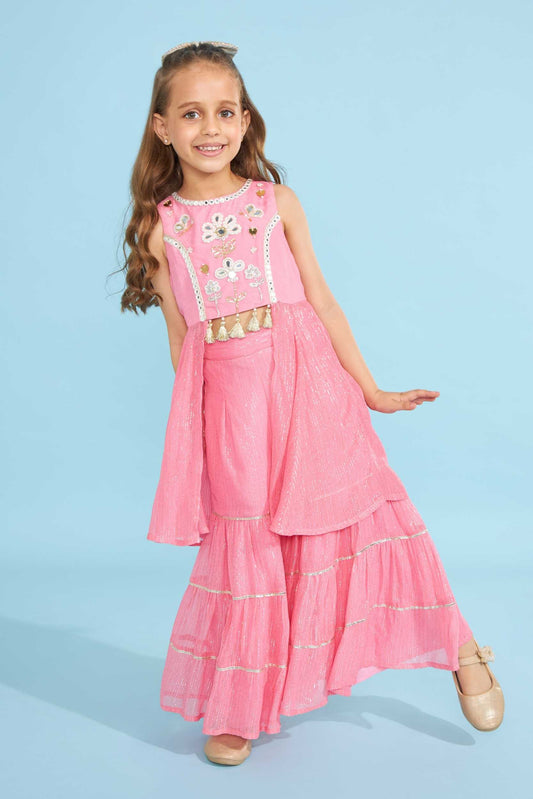 Bubble Pink Hearts Girls Embellished Tunic With Layered Palazzos (2 Pc Set)