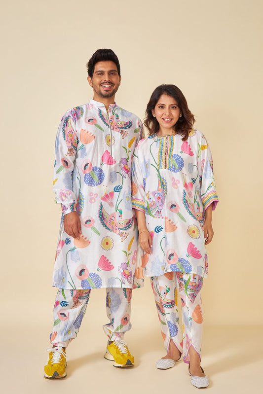 White Bloom Embellished Ladies Kaftan Top And Pant Set Of 2 + White Bloom Men's Kurta And Pant Set Of 2