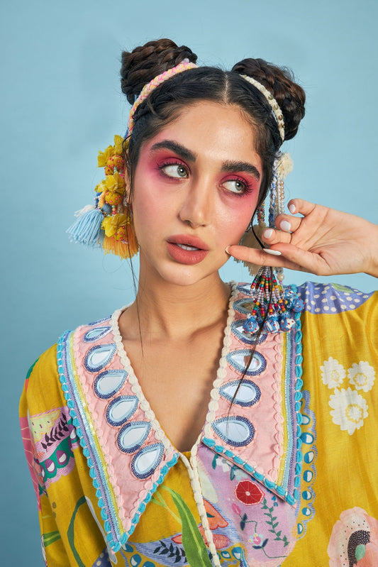 Mirror Embellished Collar Yellow Bloom Cape Set - Mom & Me