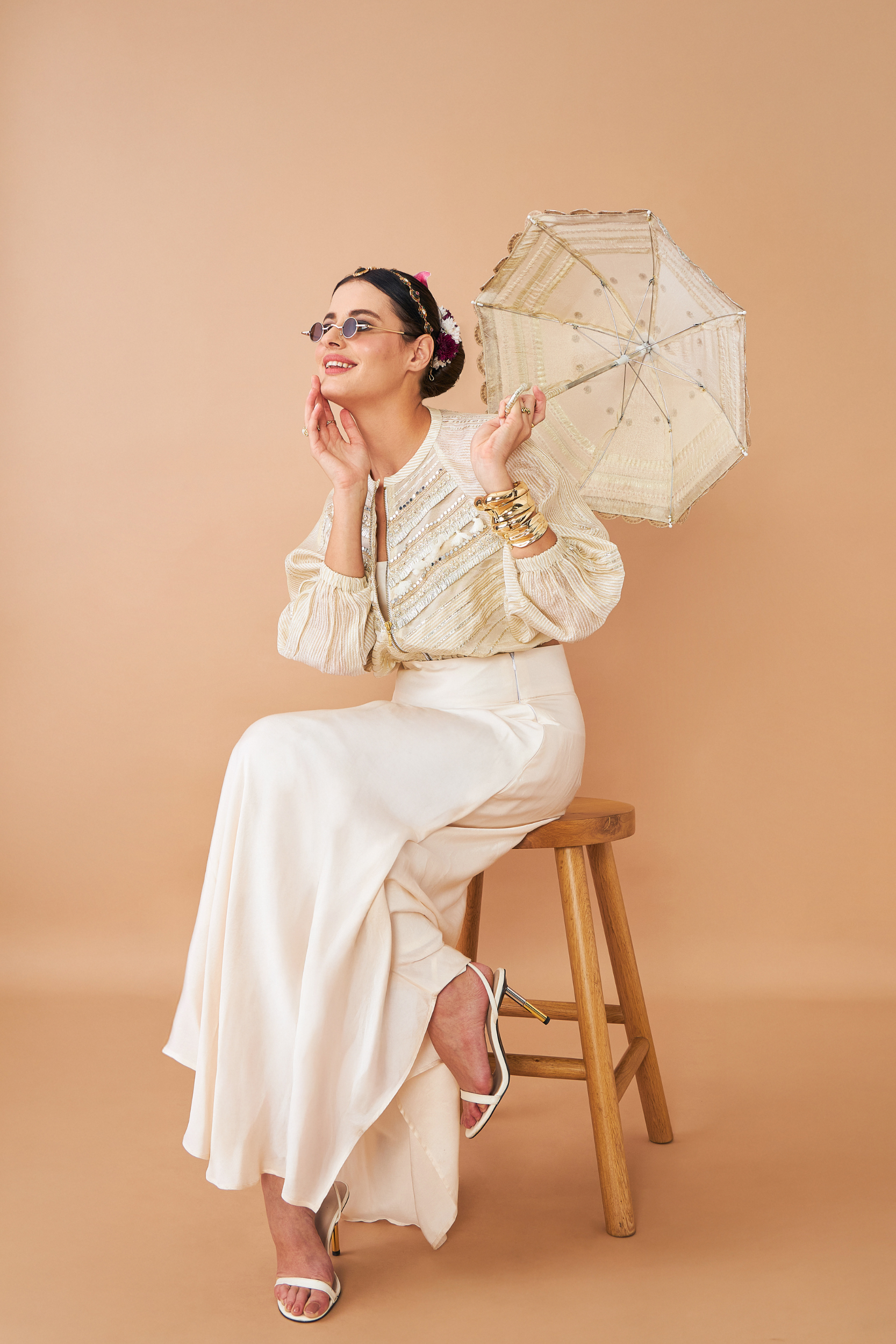 - Skirt in Ivory Bemberg Satin With Draped Waist, Wide Belt & Uneven Hem.