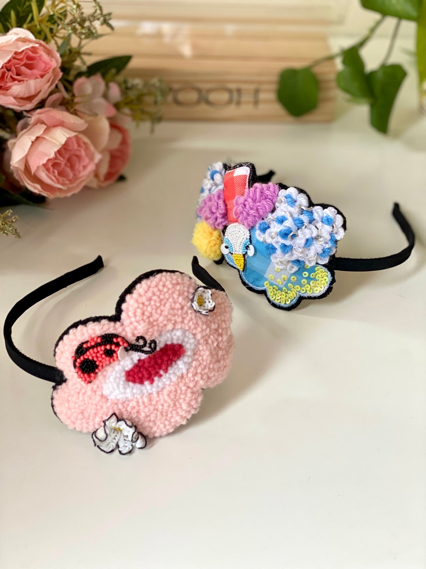 Bobo set of headbands are directly from our Peekaboo collection. Taking tiny tots closer to nature by imbibing the sky, clouds, flowers,bees, birds in most colorful and cute way. Handtufted headbands with the 3-D motifs done by hand is representation of Joey & Pooh's tremendous love towards all babies and kids out there.