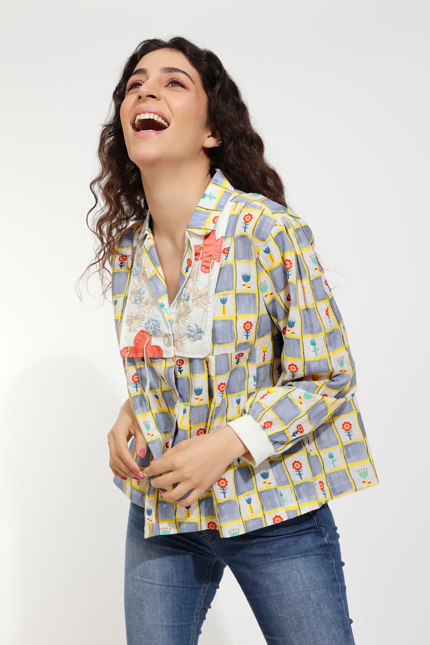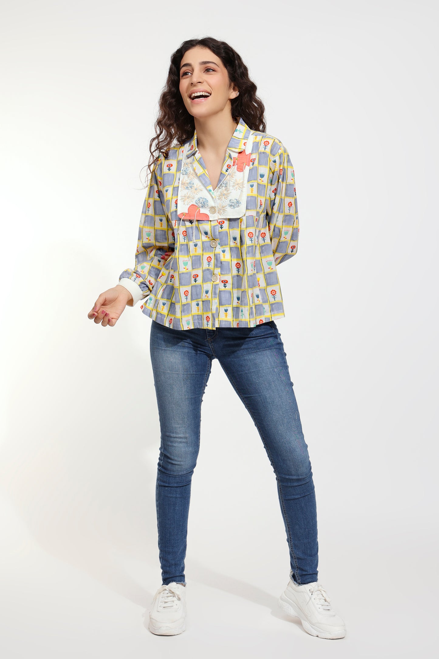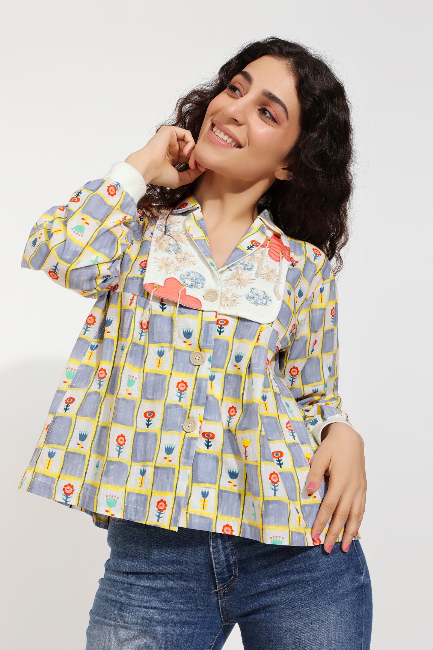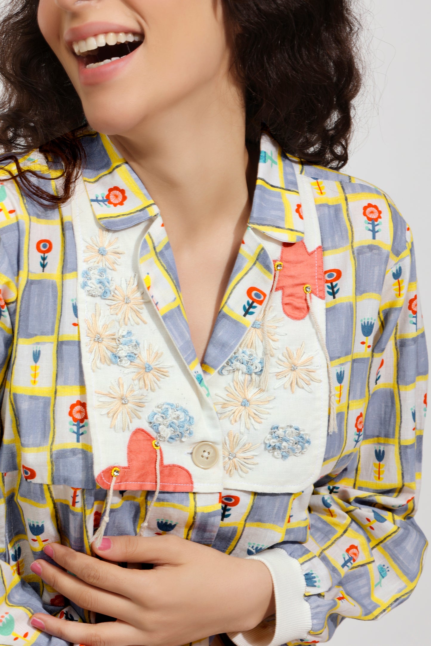 The name of the top suggests the elaborate print which is adorned by a distinct yoke and notched collar design! The yoke is defined by hand embroidery of graceful threadwork and cords.