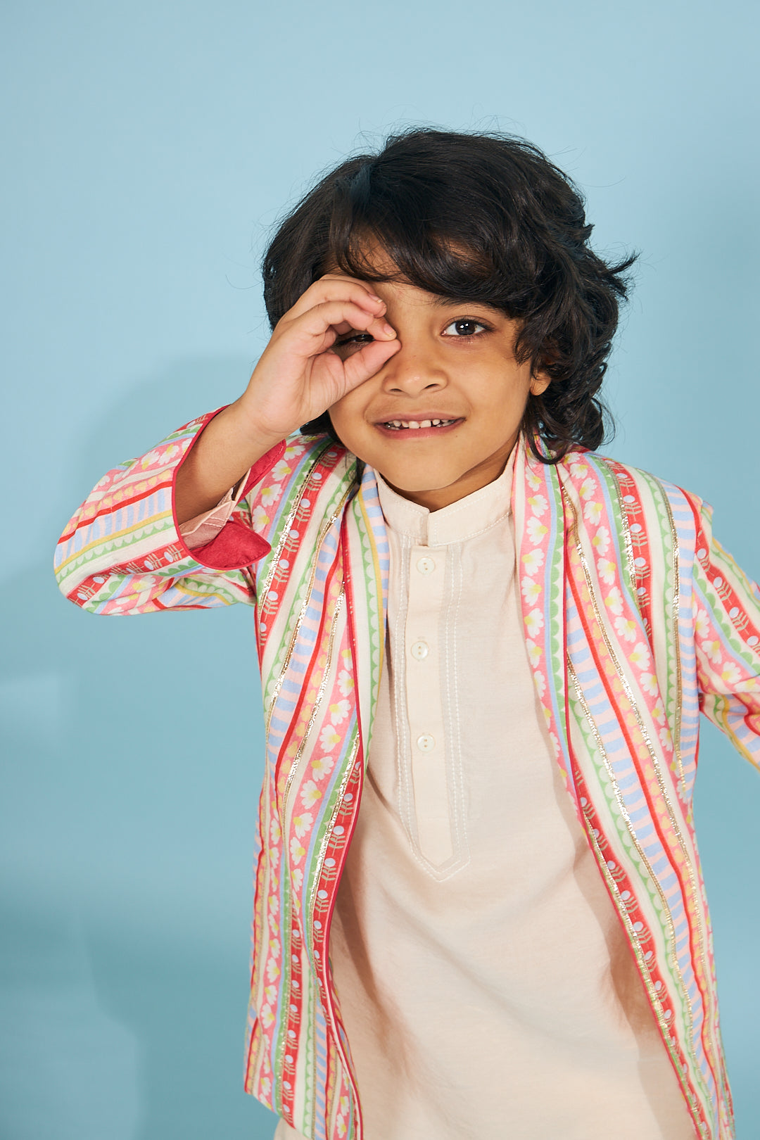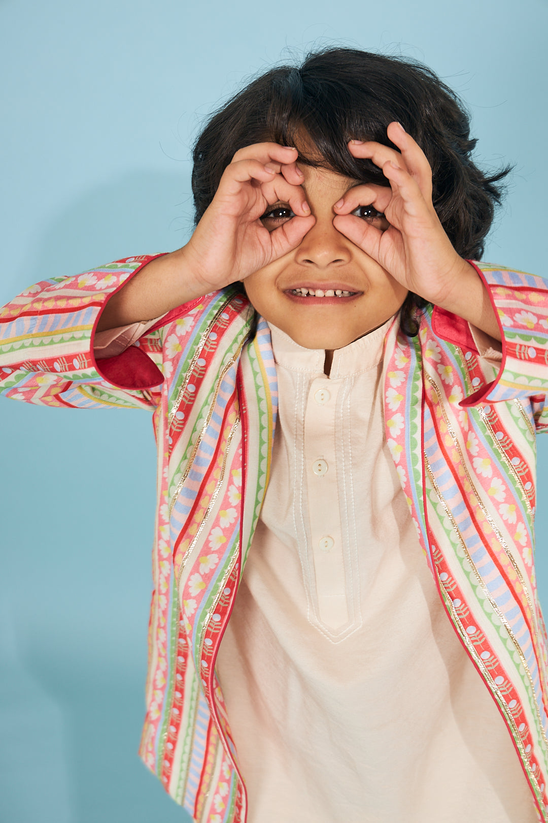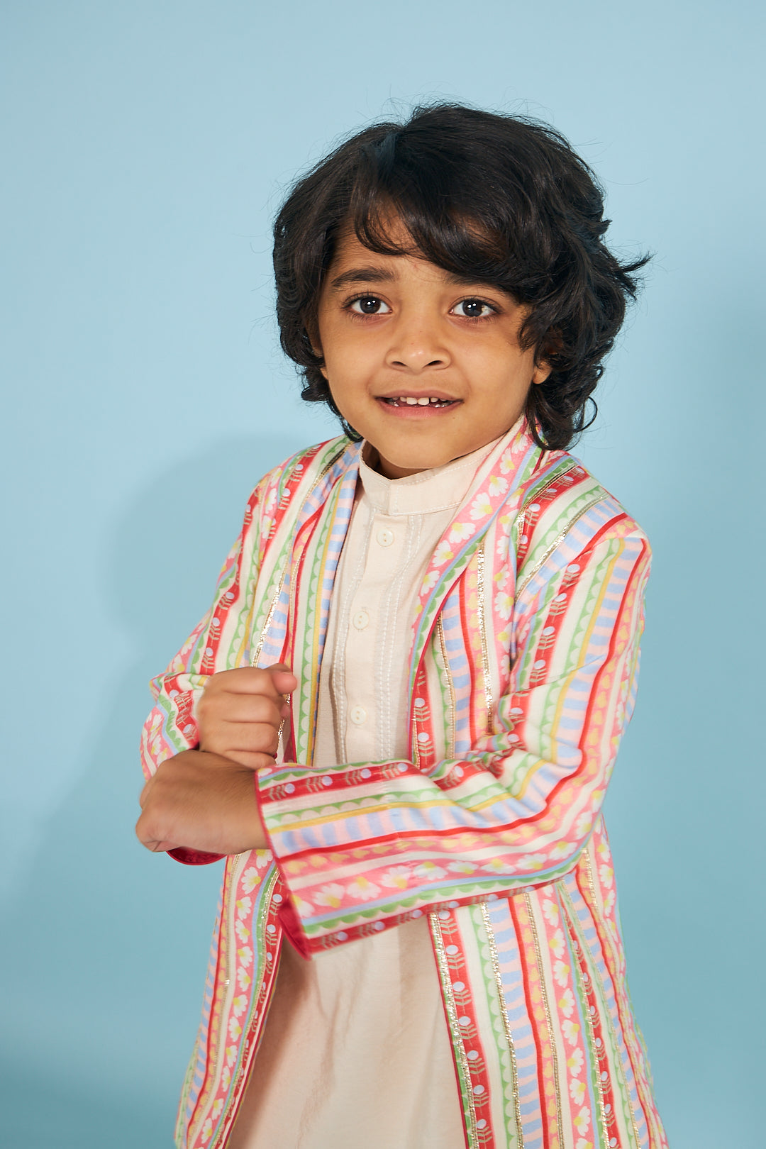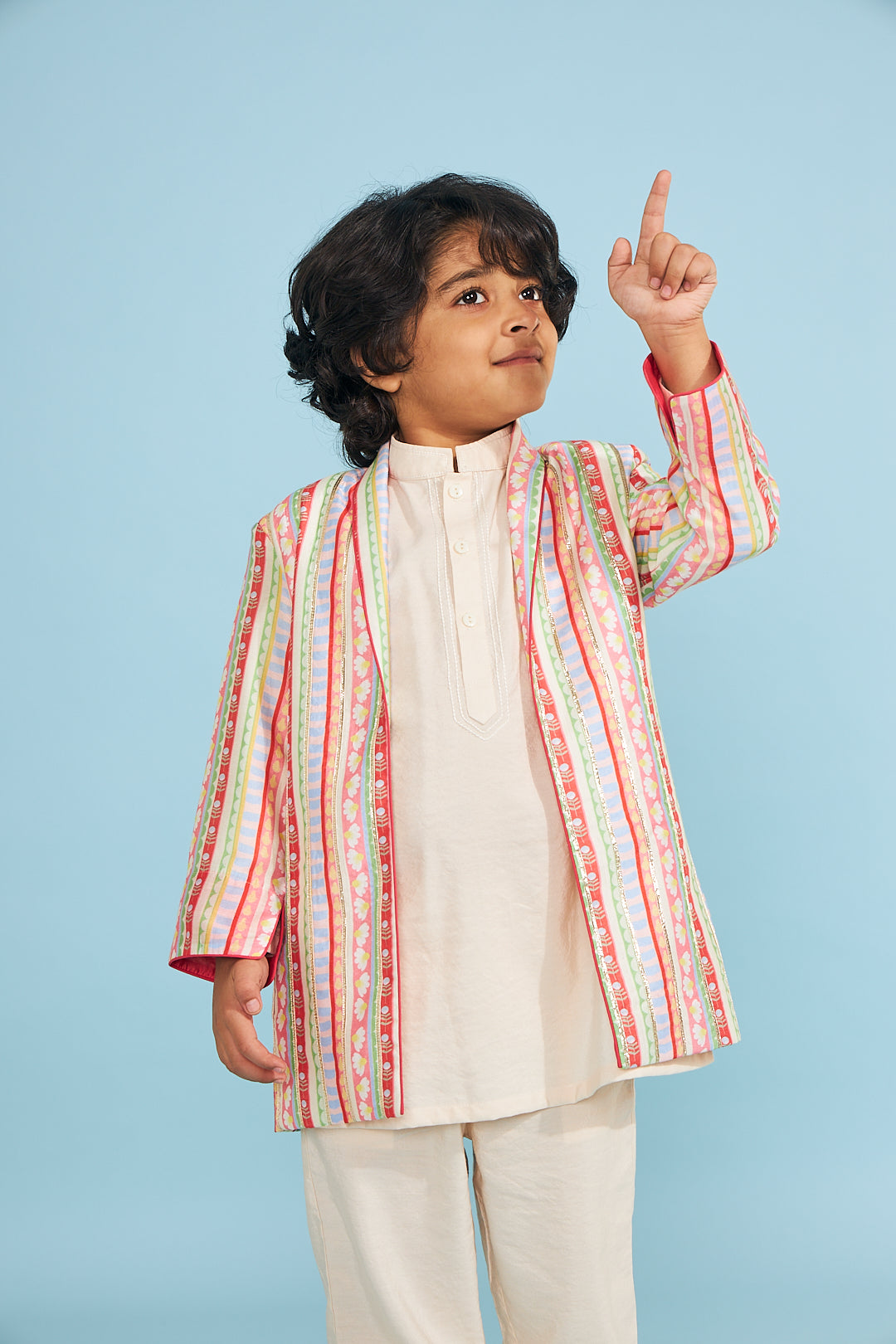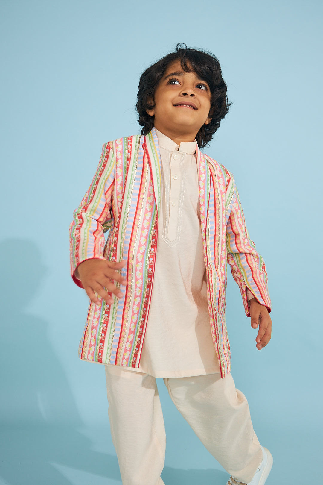 Candy Stripe Embellished Boys Jacket With Cream Kurta Trouser (3 Pc)