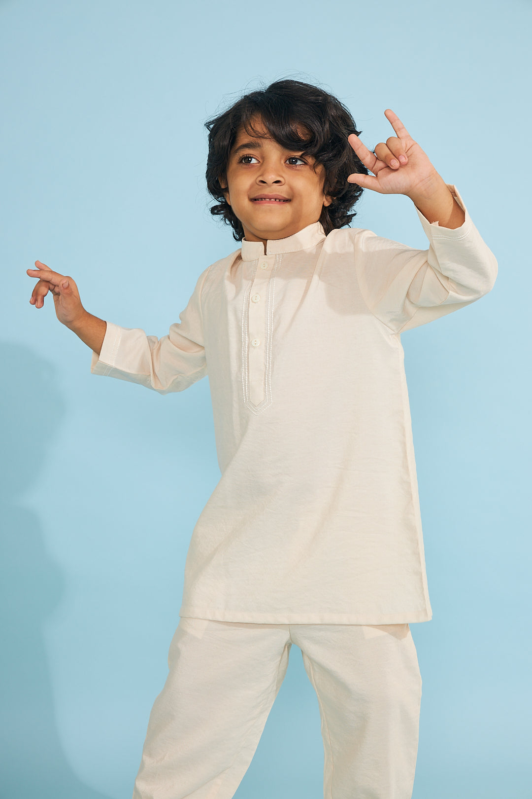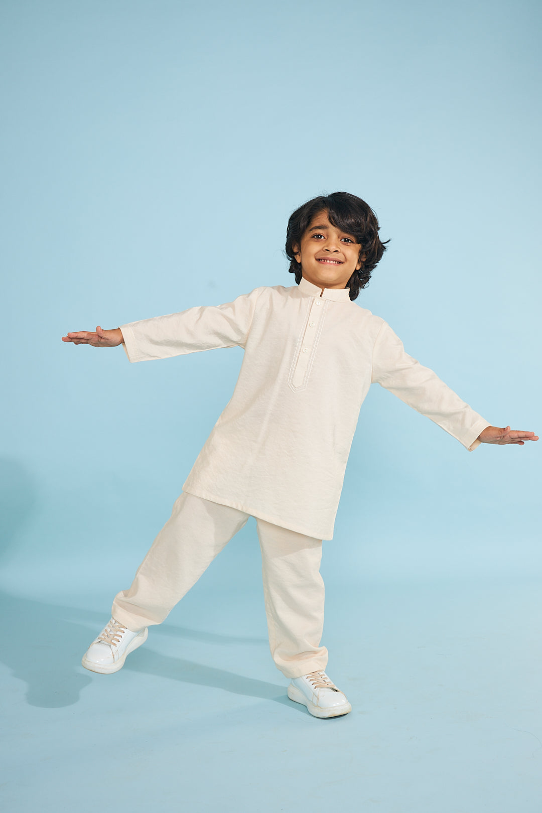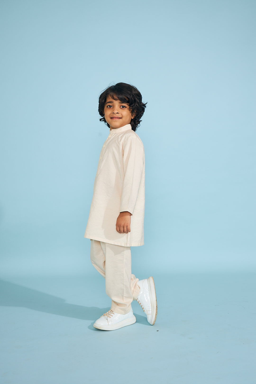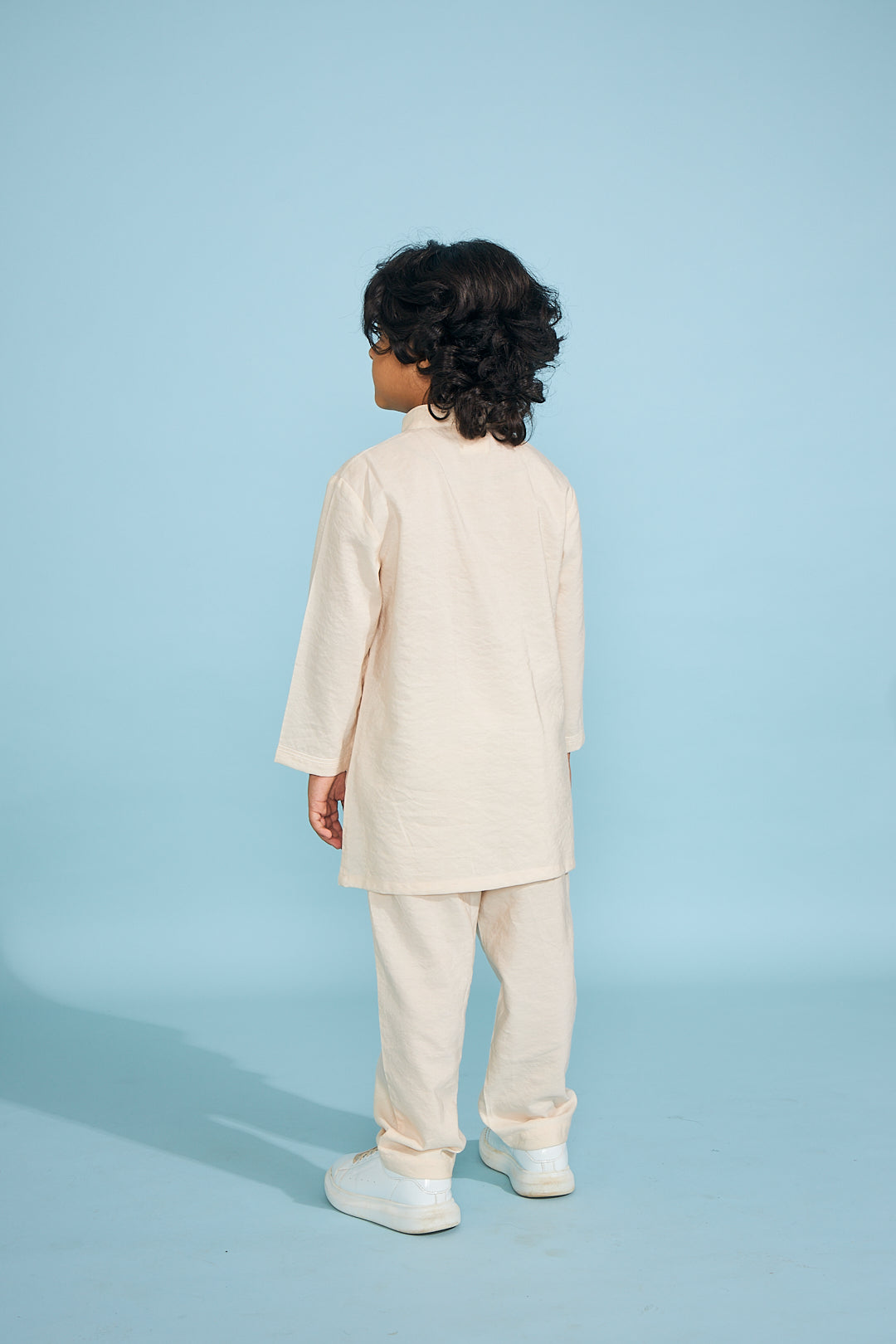 Step into the spotlight with the candy stripe embellished boys jacket with cream kurta! With sparkling mirror work and chic silver details, this kurta, jacket and trousers combo is perfect for adding a touch of glamour to any occasion.