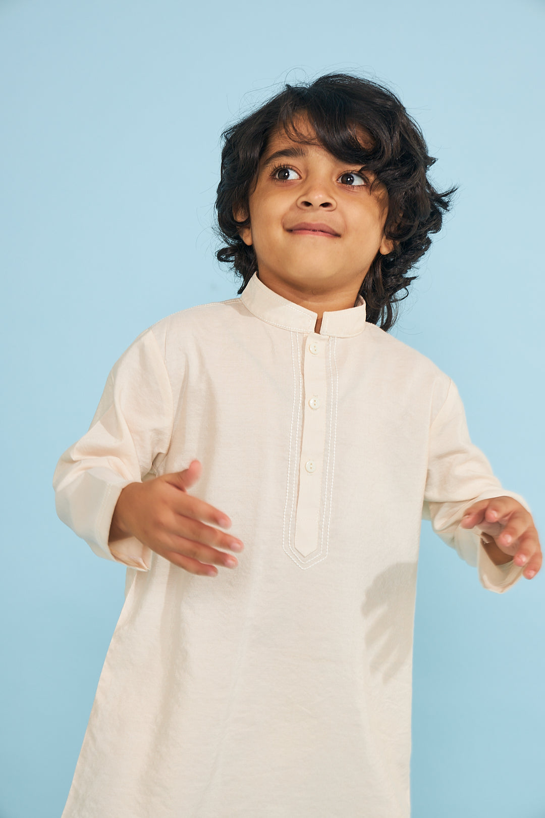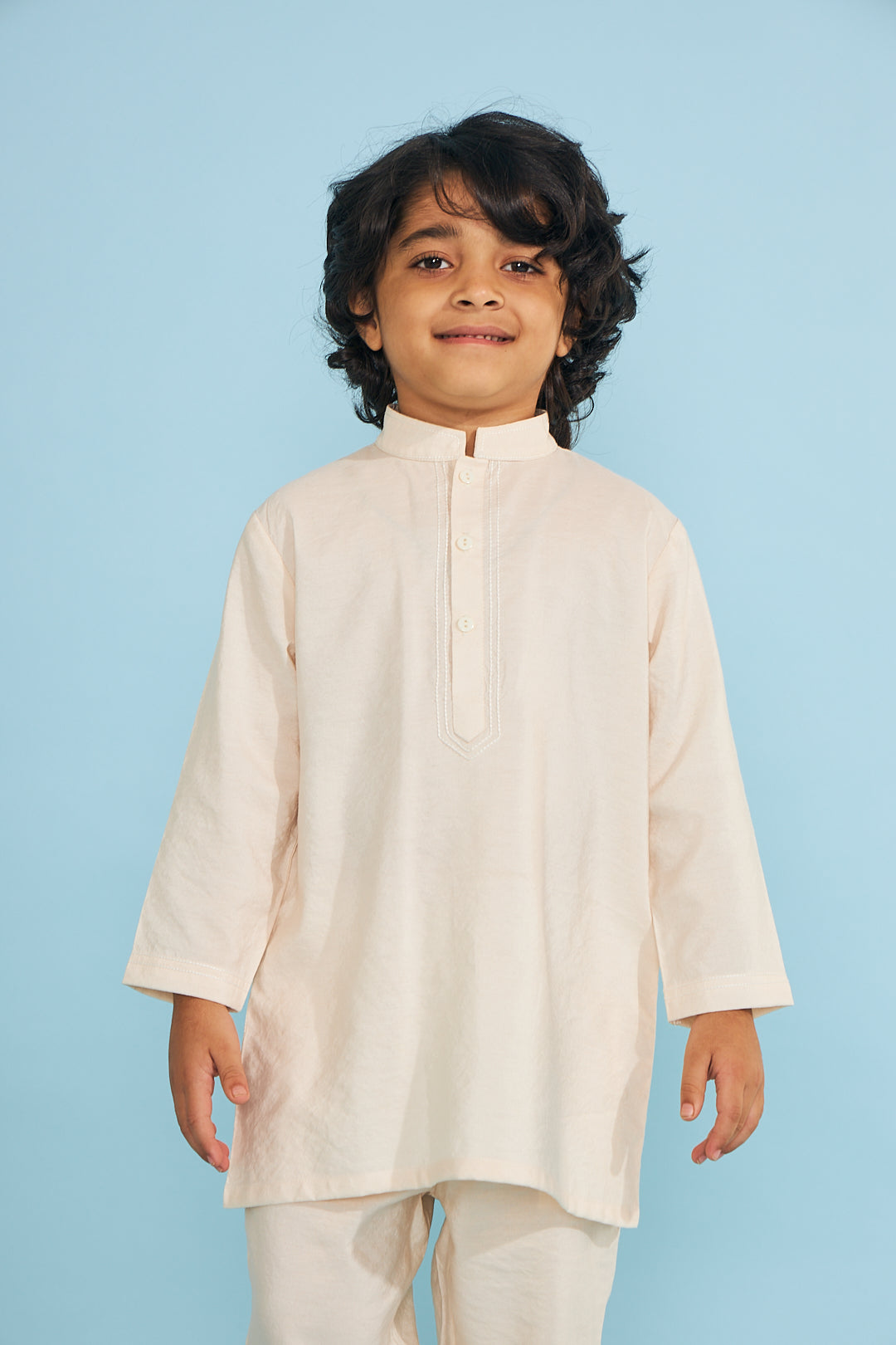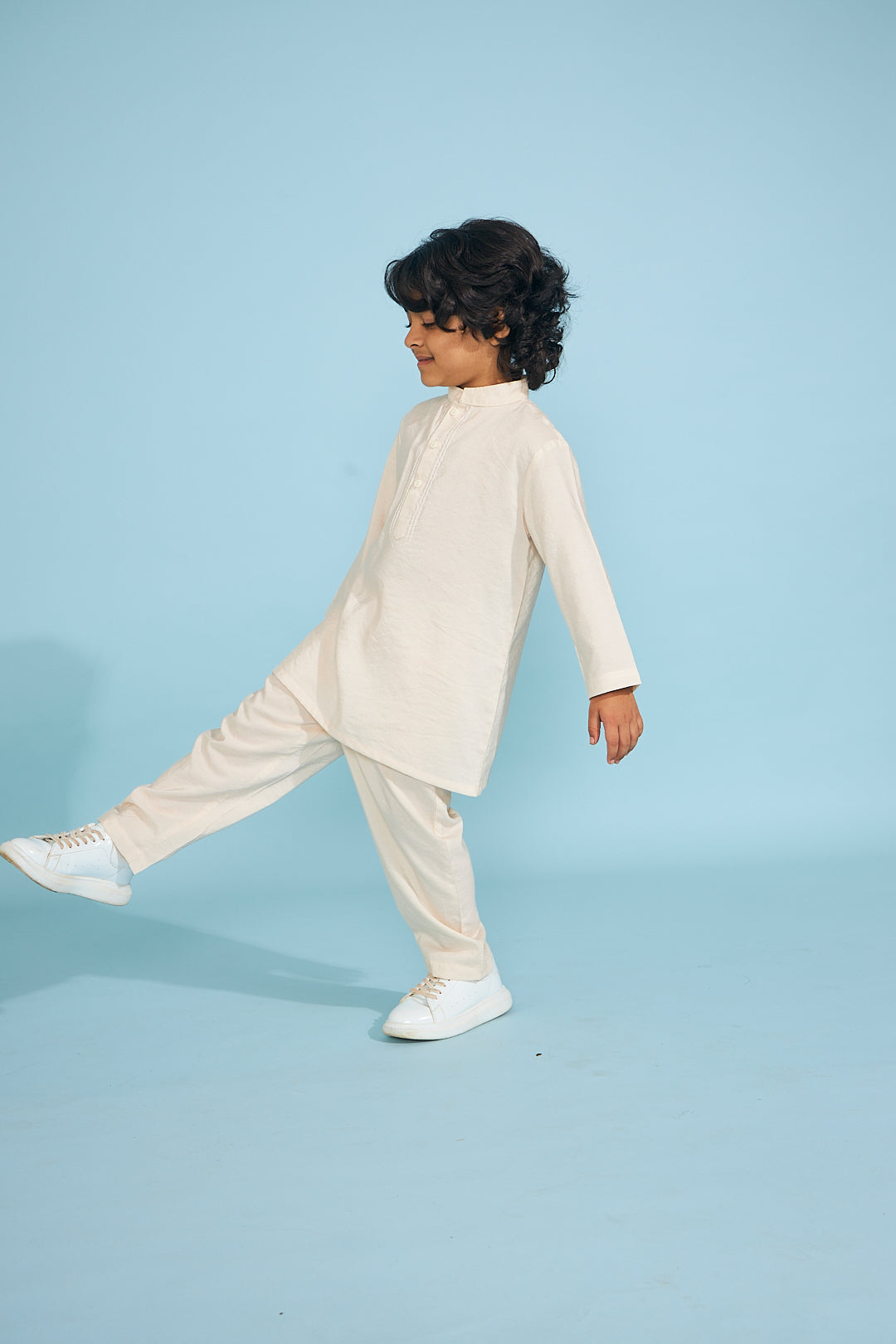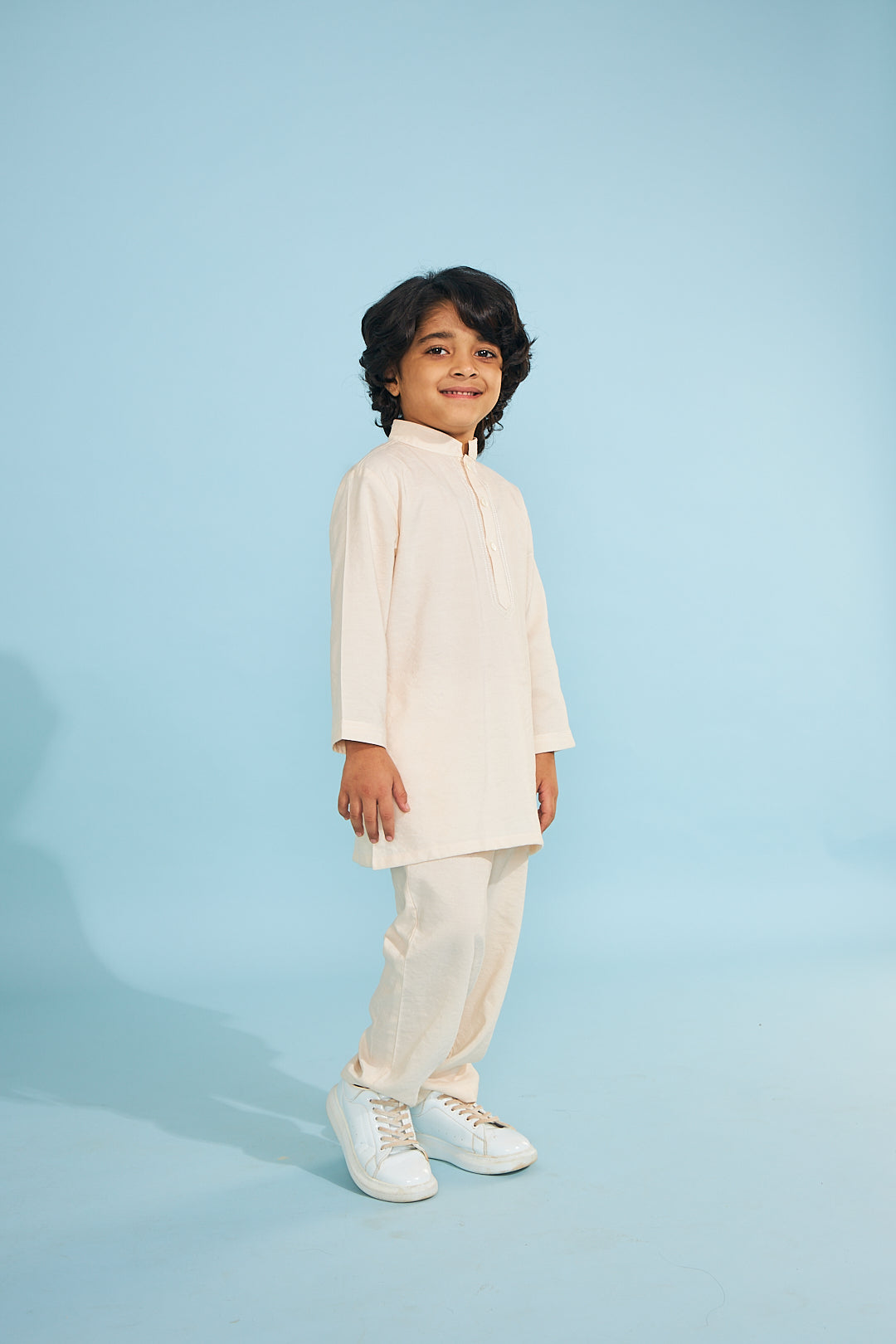 Step into the spotlight with the candy stripe embellished boys jacket with cream kurta! With sparkling mirror work and chic silver details, this kurta, jacket and trousers combo is perfect for adding a touch of glamour to any occasion.