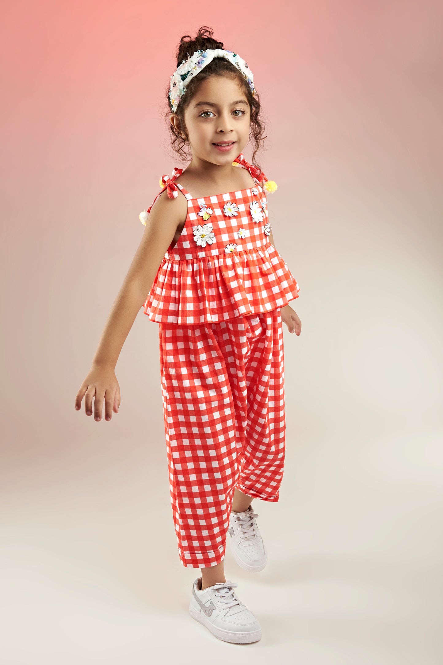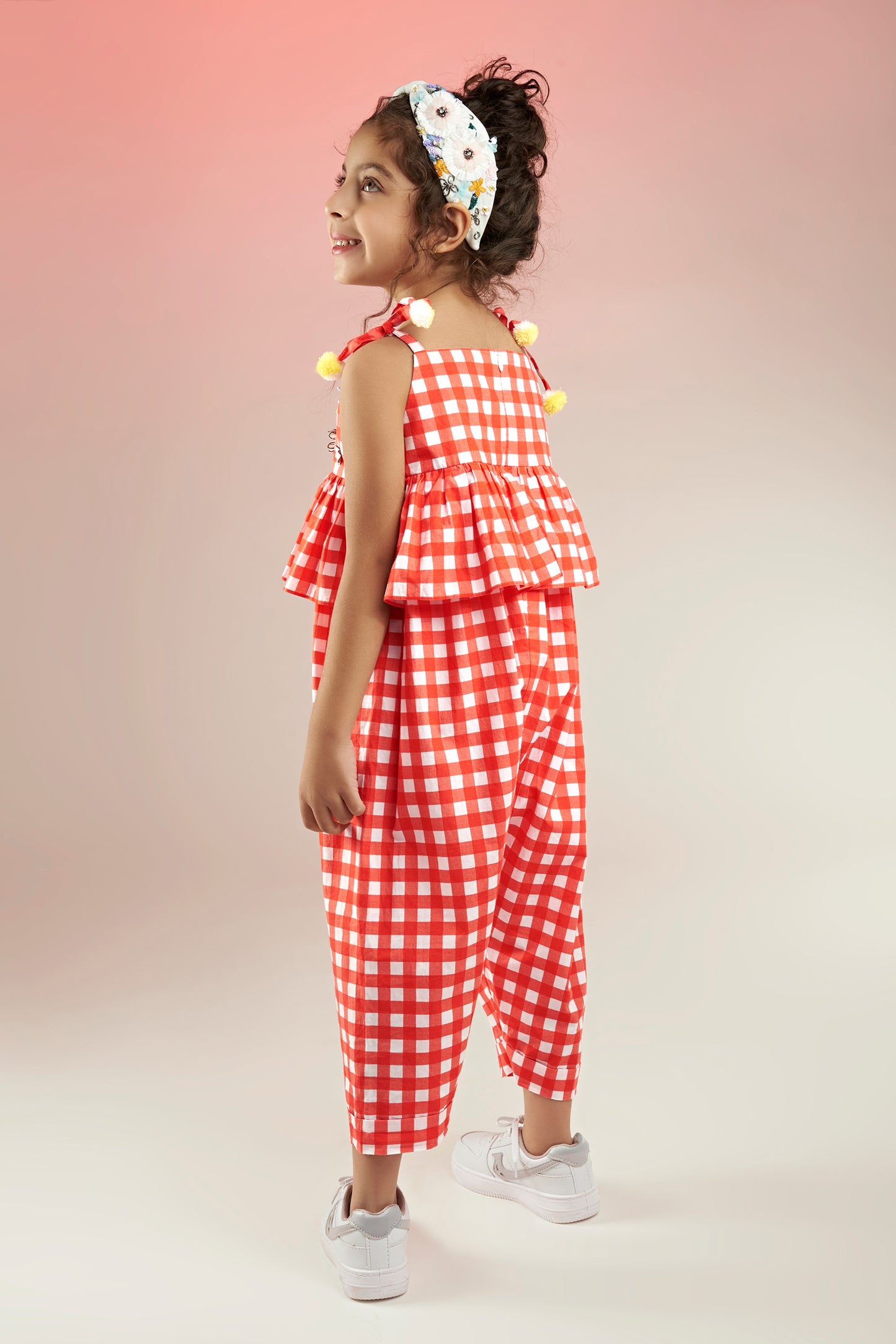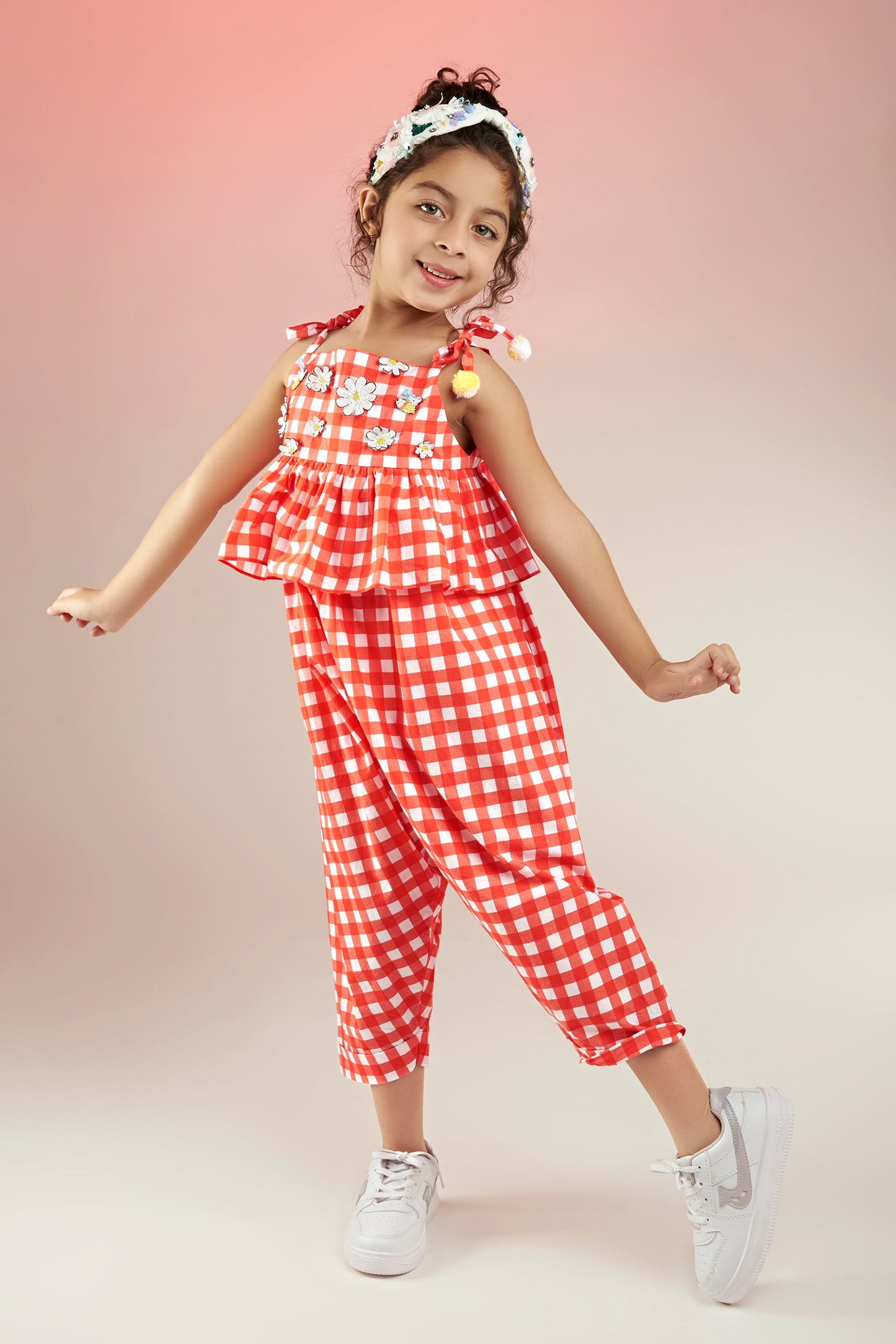 The airy jumpsuit with wide, full-length legs harmonizes fantastically with the straight, fitted top on thin, tied straps. 'Check' out the sequins 'daisies' decorated at the yoke with cute peplum at the waist. Super comfortable for park outings, and picnic fun times!