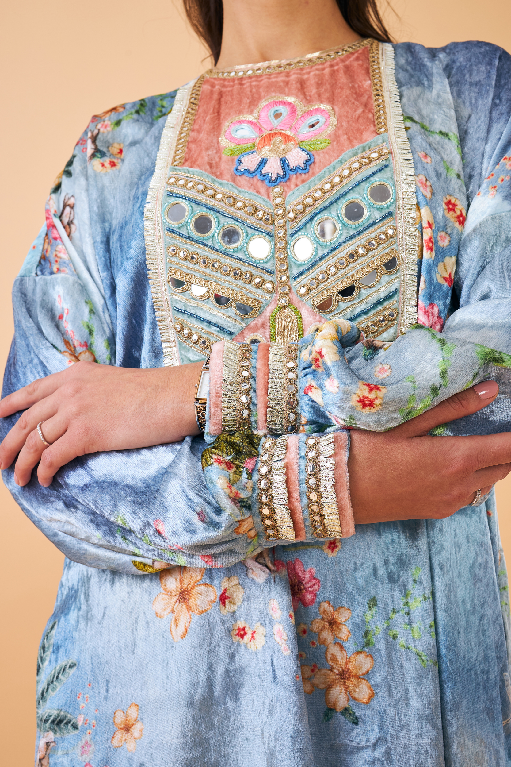 - Embroidered yoke on velvet with mirror, thread & sequin embellishment