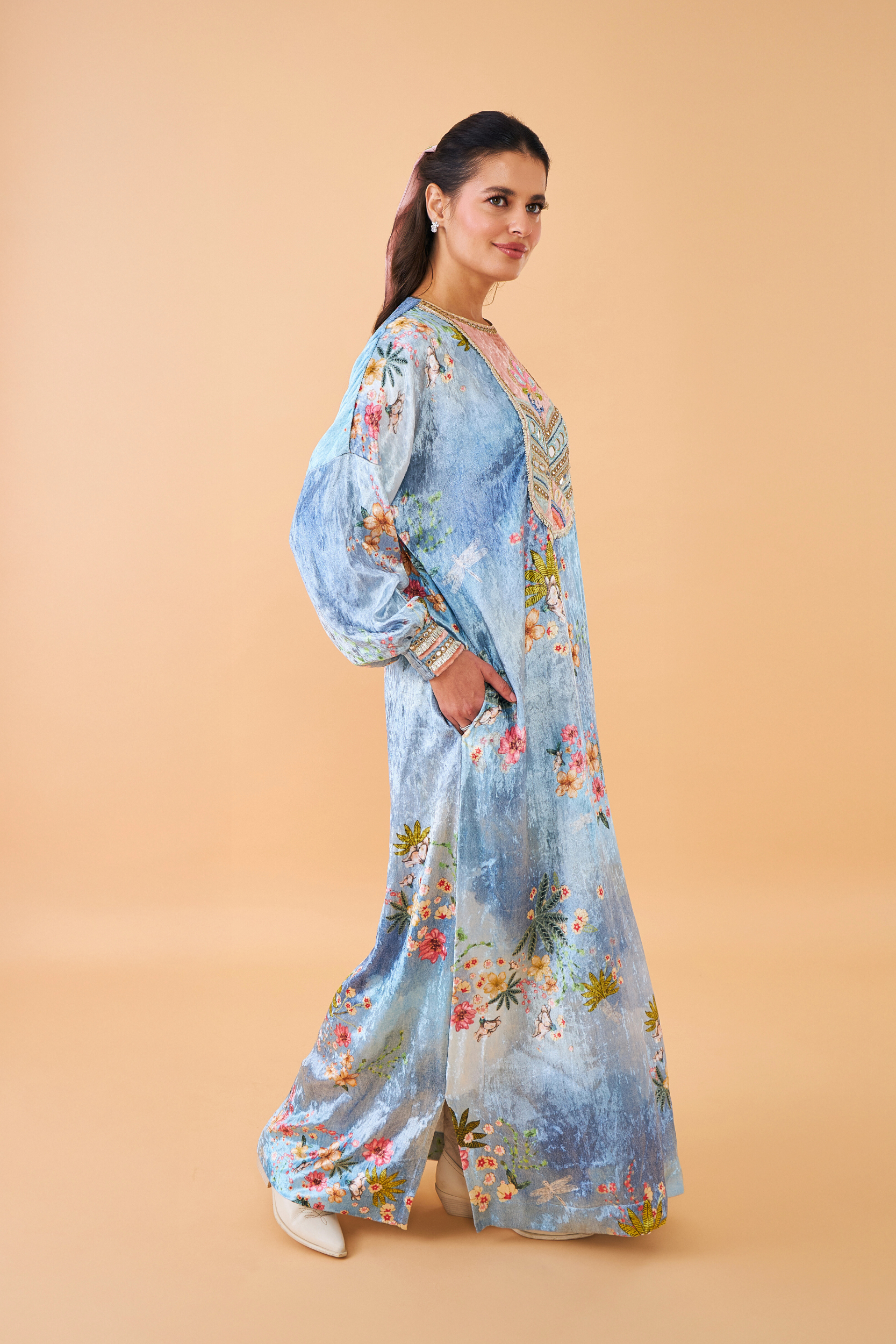 The Clea Blue Velvet Long Dress blends rich shades of blue with a beautifully rendered floral print, creating a look that feels both festive and refined. Crafted in soft velvet, the loose katan-style silhouette offers effortless comfort, while the intricately embroidered centre yoke adds a touch of elegance. Perfect for Festive gatherings, evening celebrations, and special family moments.