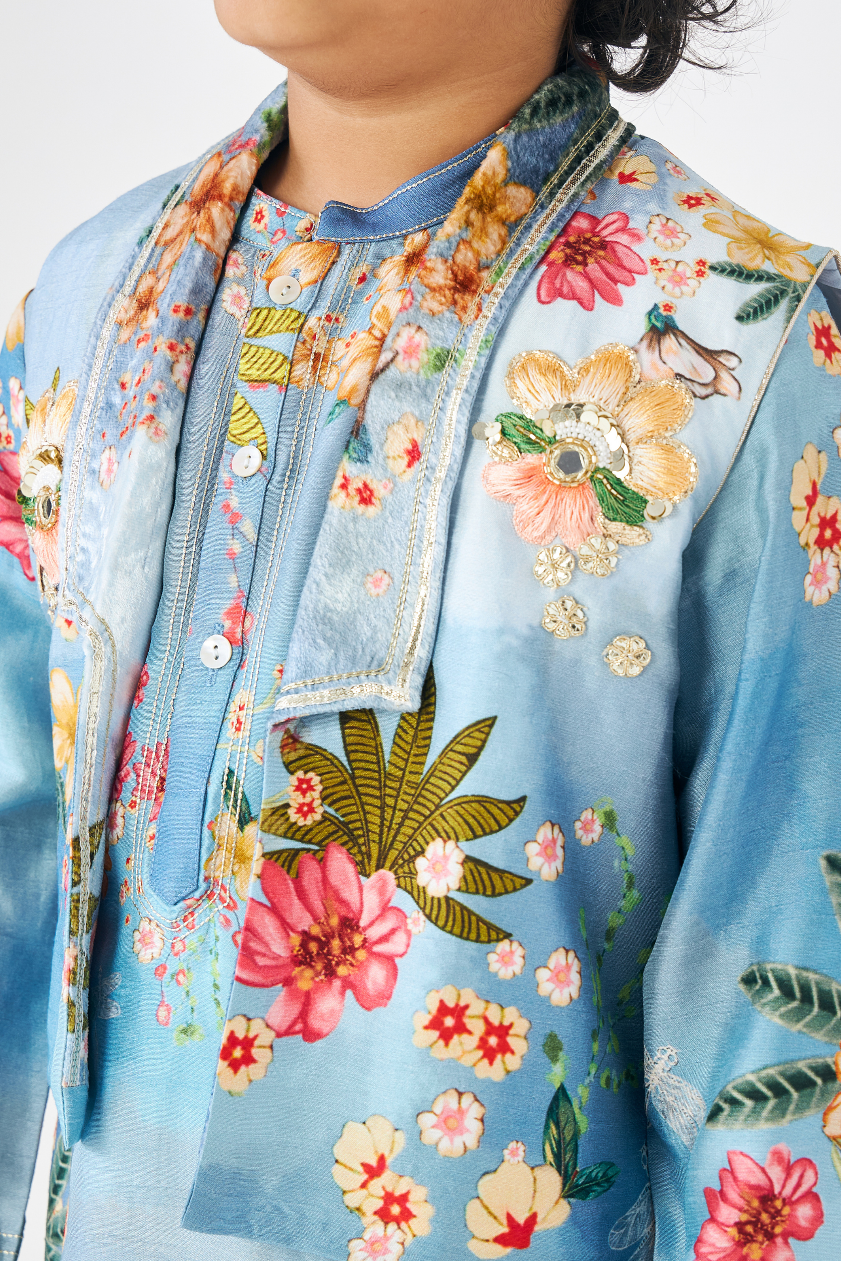 The Clea Boys Embellished Kurta, Pant & Bundi Jacket Set (3 Pcs) is a Festive Standout for Little Gentlemen. The Blue Floral Printed Kurta With Delicate Egold Detailing is Paired With Classic White Pants and Layered With a Rich Embroidered Vest Jacket Featuring Gold and Threadwork Embroidery. Stylish Yet Comfortable, This Set is Perfect for Weddings, Diwali, and Special Celebrations.
