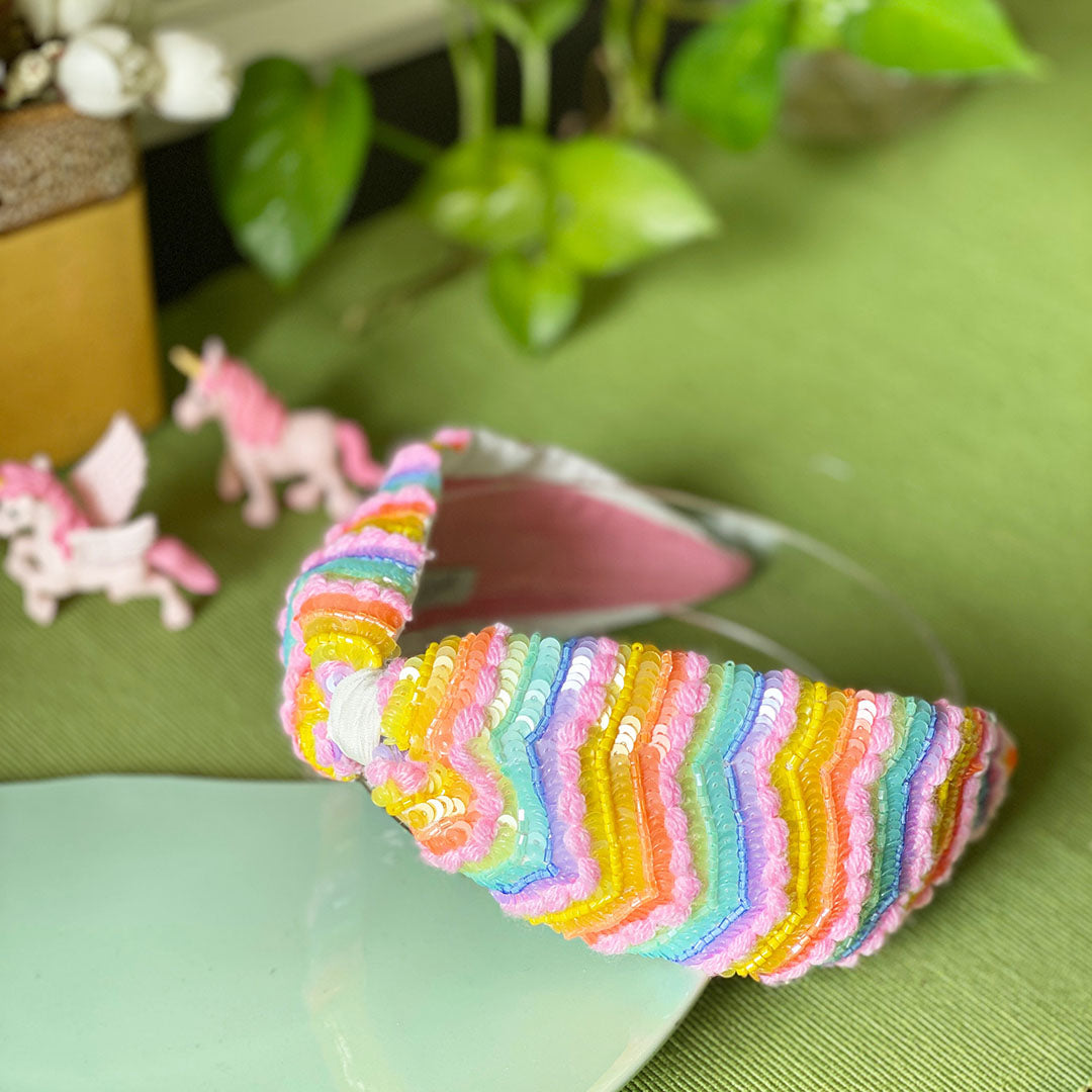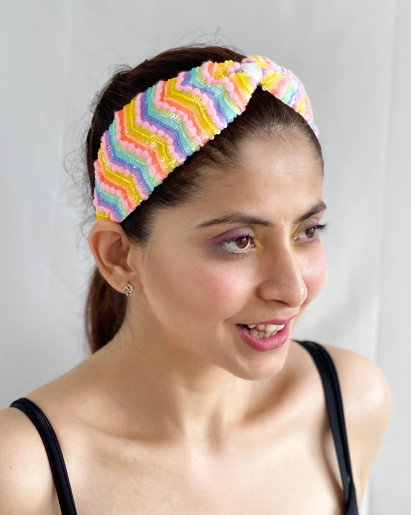 EVISSA is our highlight of pride month. Some might see it as a rainbow, or some might see it as unicorn and barbie inspired Or candies inspired , we are sure of it winning many hearts. Translucent colored sequins are placed aesthetically placed separating them with bugle beads and wool thread. Evissa can add bling to any outfit on any occasion, you can team it with your indo fusions, or beach outfit or westerns. Easy to pull off on any thing to everything.
