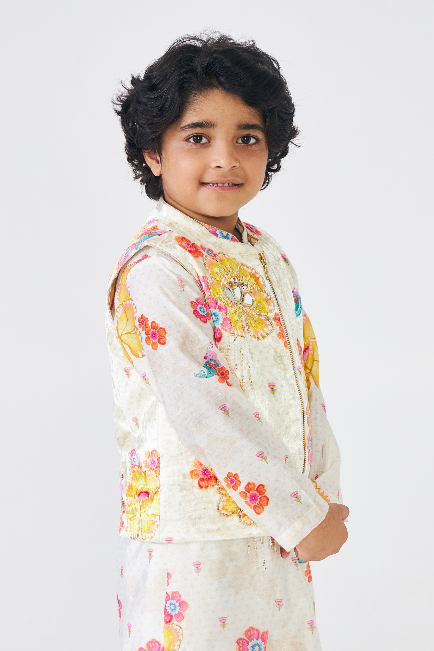 The Freya Mustard Boys Embellished Kurta, Pant & Bundi Jacket Set (3 Pcs) is a Festive Standout for Little Gentlemen. The Mustard Floral Printed Kurta With Delicate Embellishments is Paired With Classic White Pants and Layered With a Rich Velvet Bundi Jacket Featuring Fine Embroidery. Stylish Yet Comfortable, This Set is Perfect for Weddings, Diwali, and Special Celebrations.