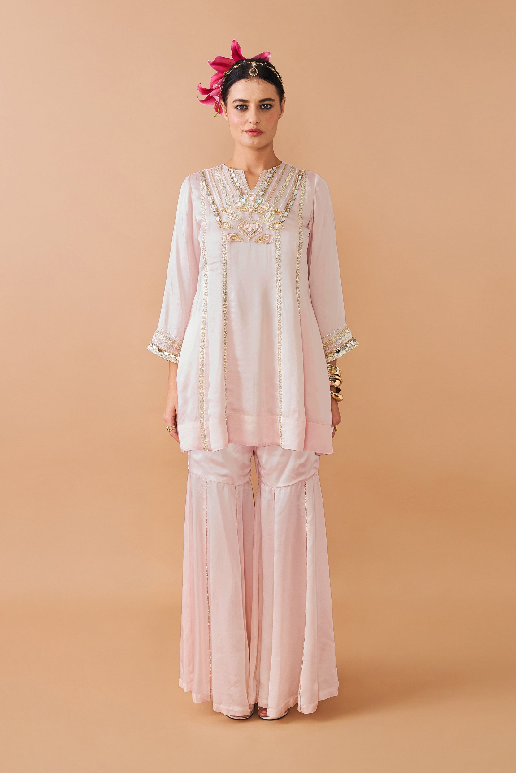 The Ivora Embellished Tunic with Flared Trousers Co-ord is an elegant soft pink ensemble designed for timeless sophistication. The tunic features delicate threadwork, dori, mirrorwork, pitta, and cutdana embellishment, with flowing kalis/panels highlighted by floral gota insertions for added texture. Flared 3/4th sleeves with detailed hems complete the graceful silhouette, while the soft construction and full lining ensure comfort. Paired with solid fitted trousers that flare from below the knee, half-lined and elasticated at the back, this co-ord balances artisanal craft with a modern, flattering fit. Perfect for festivities, evening occasions, and elegant celebrations.