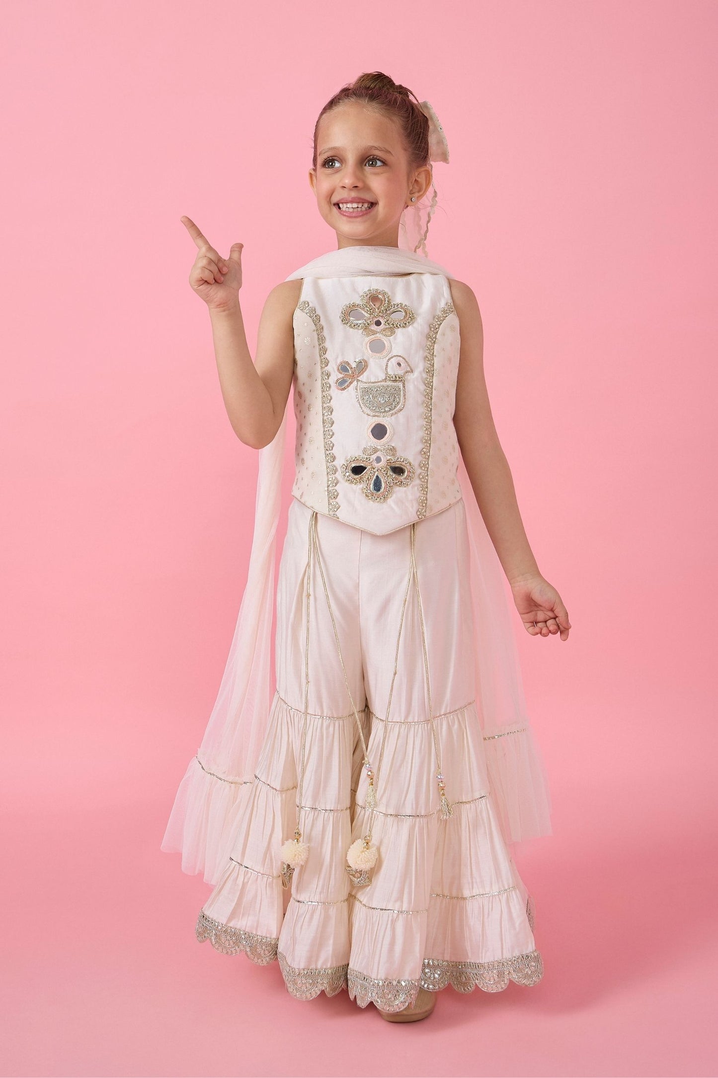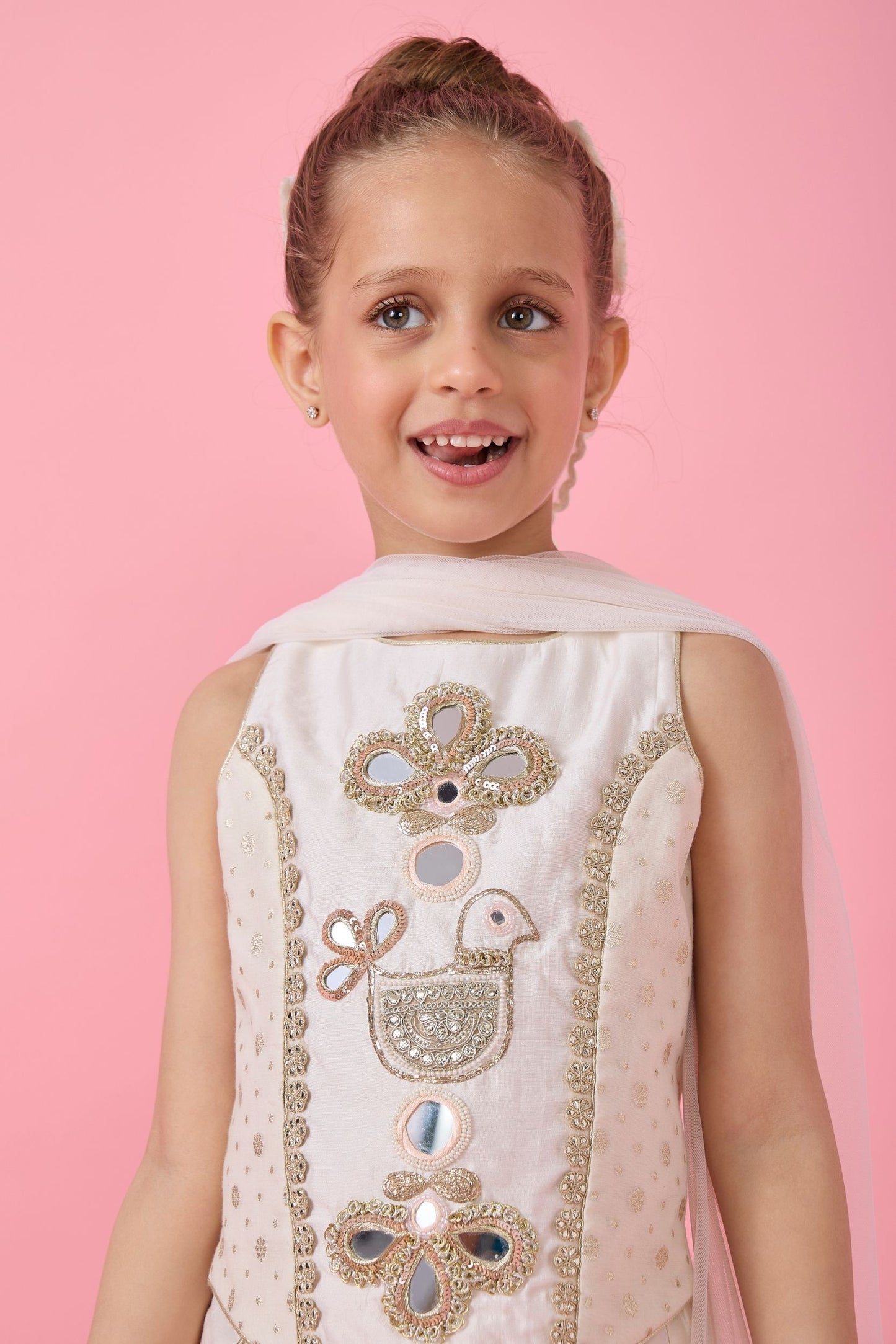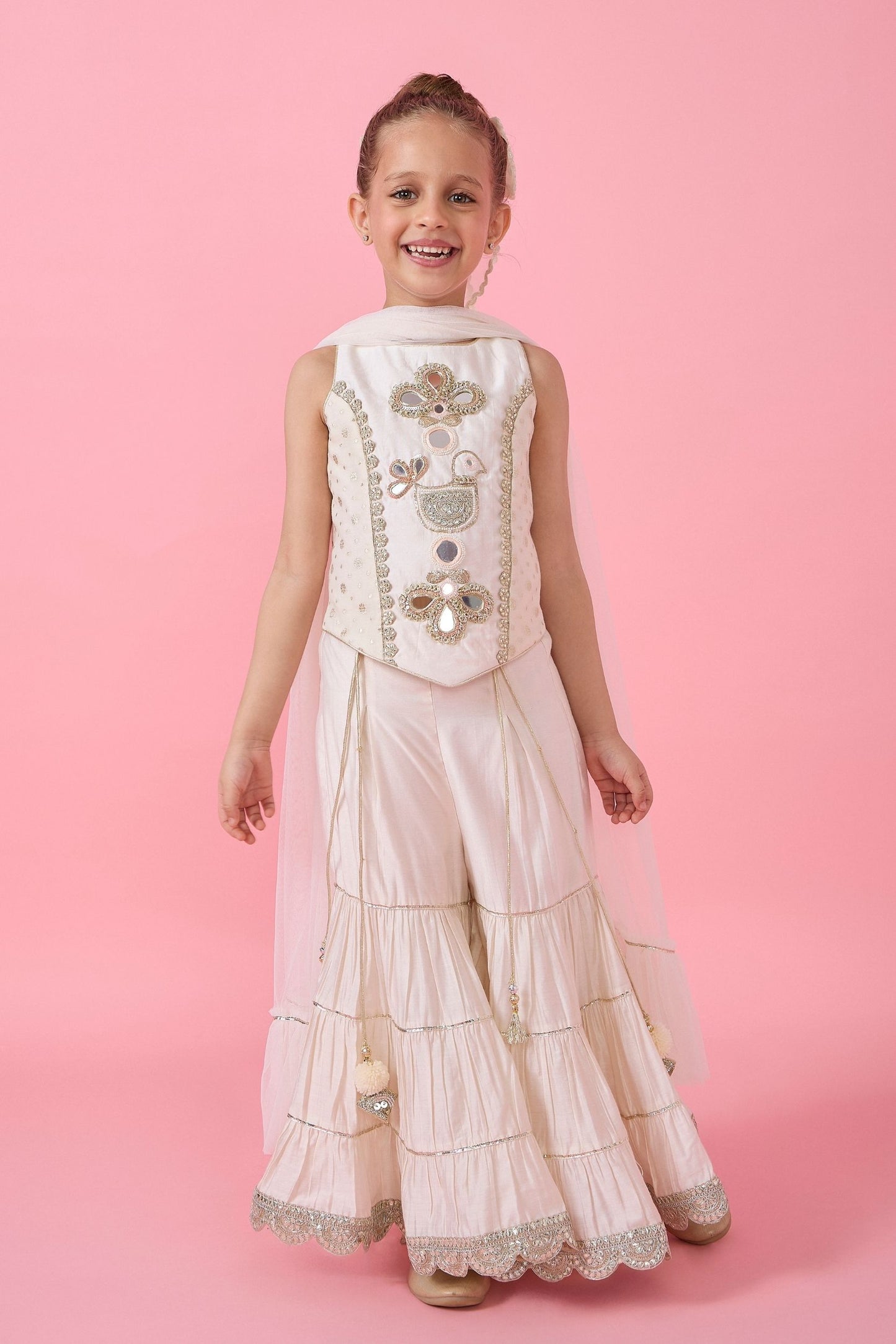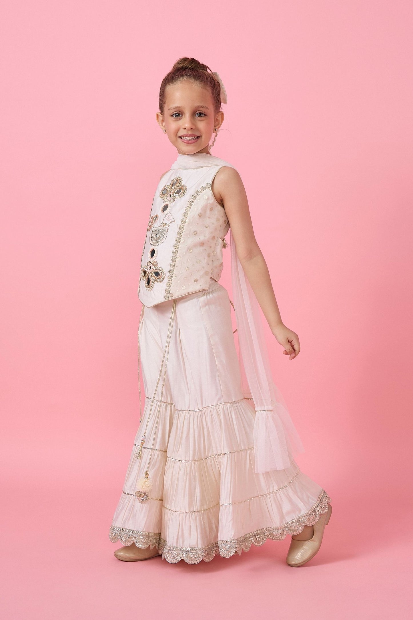 Ivory Long Embroidered Girls Top & Flared pant Set (Set Of Three)