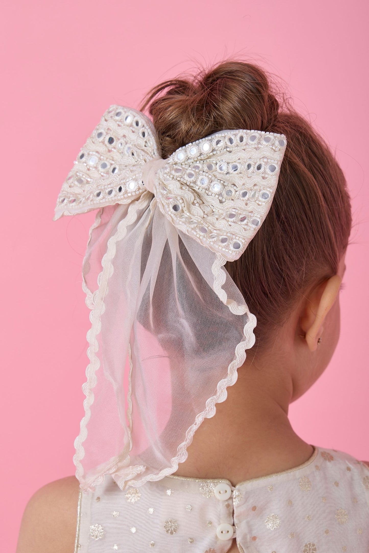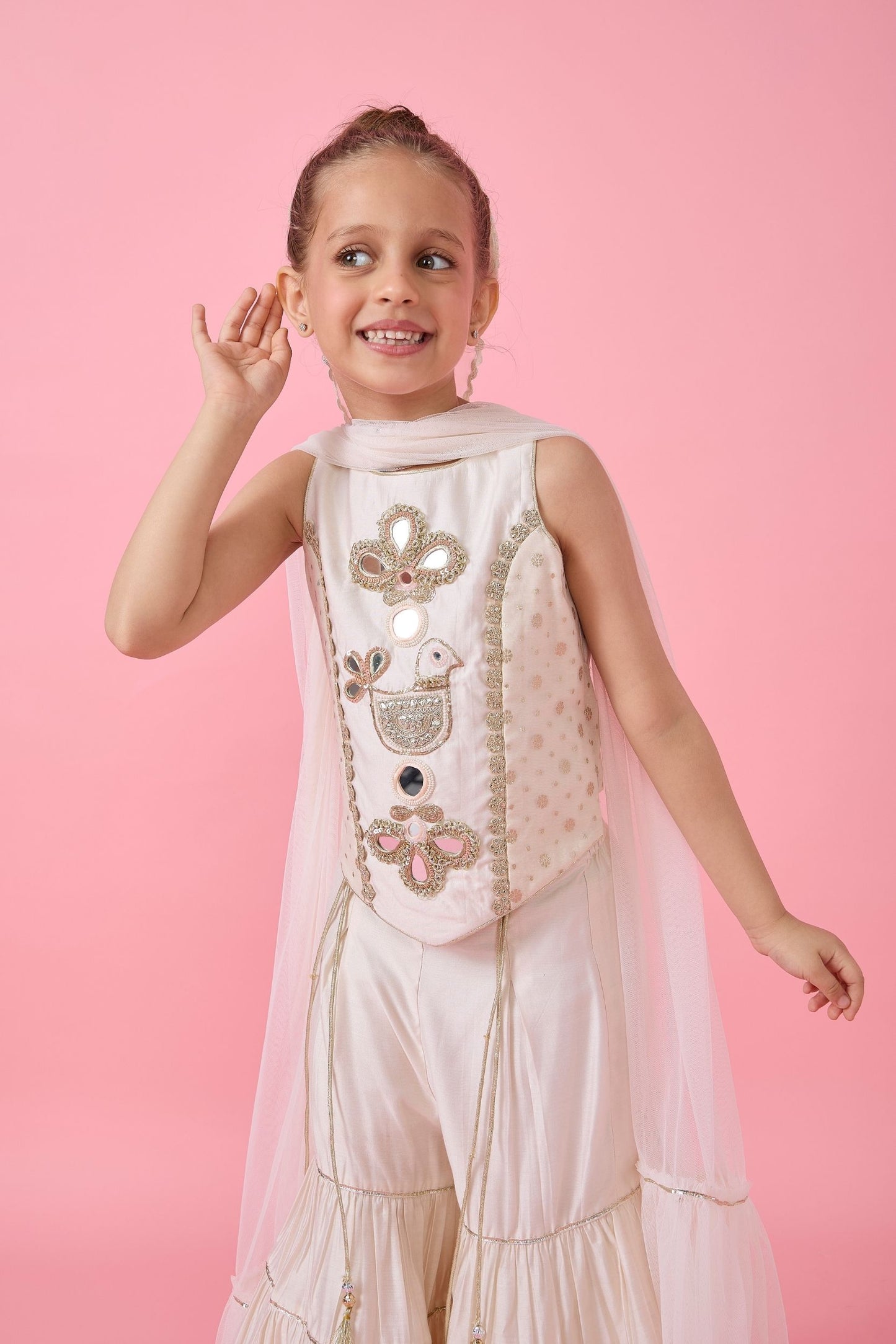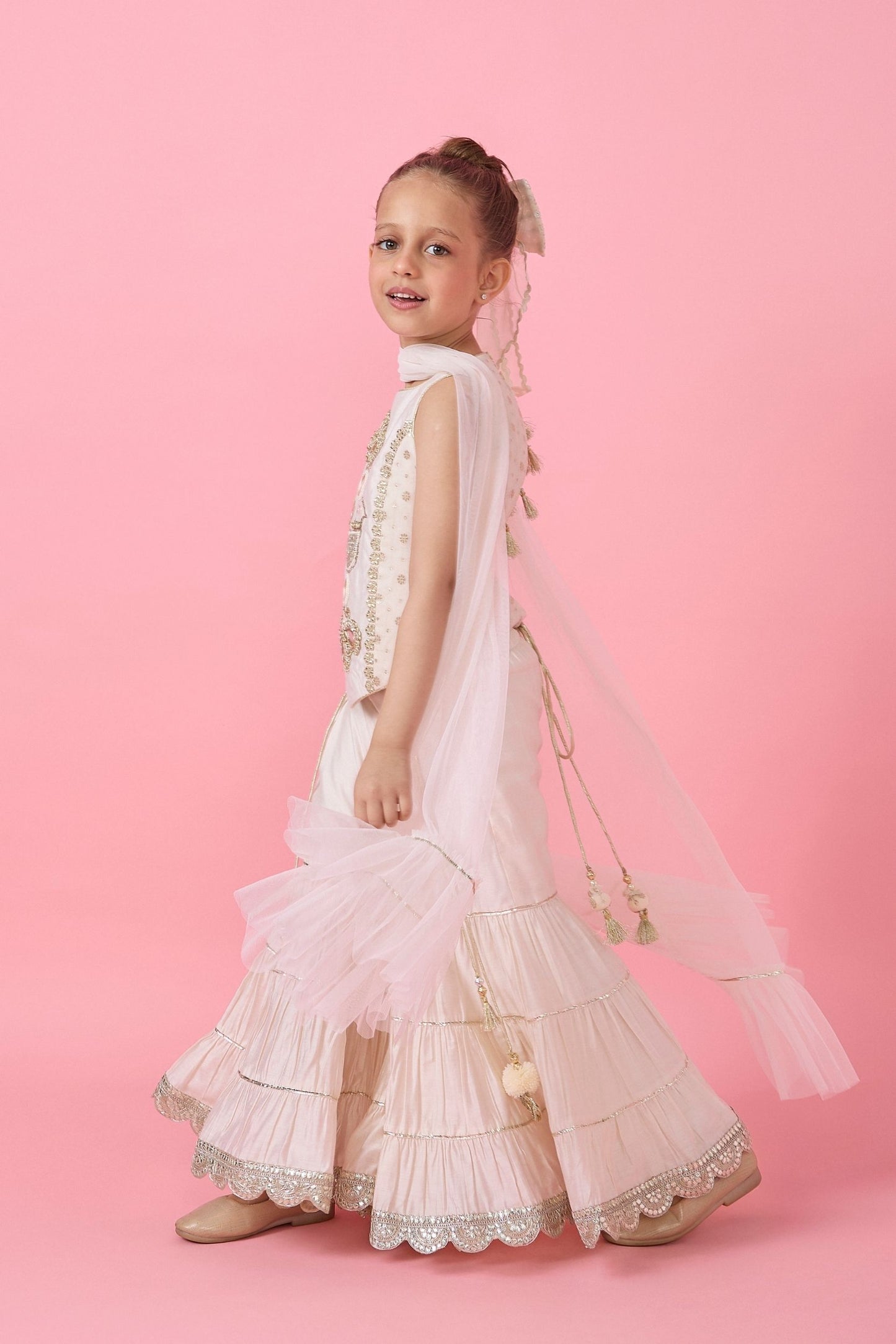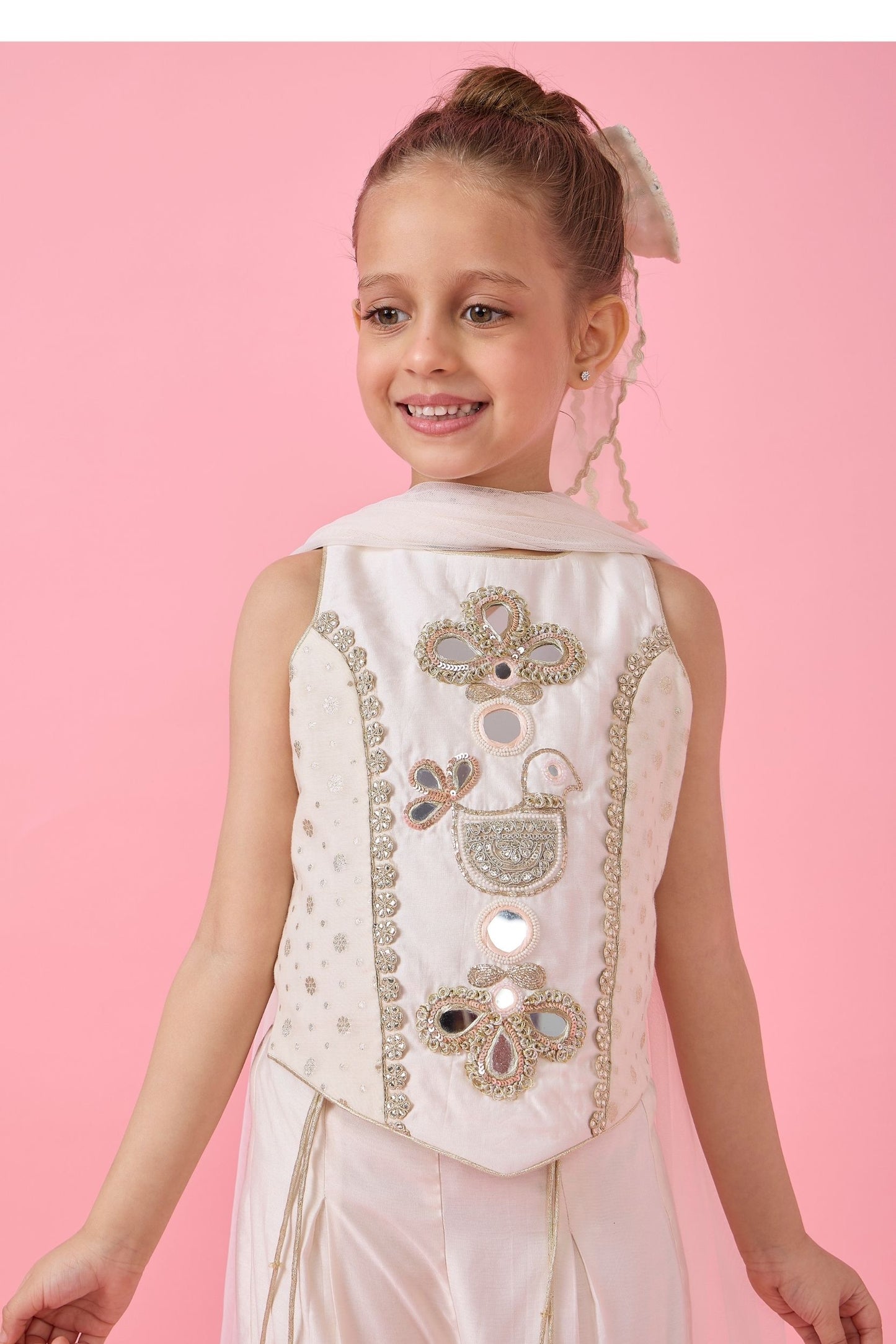 Ivory Long Embroidered Girls Top & Flared pant Set (Set Of Three)