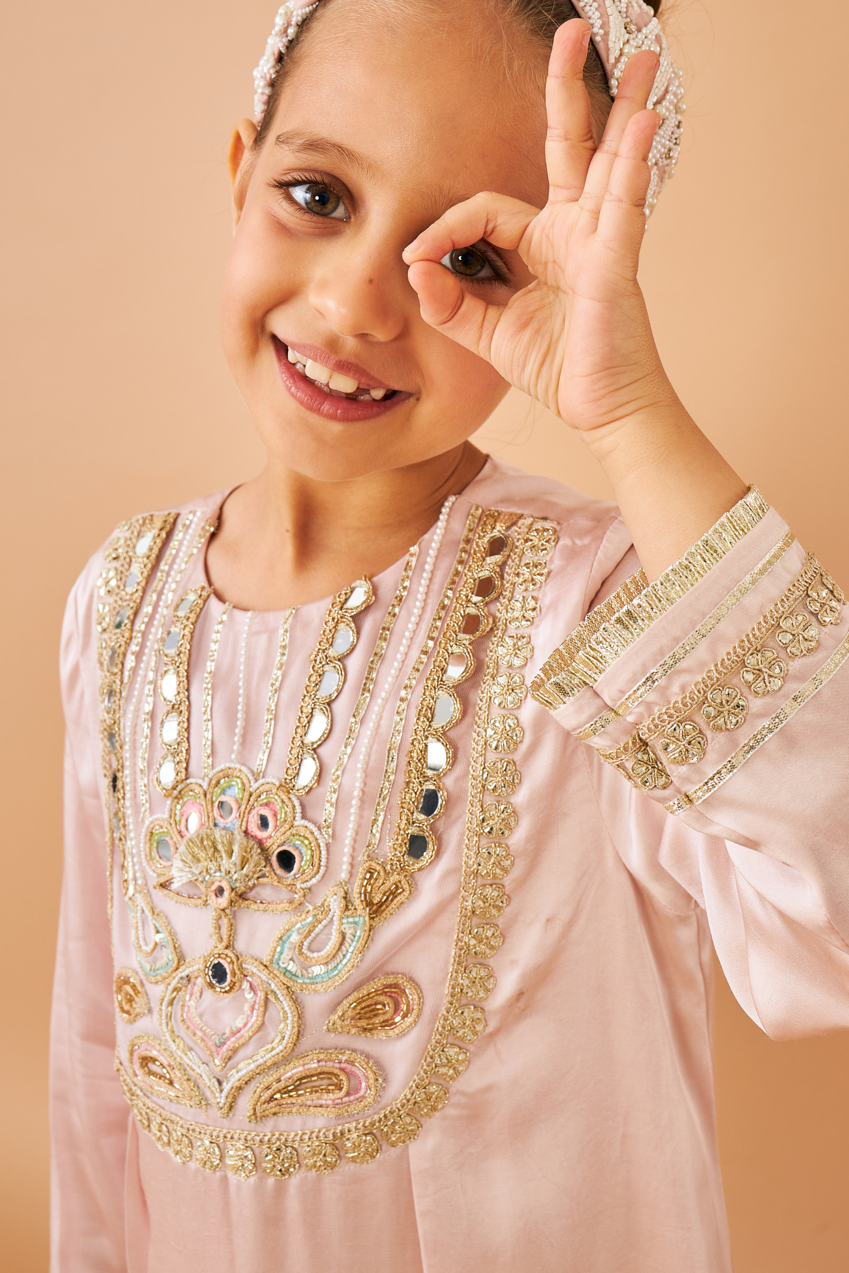 The Lavora Girls Long Dress is crafted in soft pink Bemberg satin that drapes with an elegant, gentle sheen. Its front yoke is beautifully embroidered with gold threads and delicate pearls, complemented by embellished cuffs for a refined finish. With an elasticated back that softly cinches the waist, this dress feels both graceful and comfortable—perfect for Festive gatherings, festive evenings and special family celebrations.