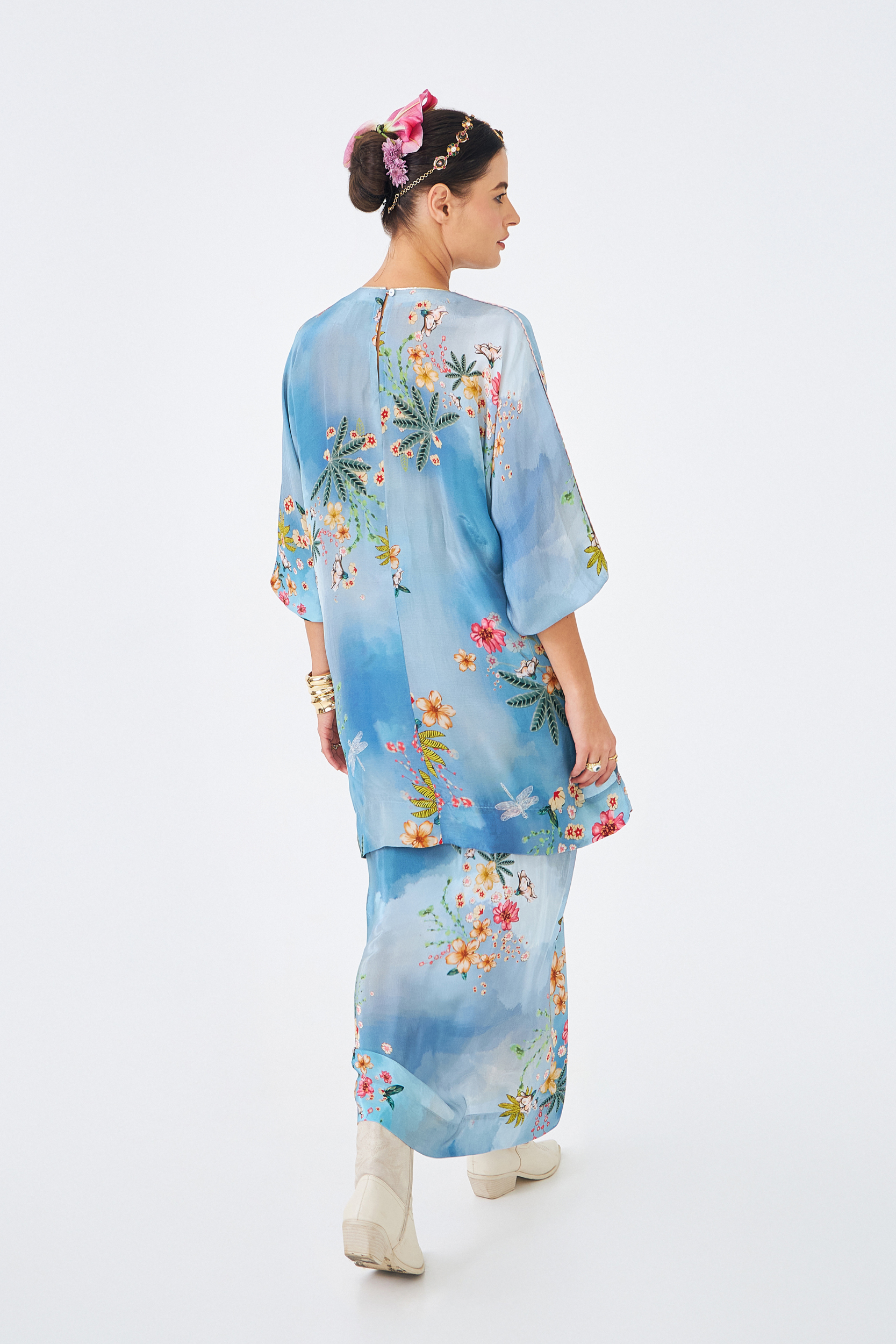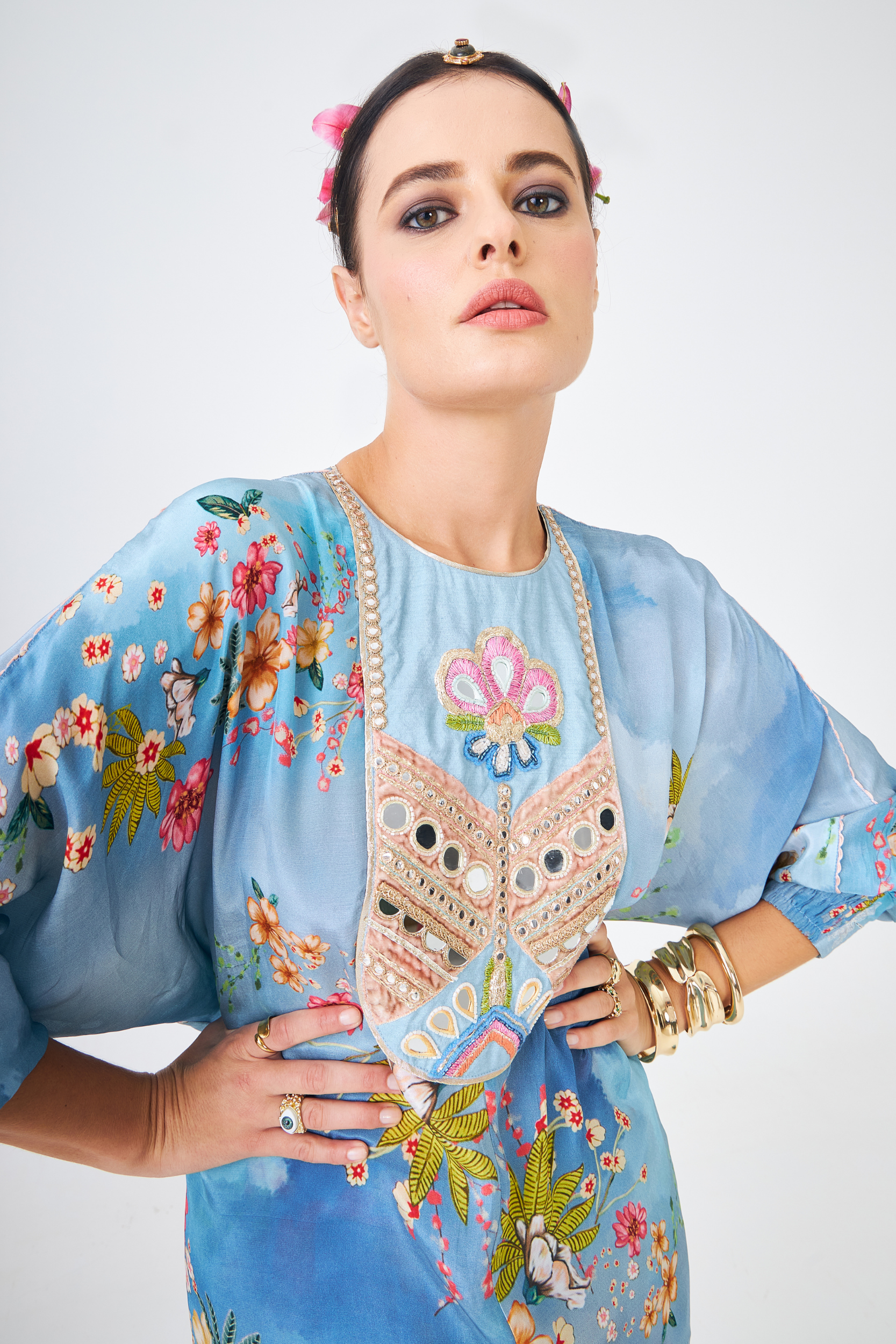 The Clea Print Kaftan Tunic With Draped Skirt is an Effortless Blend of Comfort and Couture. Crafted in Our Signature Blue Watercolour Floral Print, This Easy-breezy Silhouette Exudes Modern Elegance With Its Relaxed Kaftan Fit and Fluid Draping. The Tunic Features an Intricately Embroidered Long Yoke, Detailed With Gold Pitta, Delicate Threadwork, Mirror Embellishments, and Plush Velvet Appliqué—adding Richness and Texture to the Look. Paired With a Draped Skirt Designed With a Broad Belt and Side Zip for Ease, the Ensemble is Both Striking and Versatile. Perfect for Parties, Galas, Festive Soirées, or Intimate Celebrations, It Embodies Contemporary Glamour While Staying Rooted in Artisanal Craft.