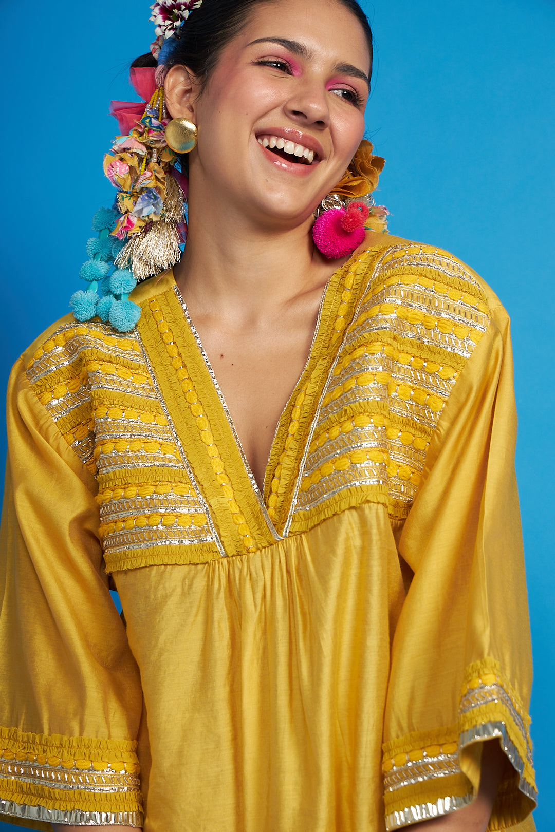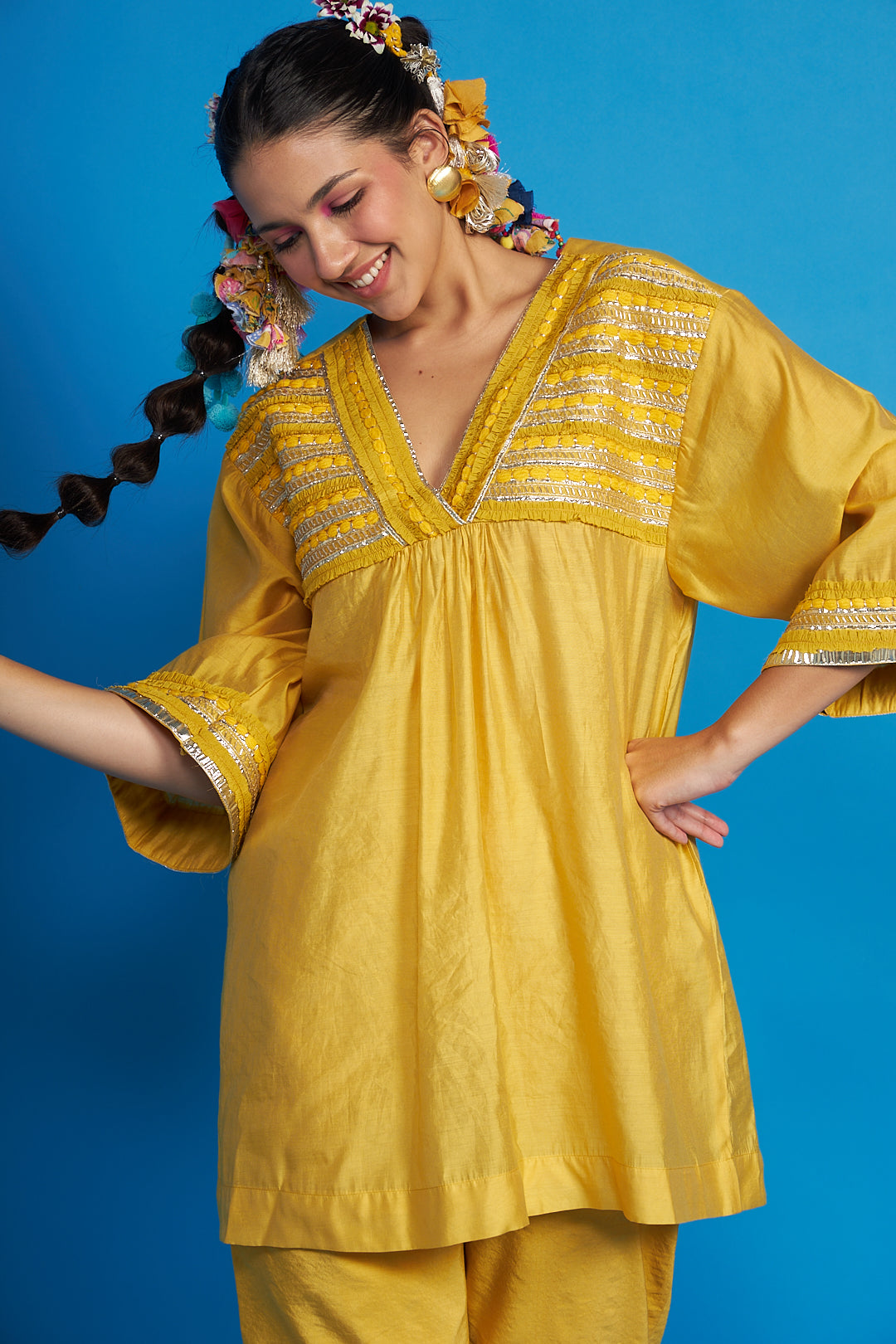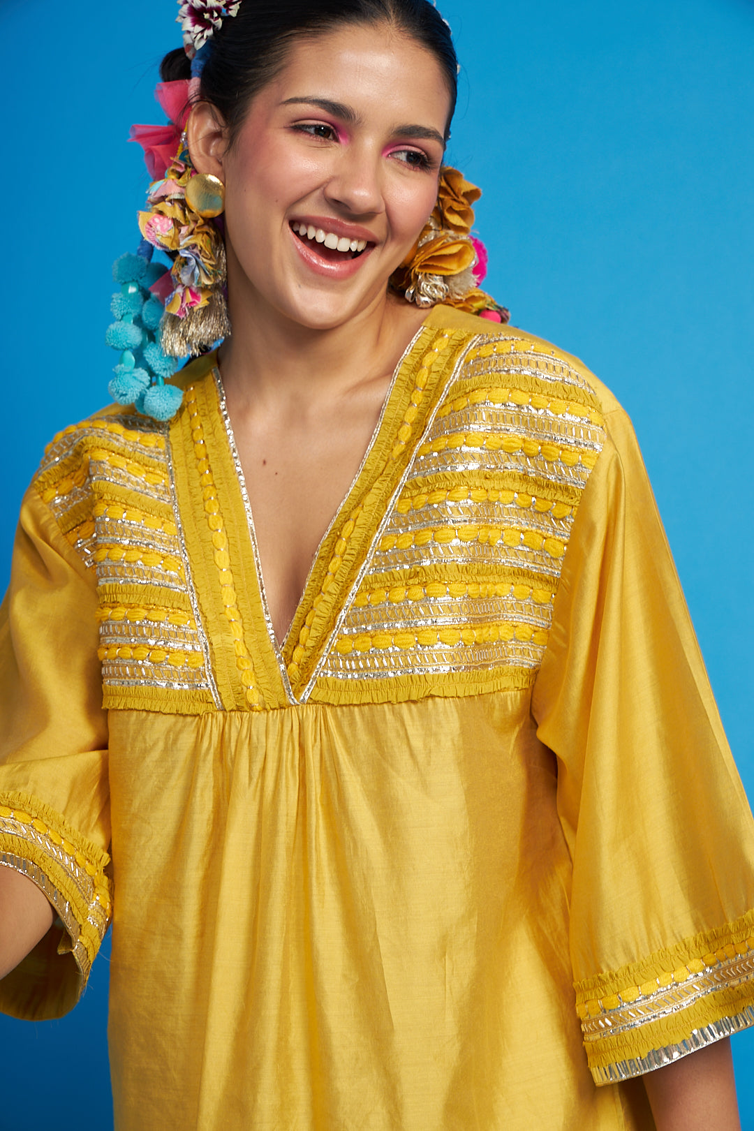 - Front yoke and neckline is hand embroidered with ruffled trims, bugle pipes and our signature yarns emb.