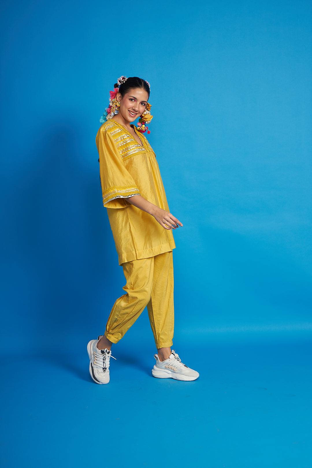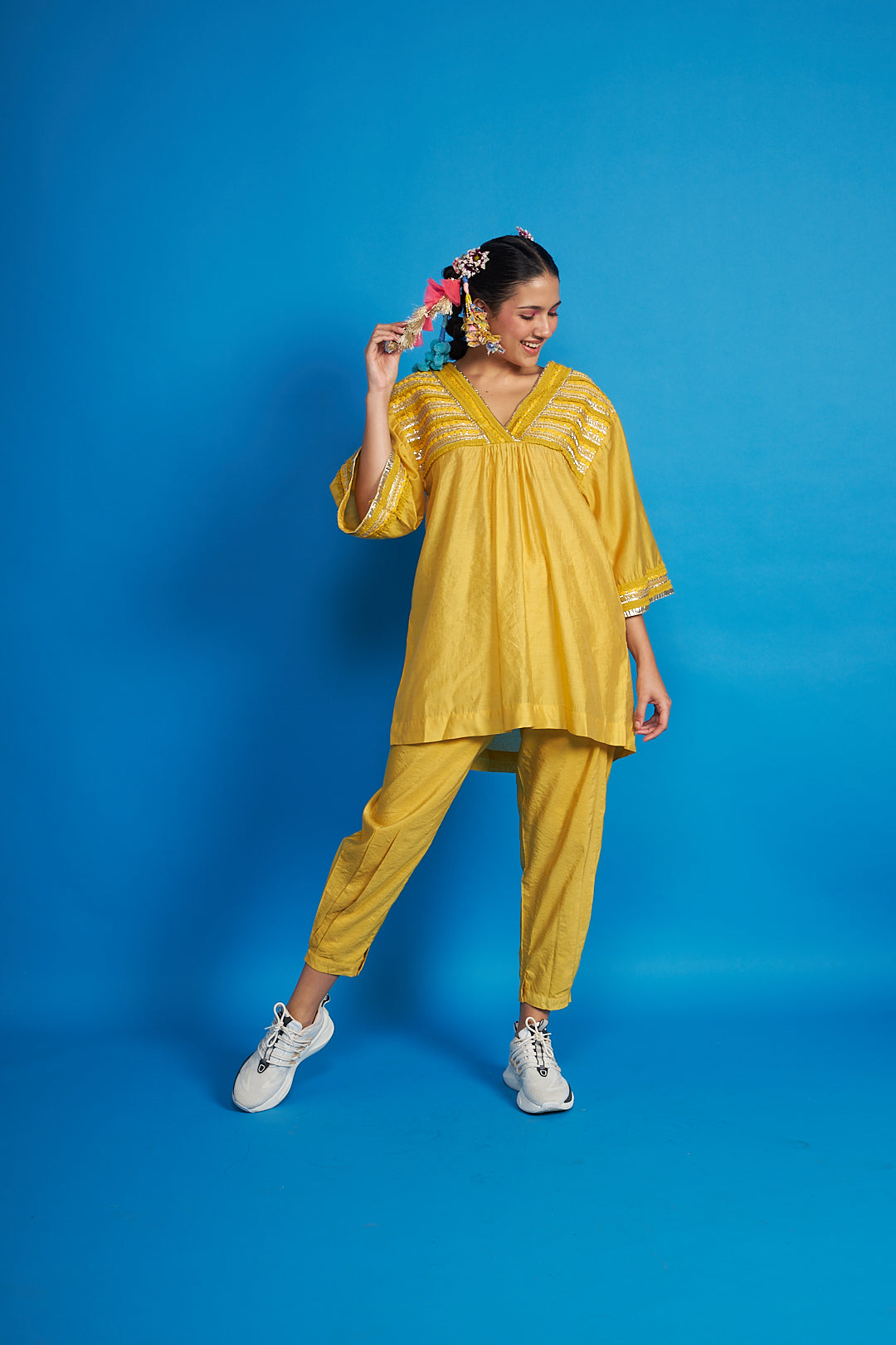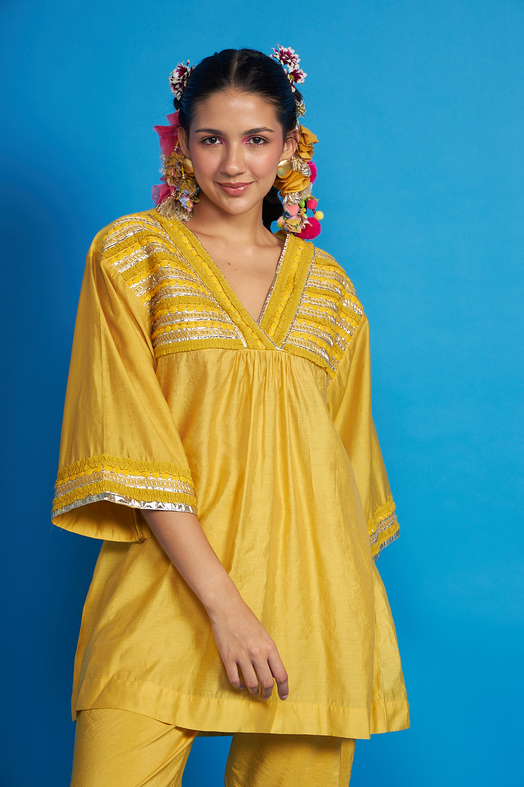 - Front yoke and neckline is hand embroidered with ruffled trims, bugle pipes and our signature yarns emb.
