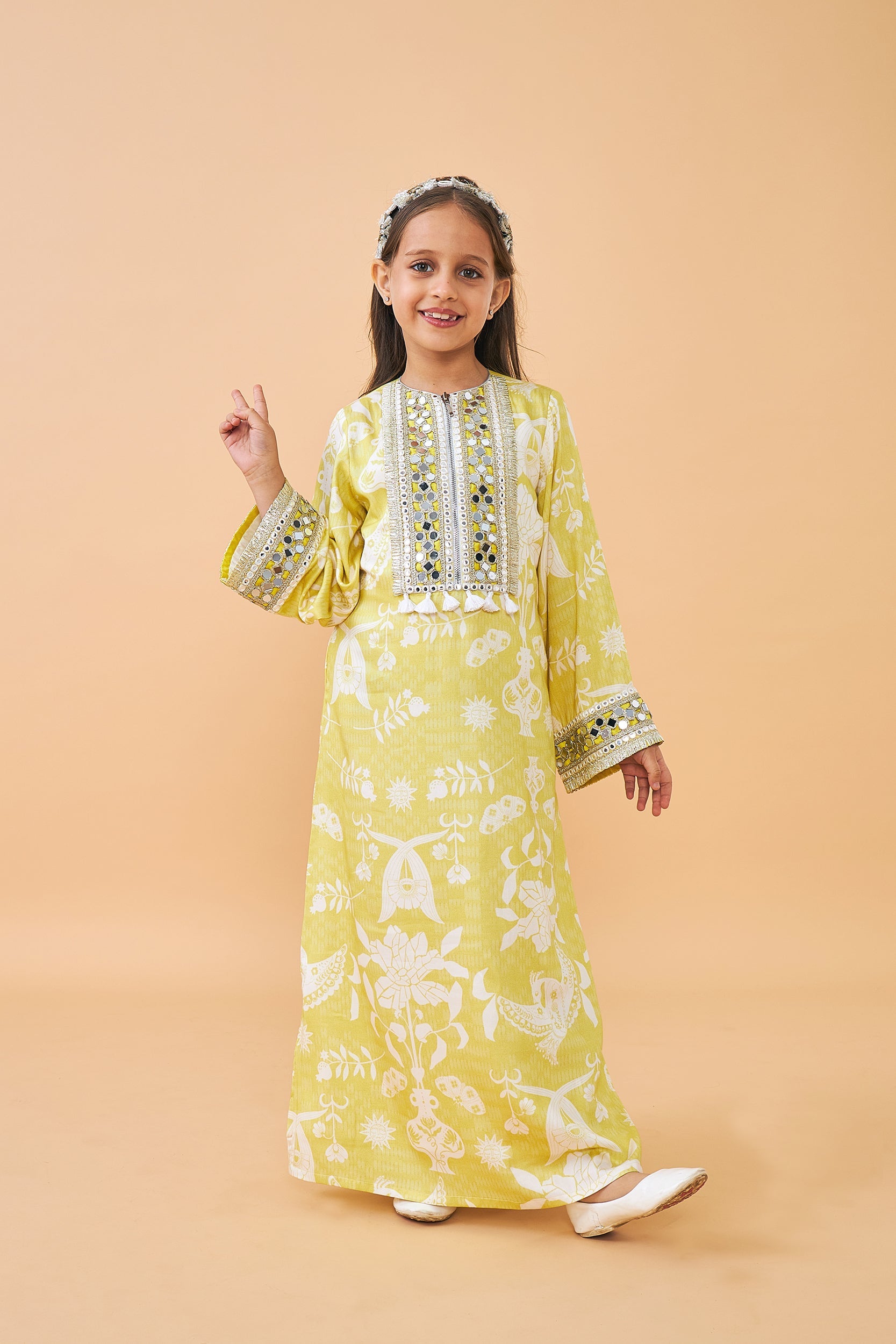 The Poppy Yellow Girls Long Dress is crafted in soft, breathable modal fabric, making it perfect for long festive days. Designed in a cheerful yellow-and-white print, it features silver mirrorwork and delicate ivory embroidery on the front yoke and cuffs, finished with playful tassels. With a comfortable, flowy fit and a back tie-up for adjustability, it’s ideal for outings.