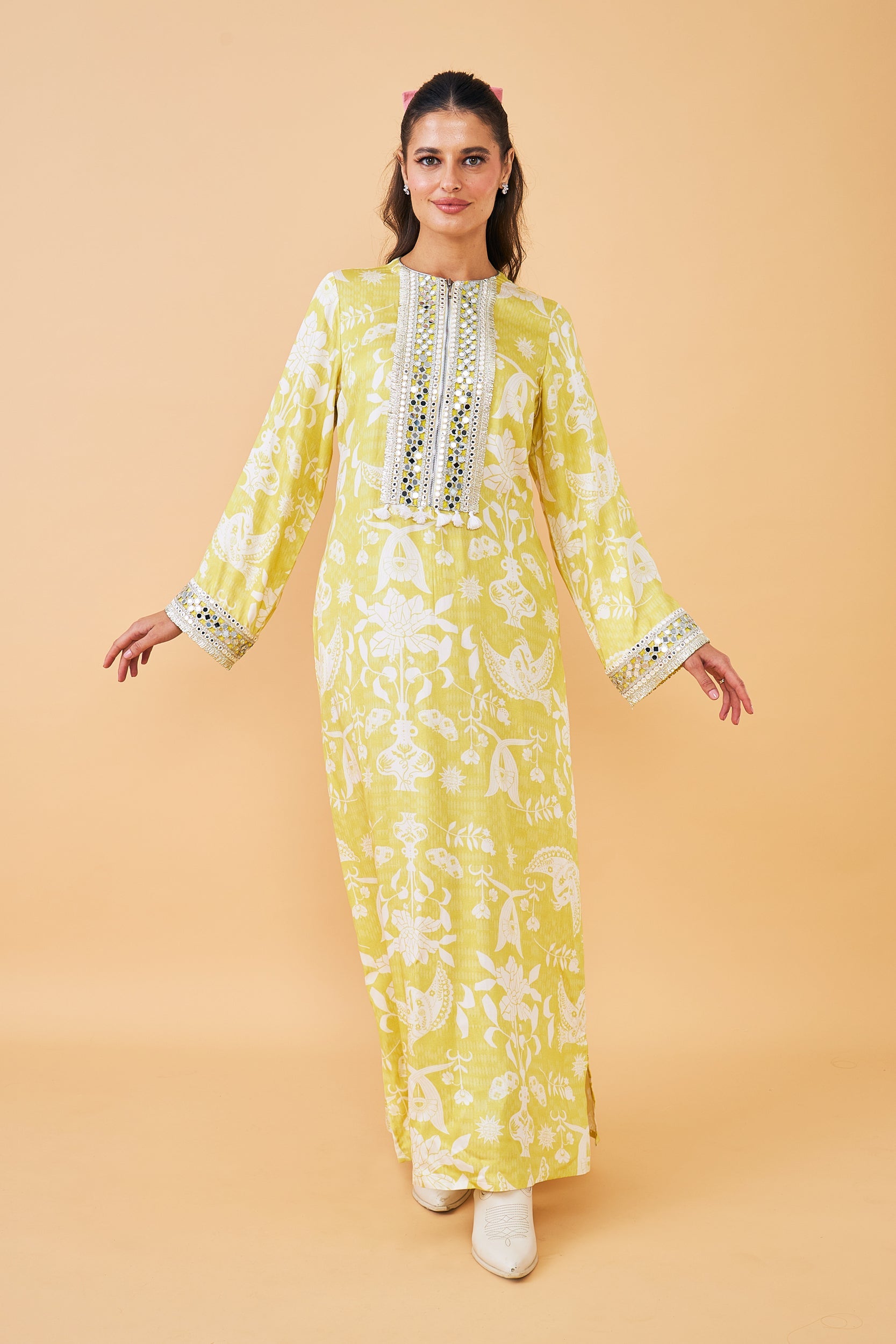 The Poppy Yellow Long Dress is crafted in soft, breathable modal fabric, making it perfect for long festive days. Designed in a cheerful yellow-and-white print, it features silver mirrorwork and delicate ivory embroidery on the front yoke and cuffs, finished with playful tassels. With a comfortable flowy fit and a back tie-up for adjustability, it’s ideal for Festive outings—and pairs beautifully with our bestselling Dala Printed Coat for a regal layered look.