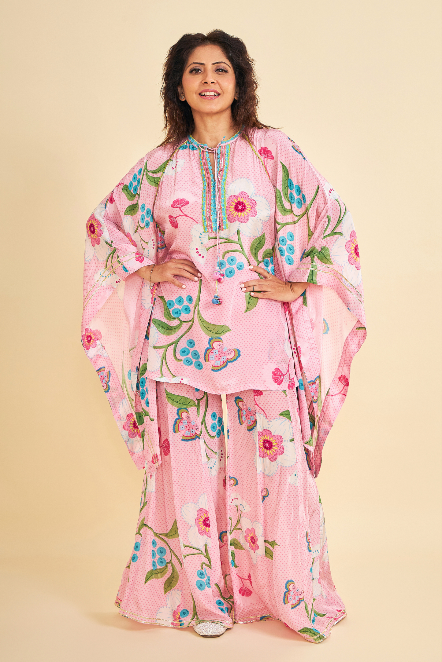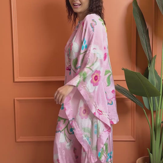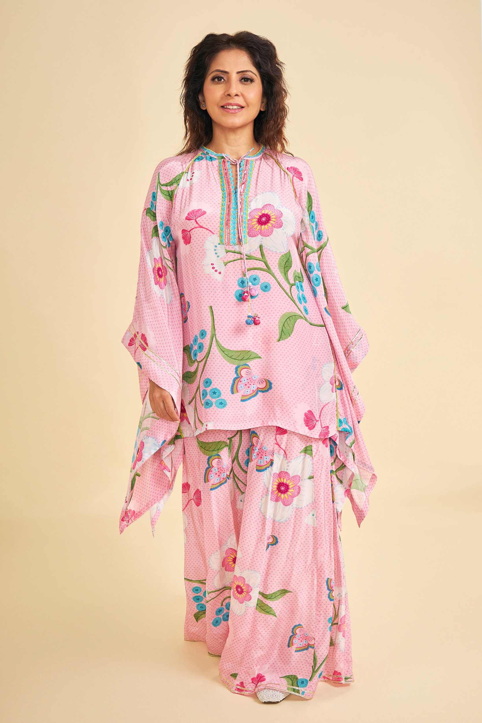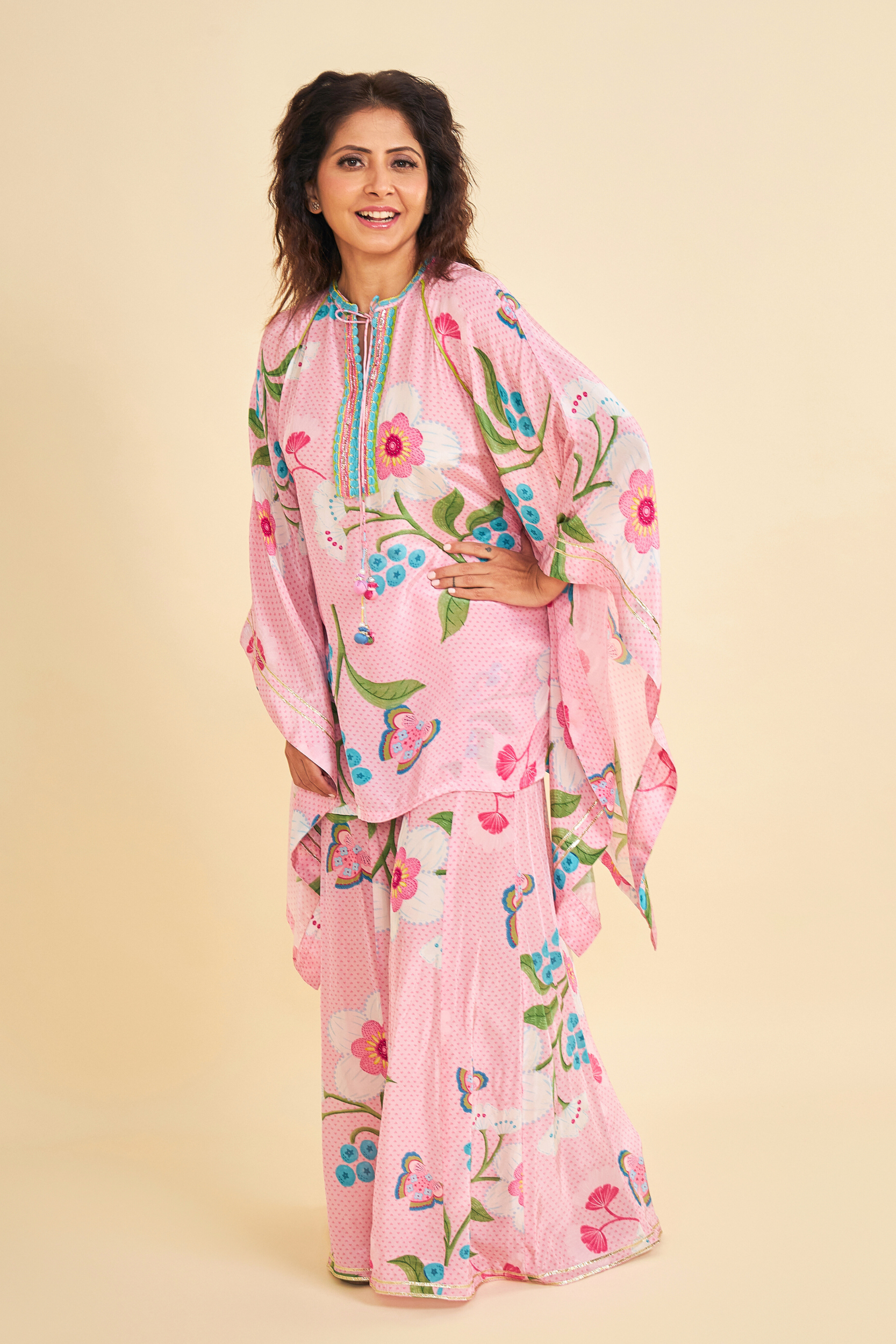 Turn heads in our Raya Pink Printed Coord Set, Inspired by a kaftan silhouette, the Tunic features intricate hand embroidery and embellishments along the front placket, finished with handmade tie-up tassels that add a playful flair. Paired with matching elasticated palazzo-style pants, finished with simple gota edging — makes it perfect for light celebrations, brunches to feel your radiant best.
