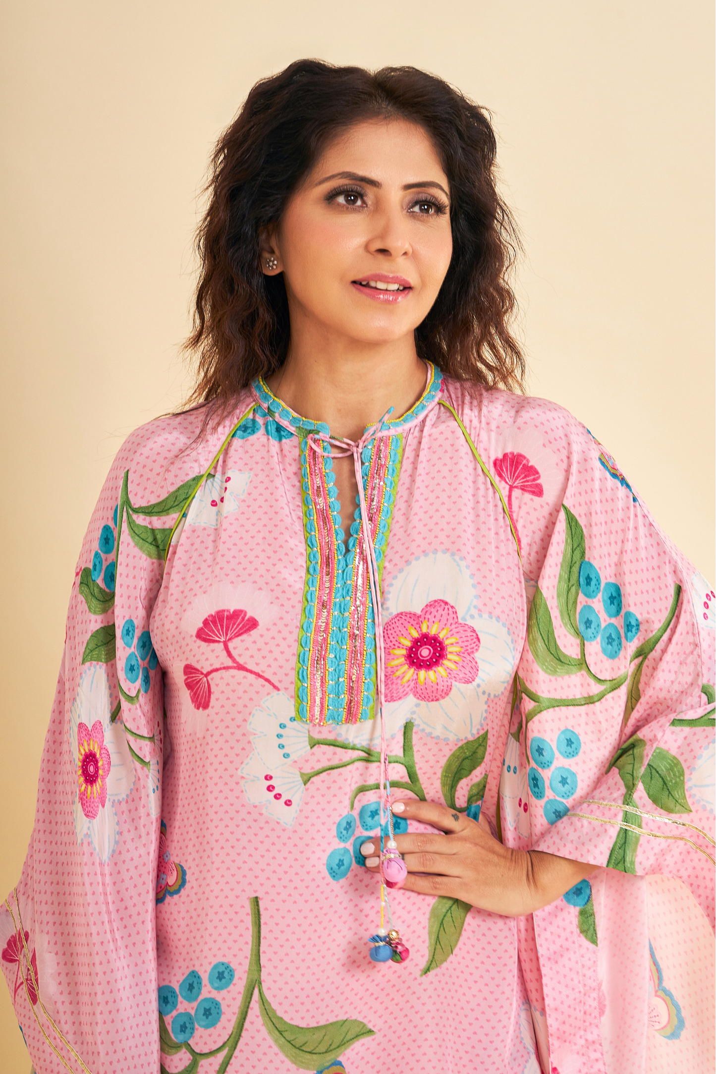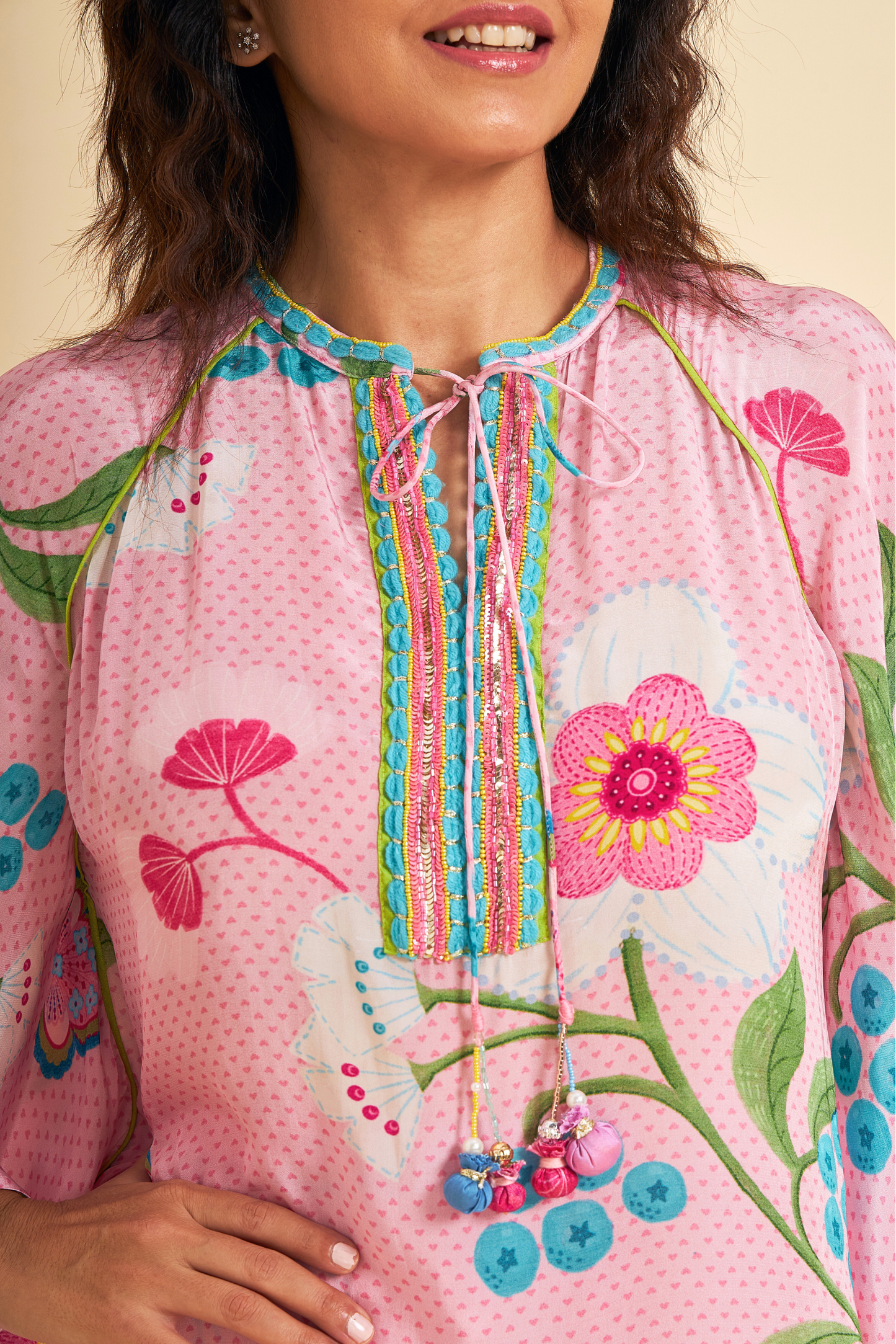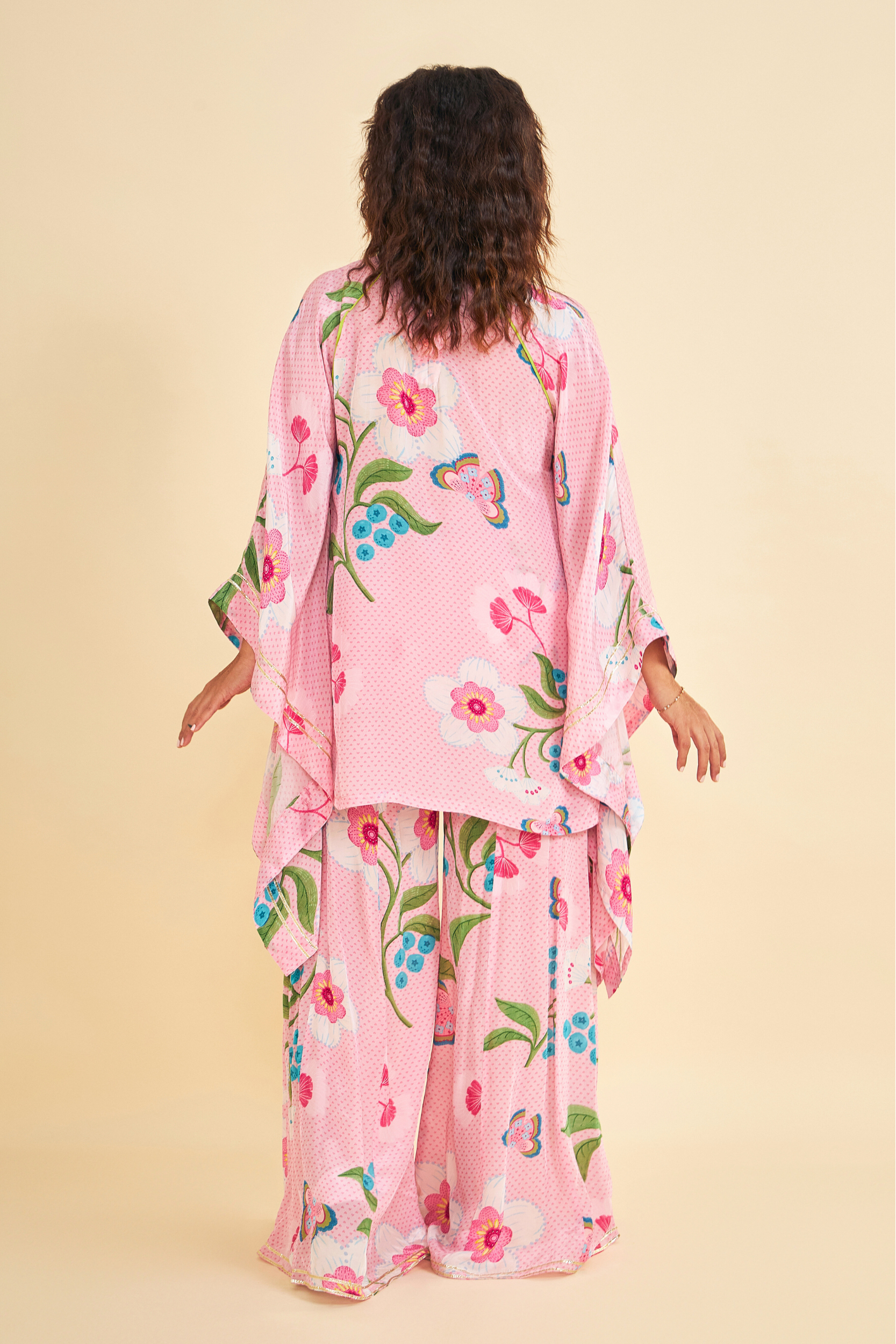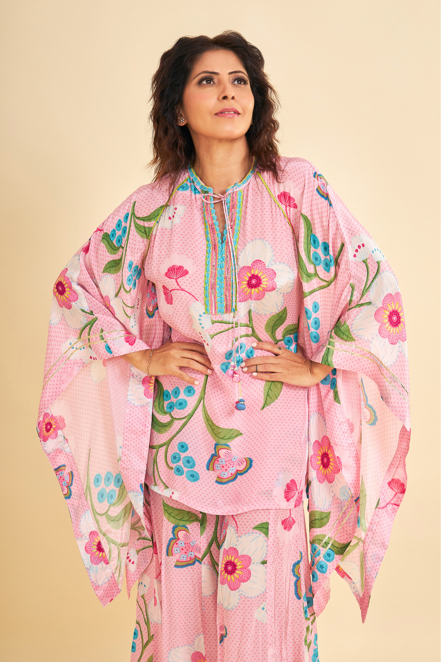 Turn heads in our Raya Pink Printed Coord Set, Inspired by a kaftan silhouette, the Tunic features intricate hand embroidery and embellishments along the front placket, finished with handmade tie-up tassels that add a playful flair. Paired with matching elasticated palazzo-style pants, finished with simple gota edging — makes it perfect for light celebrations, brunches to feel your radiant best.