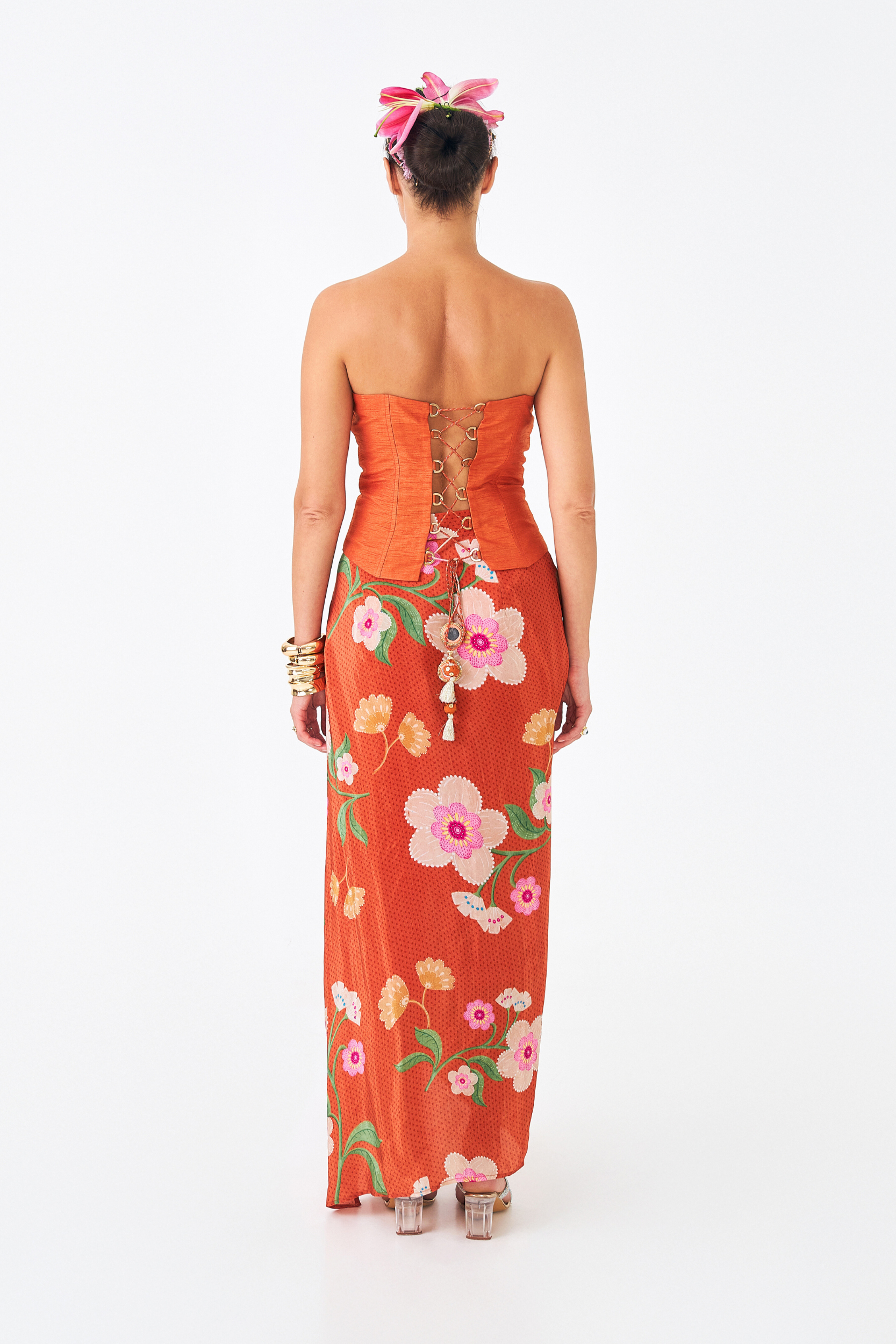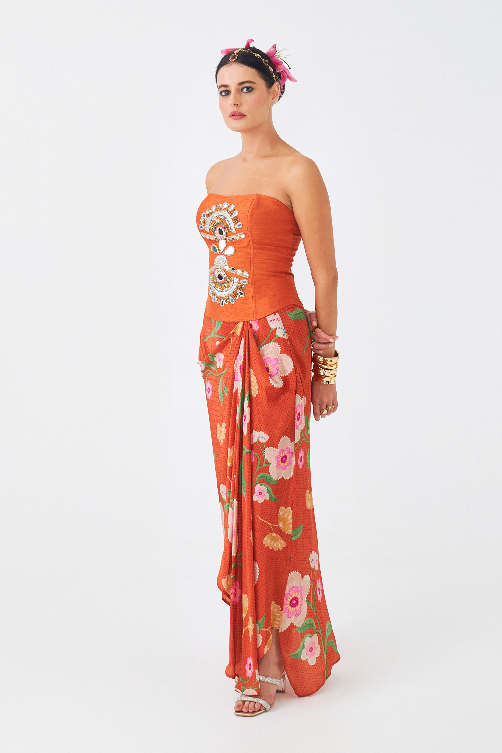 The Riva Embellished Corset Blends Contemporary Design With Intricate Craftsmanship. Made for the Modern Woman. The Solid Rust-orange Corset Features Exquisite Hand-embellishment at the Centre With Mirrorwork, Gold Pitta, Cutdana, Gota, Acrylic Sequins, and Tikki, Finished With Adjustable Crisscross Back Tie-ups and Handmade Tassels.