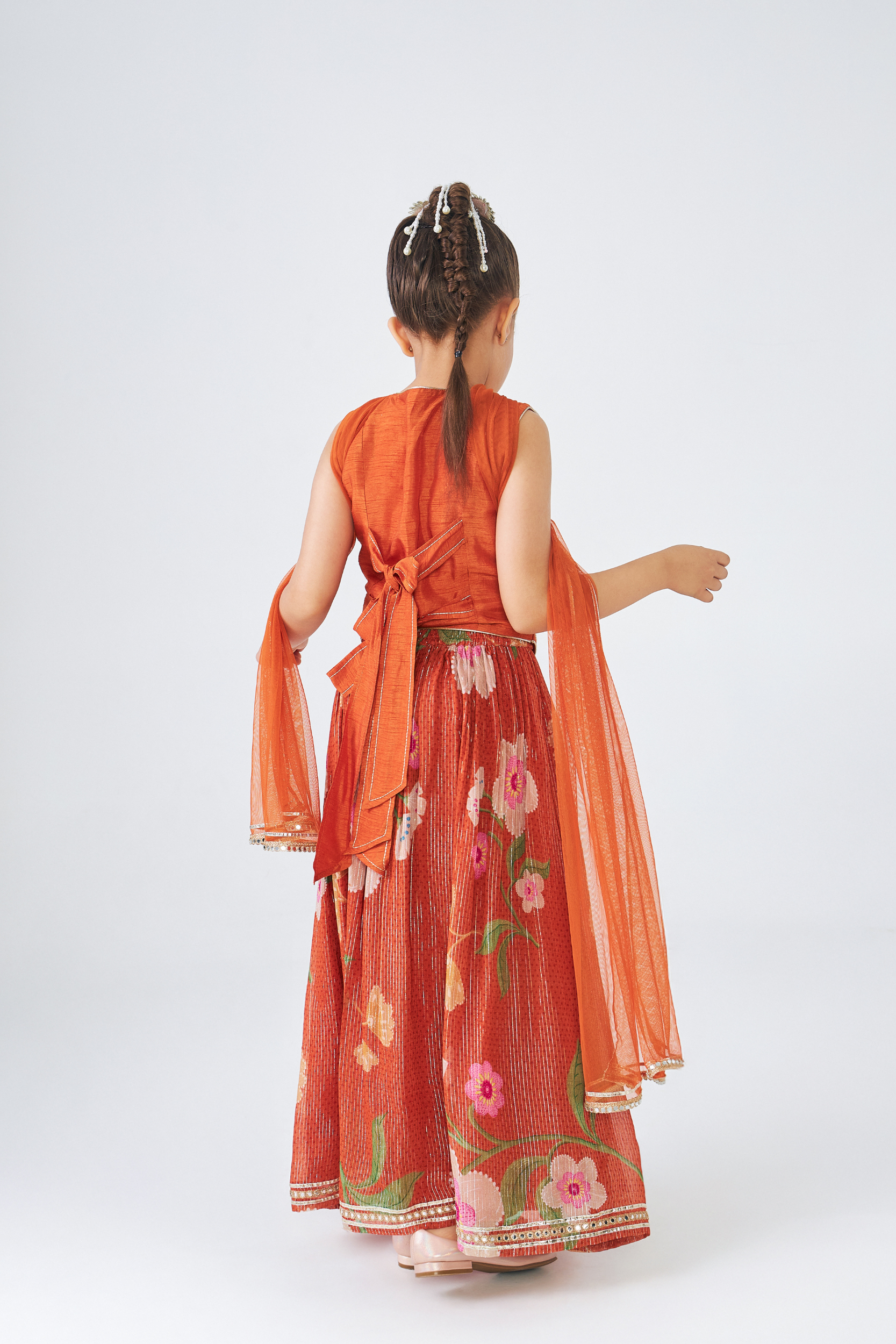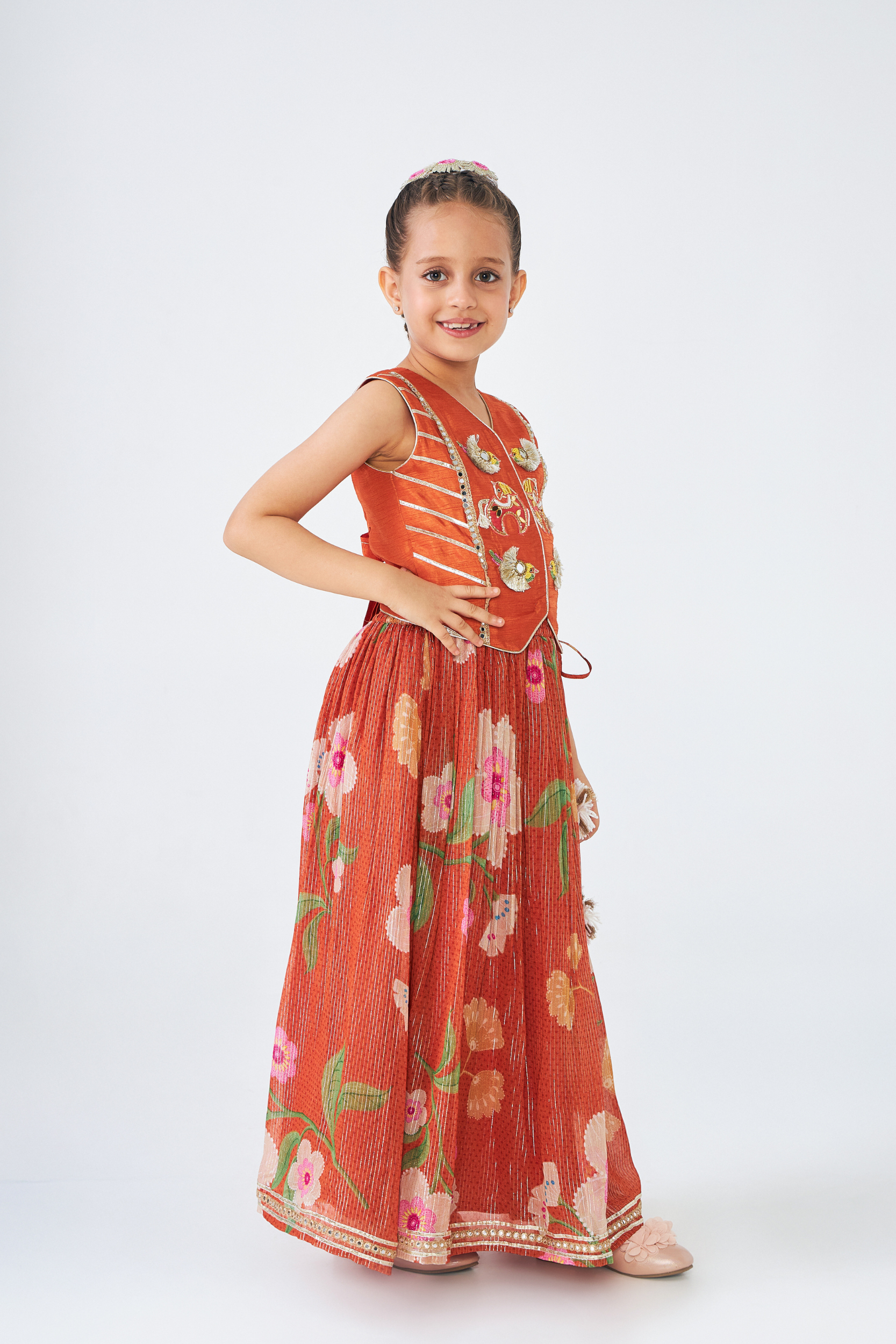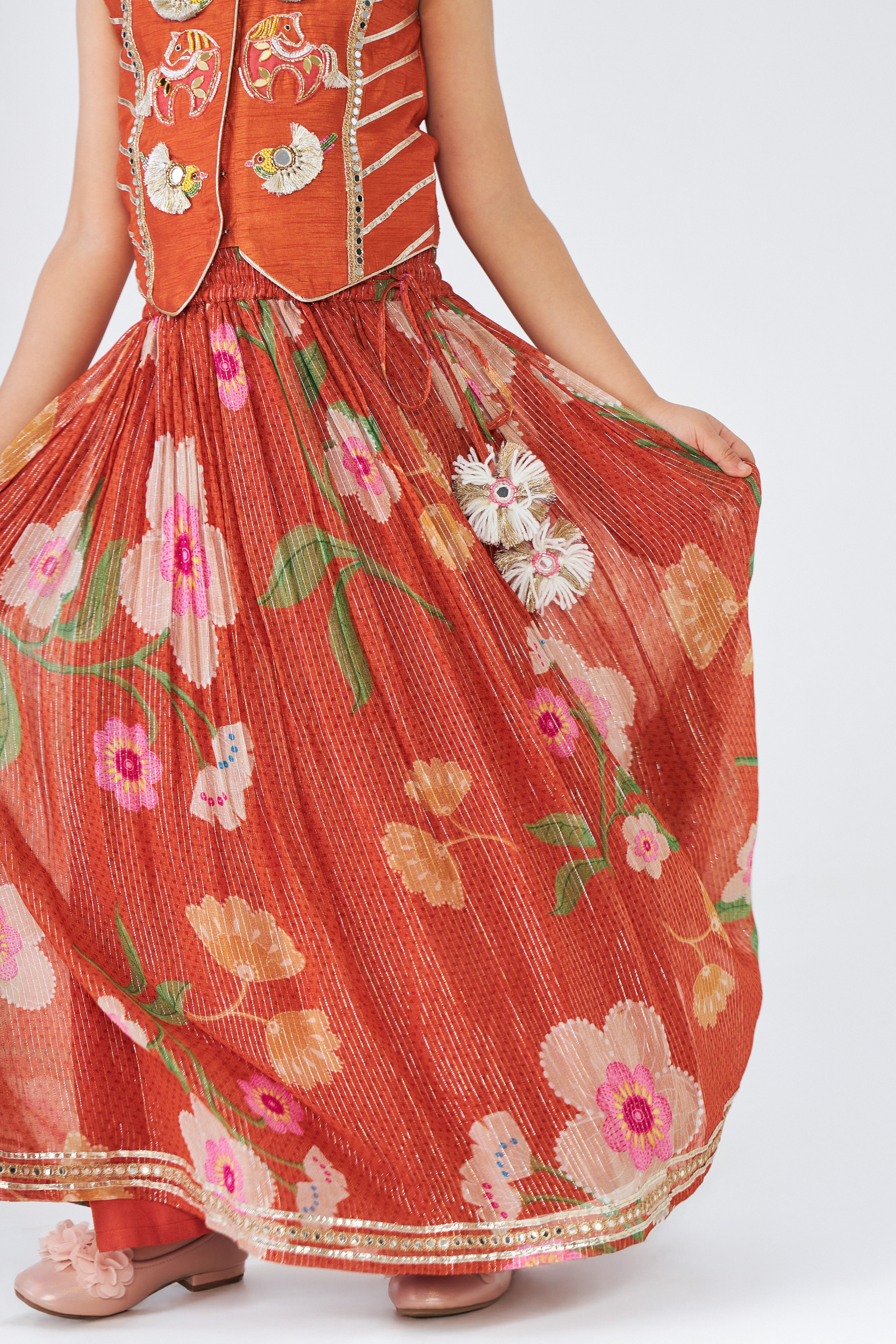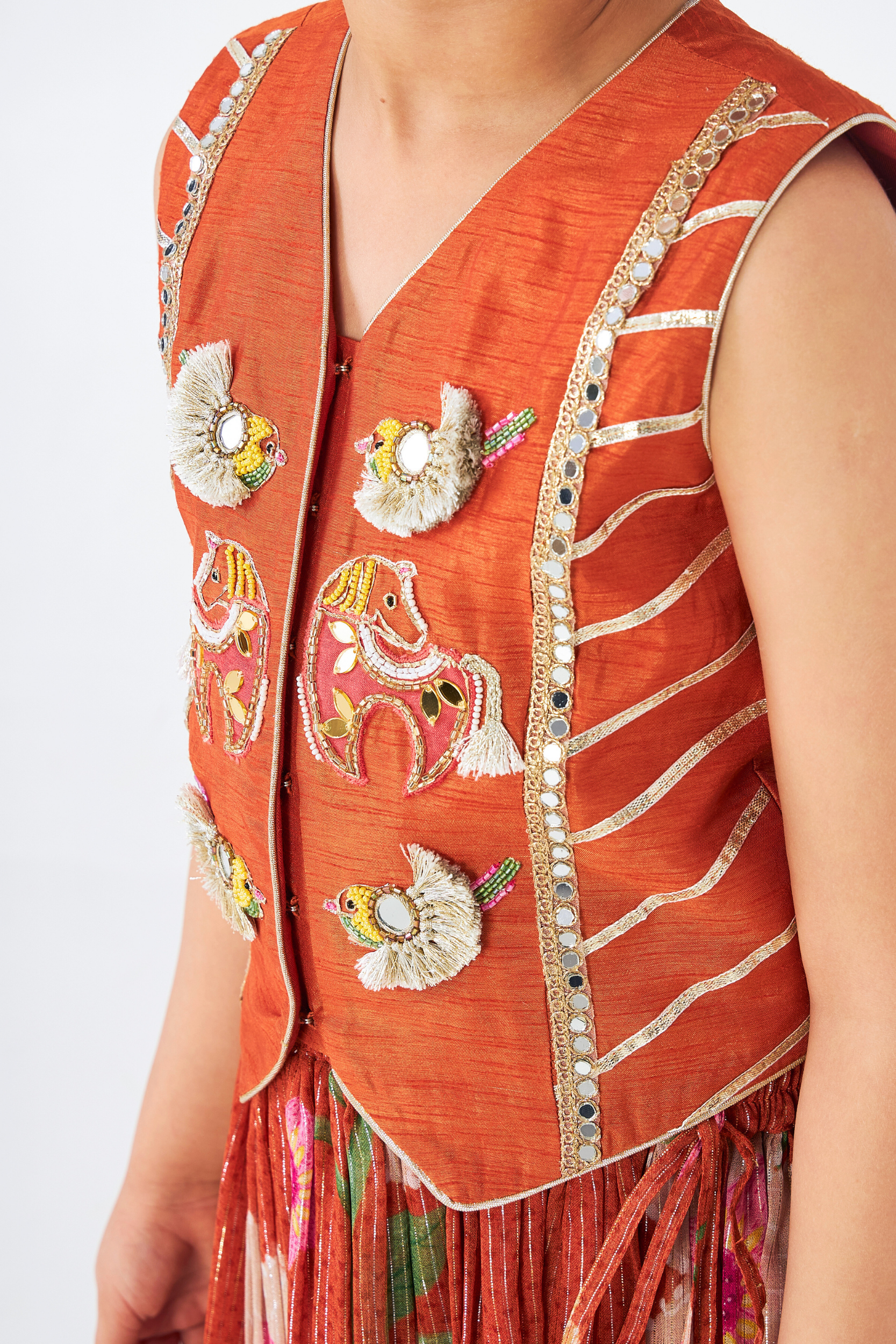 All Eyes on You! The Riva Short Embroidered Girls Top & Skirt Set (3 Pcs) is a Festive-ready Look in a Vibrant Rust Orange and Riva Print. The Embroidered Vest Top Features Adorable Horses and Birds in Mirror, Gota, Threadwork, and Pitta Detailing. Paired With Printed Skirt With Gold Lurex Finished With Mirror Lace —this Set is Perfect for Weddings, Diwali, and Family Occasions.