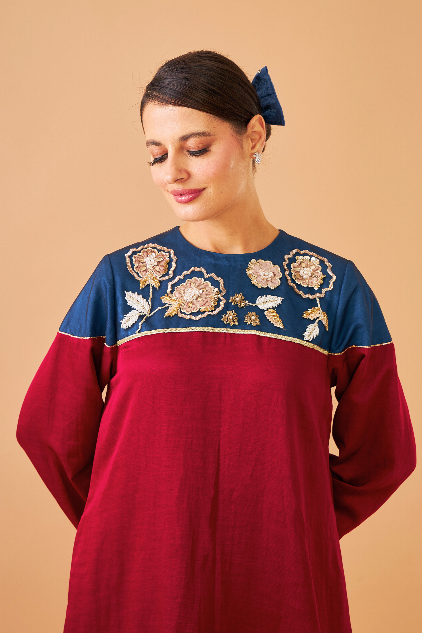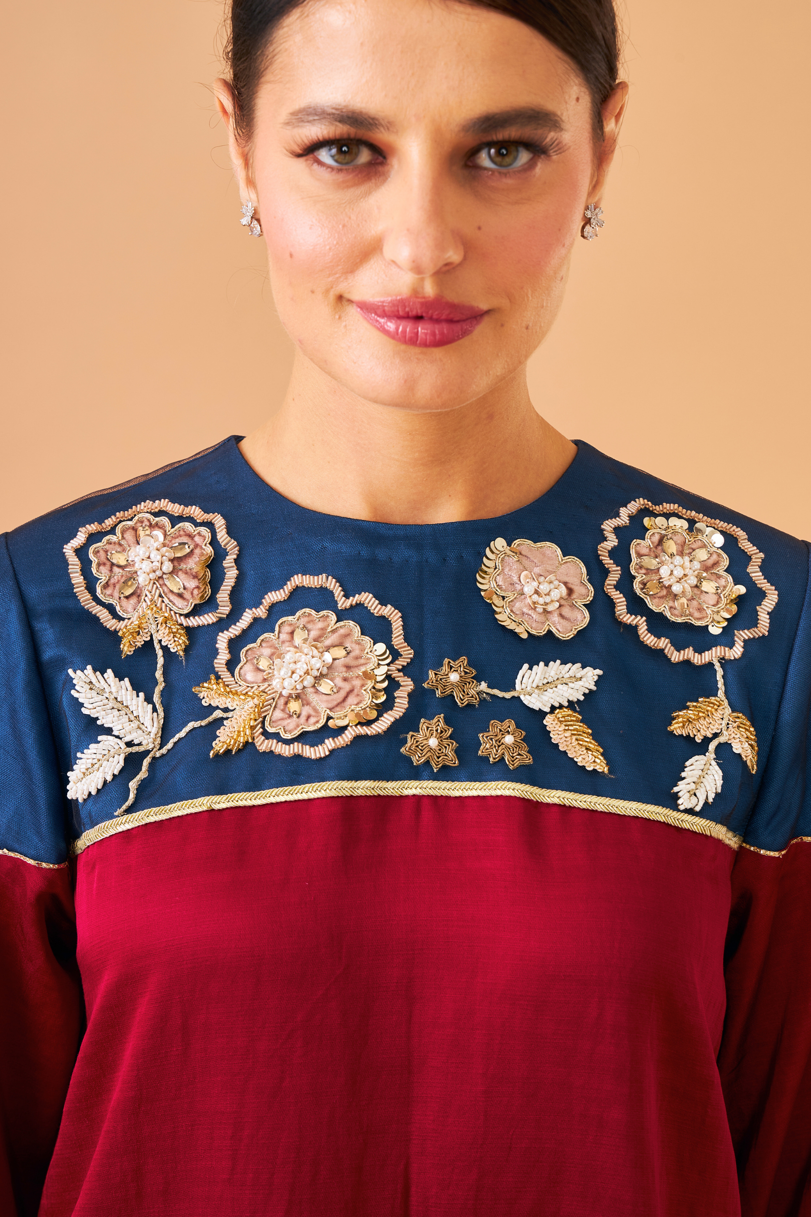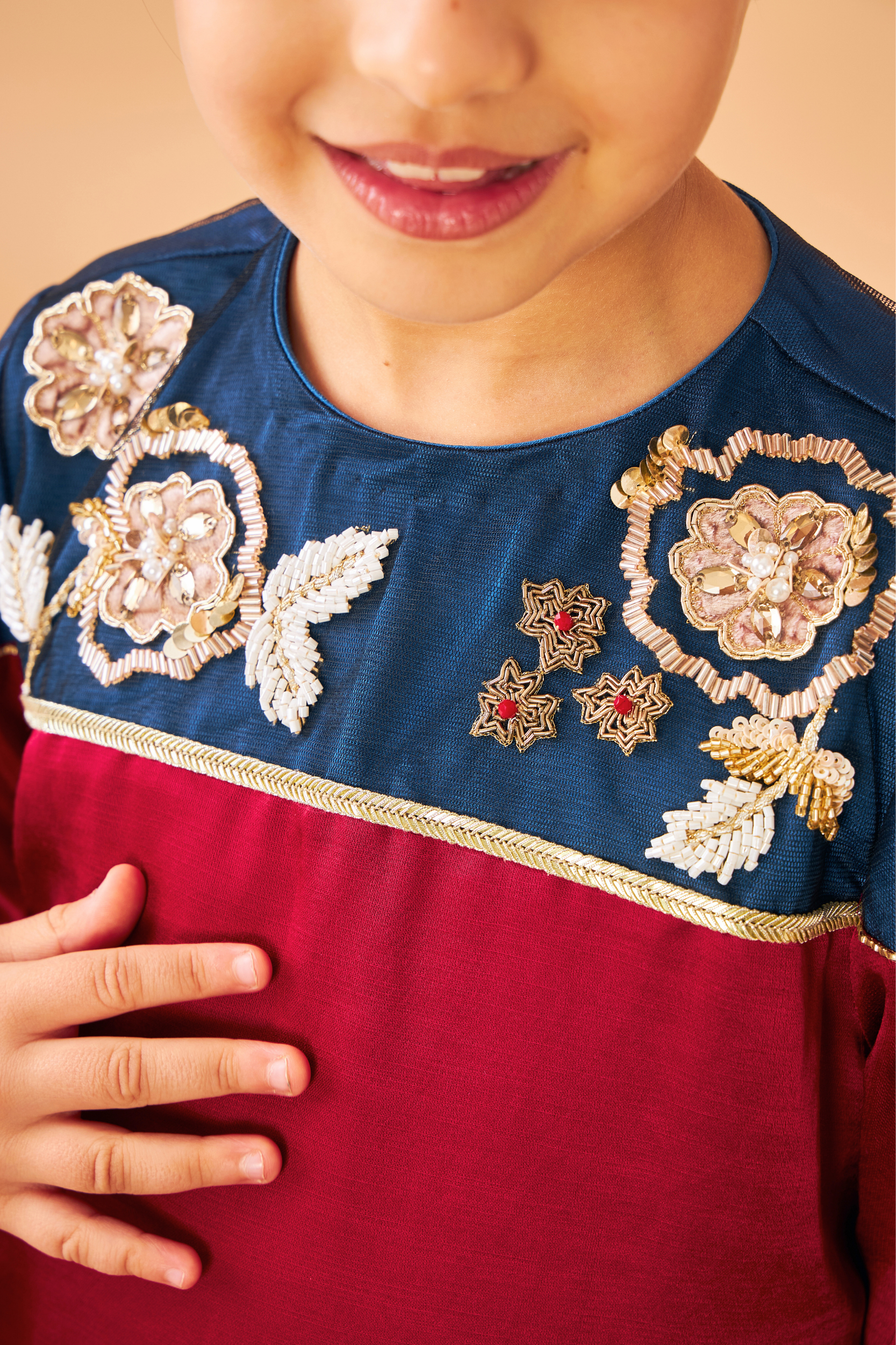 - Embroidered yoke on mesh with mirror, thread & sequin embellishment