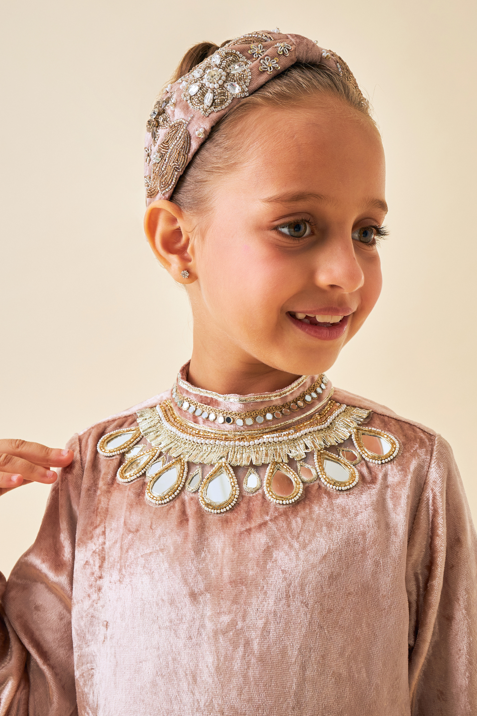 The Tifara Long Dress features beige velvet that gives the silhouette a sleek and sophisticated finish. Designed as a full-length dress with long sleeves, it is accented with delicate embroidery along the neckline for a refined touch. This look is effortlessly chic and perfect for elegant evenings and special celebrations.