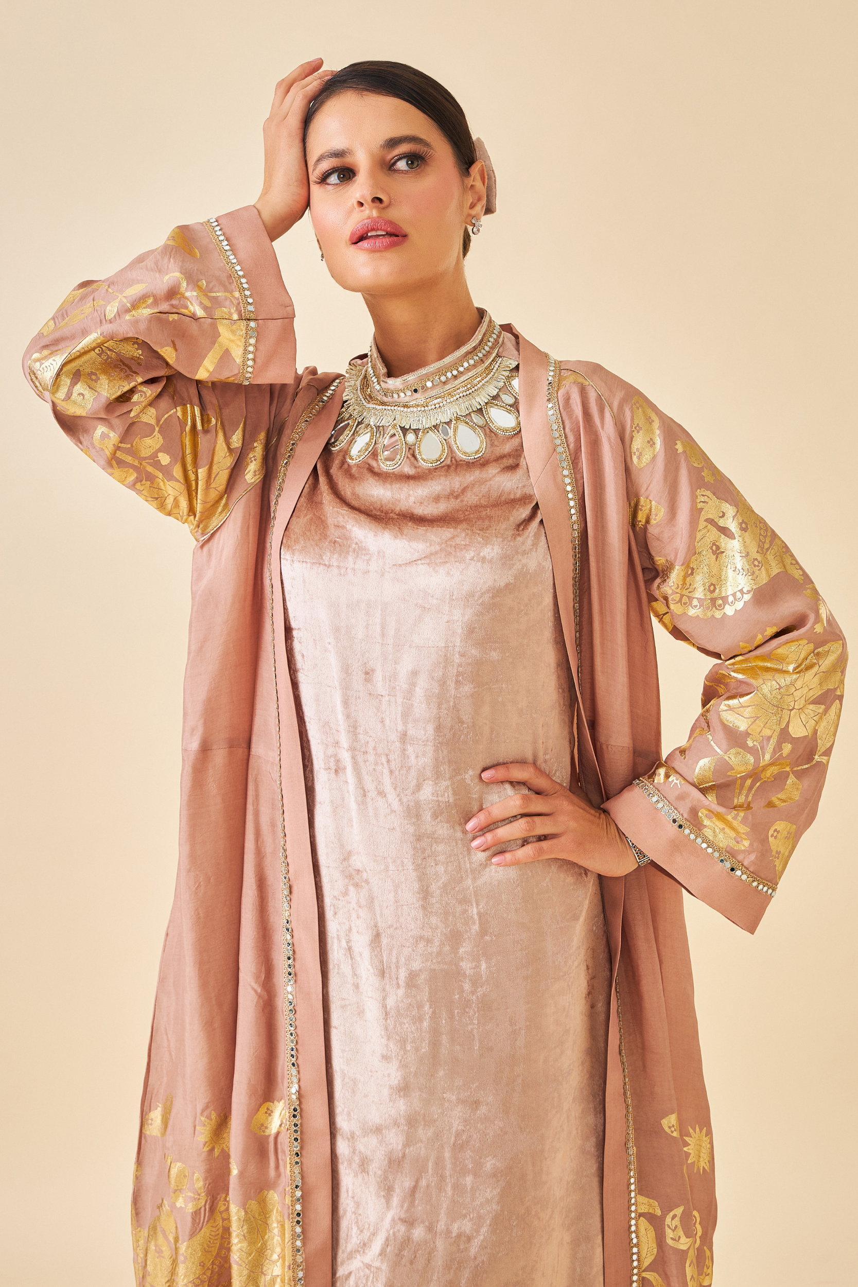 Turn Heads in our Tiffara Velvet Long Dress is an elegant, festive silhouette crafted in a dark beige and highlighted with delicate embroidery along the neckline, adding a rich handcrafted charm. Best paired with our Tiffara Gold Raglan-Style Coat for a regal touch—made in shimmering gold print, accented with delicate mirror lace—for a luxurious Festive-ready look that feels refined and radiant.