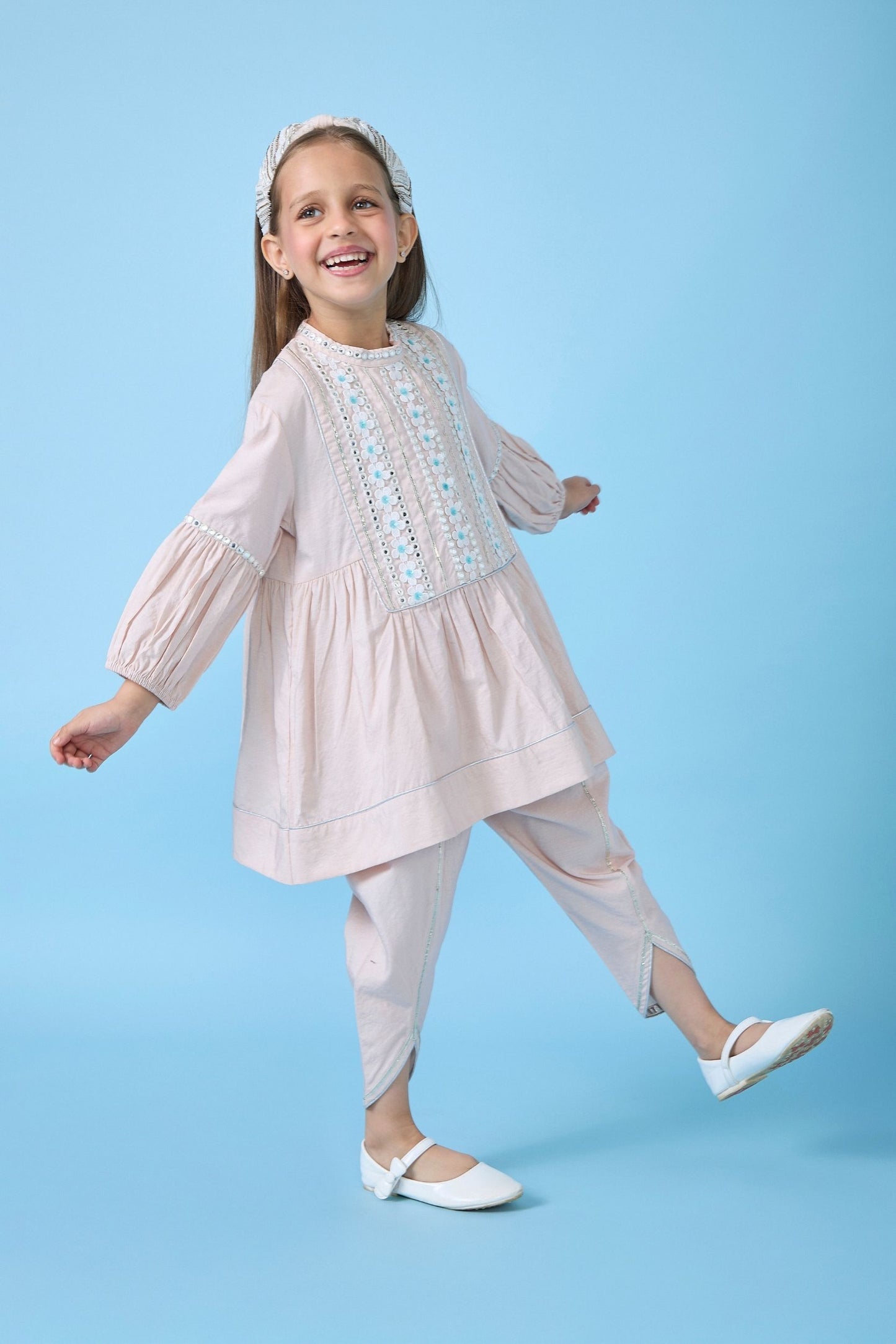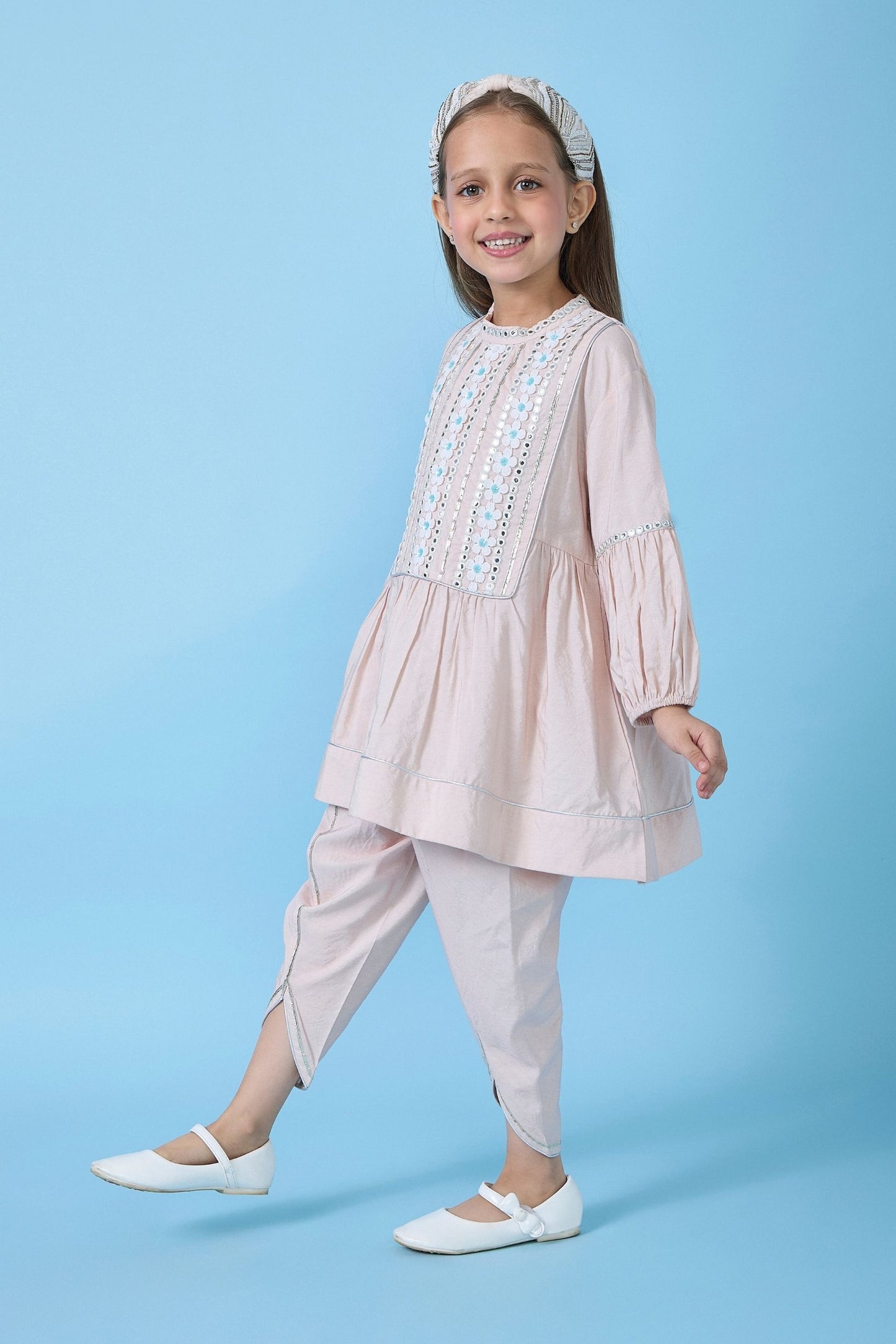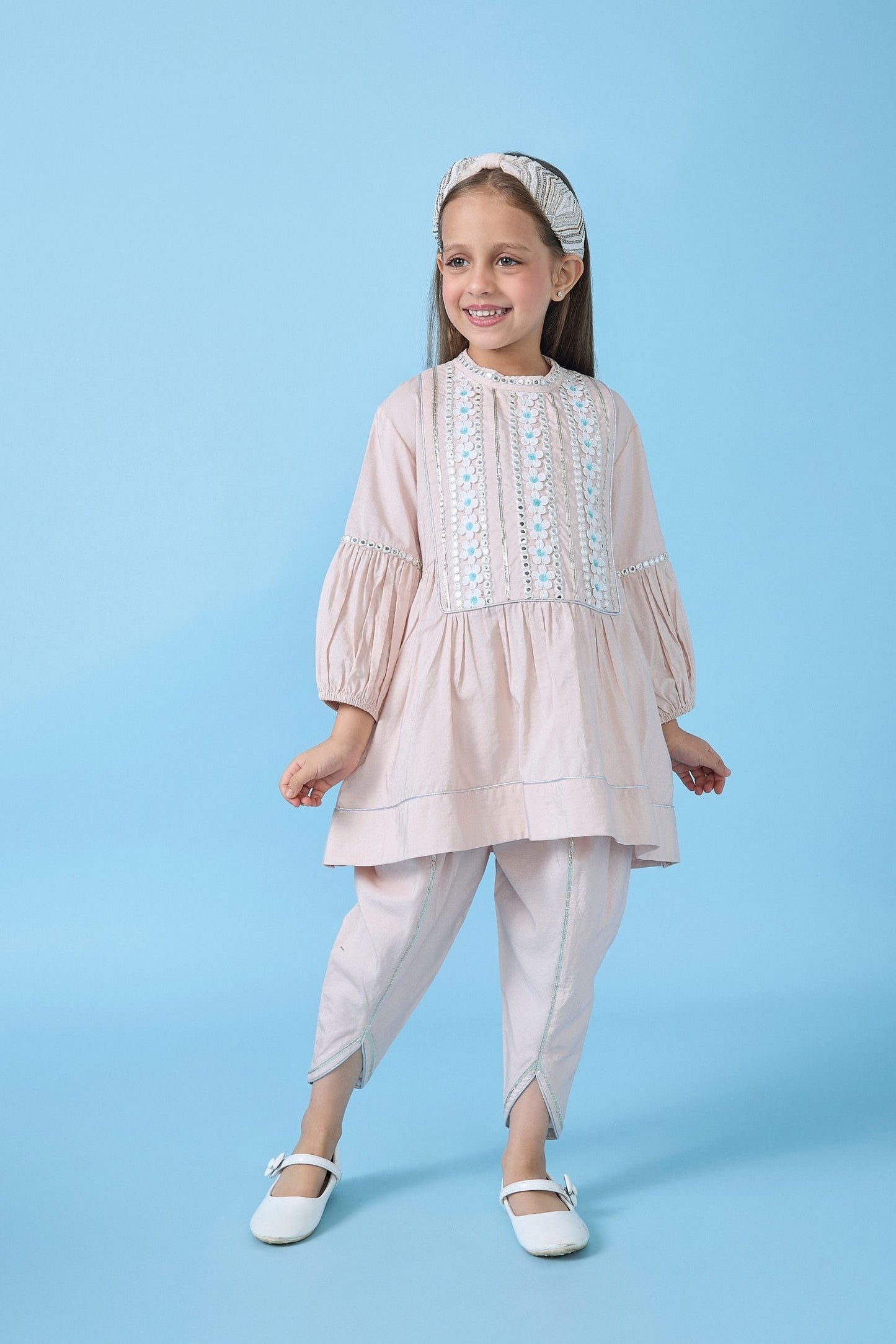 This light and chic baby pink set is a stylish alternative for your festive occasions. Featuring a delicate floral embroidered yoke, it exudes elegance and charm. Paired with matching baby pink tulip-shaped pants, this ensemble is perfect for those who love effortless sophistication with a playful twist.