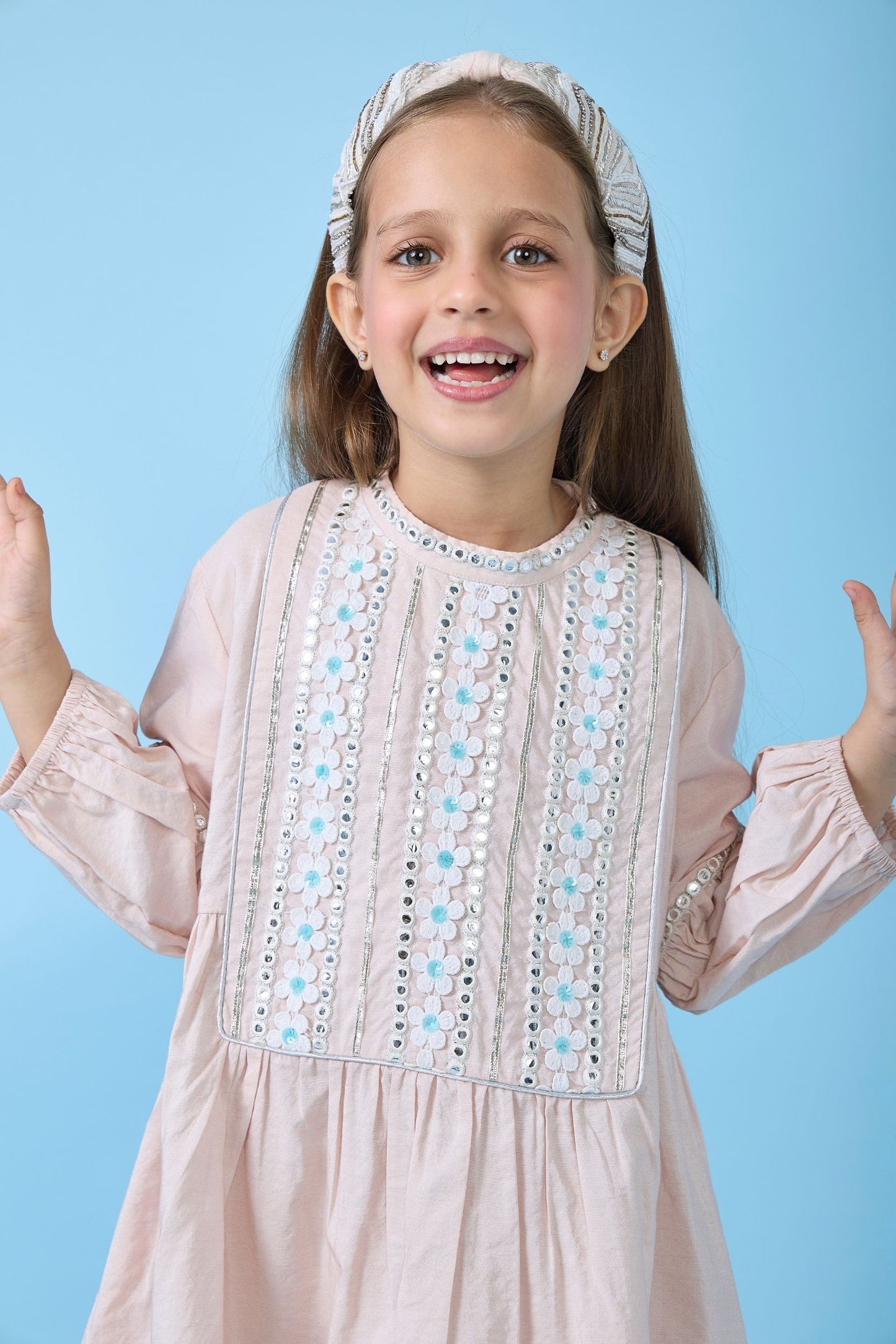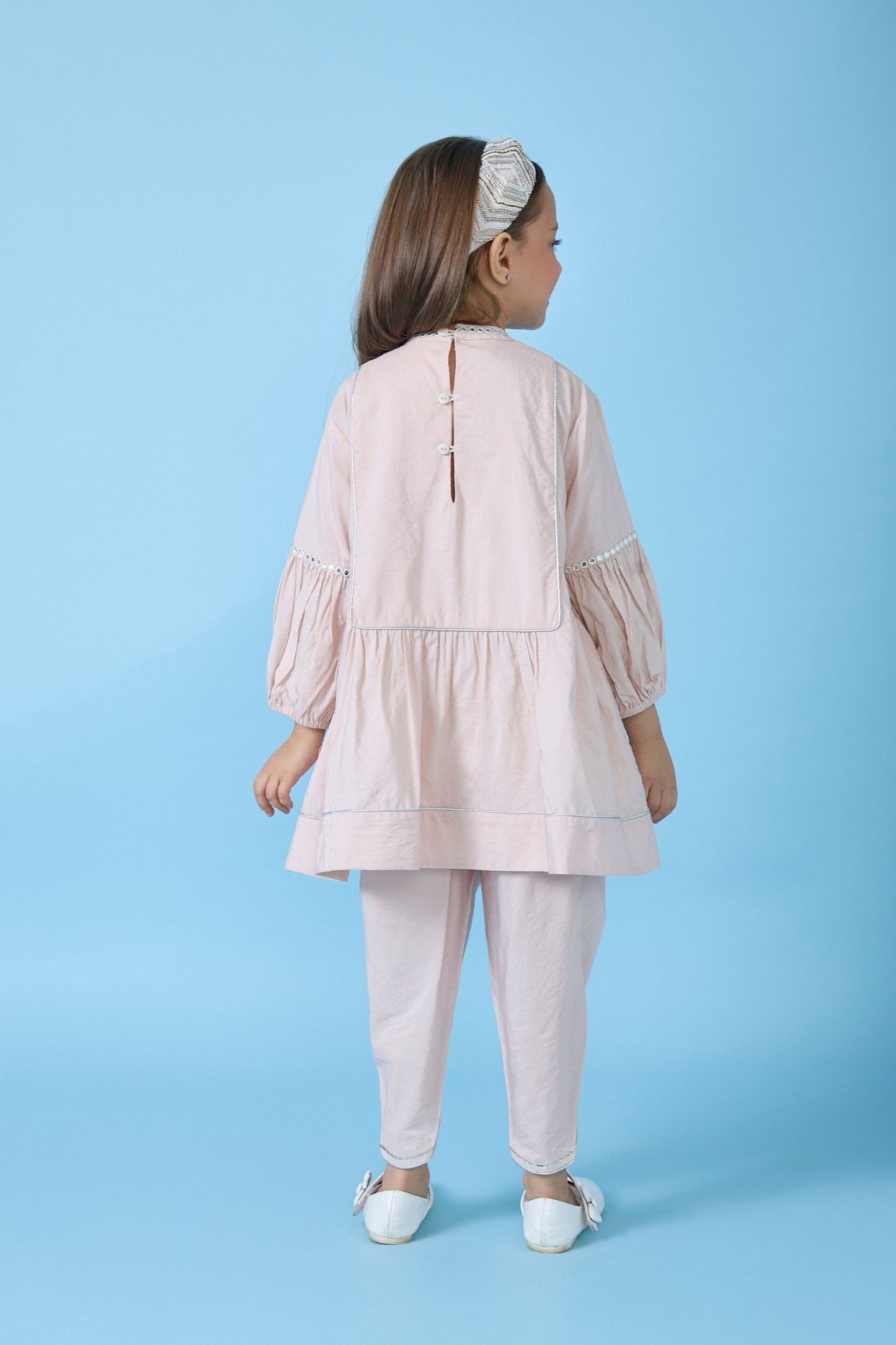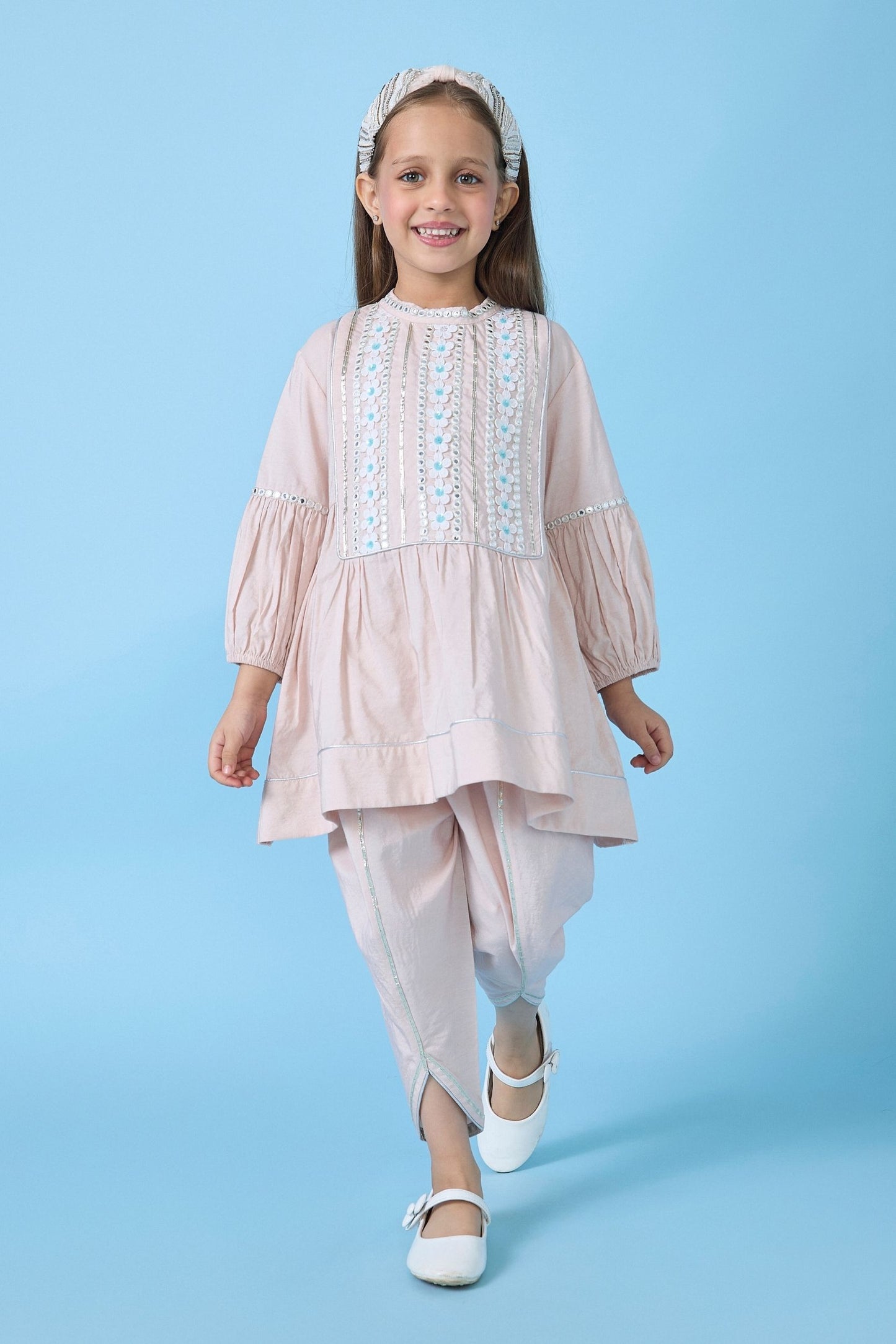 This light and chic baby pink set is a stylish alternative for your festive occasions. Featuring a delicate floral embroidered yoke, it exudes elegance and charm. Paired with matching baby pink tulip-shaped pants, this ensemble is perfect for those who love effortless sophistication with a playful twist.