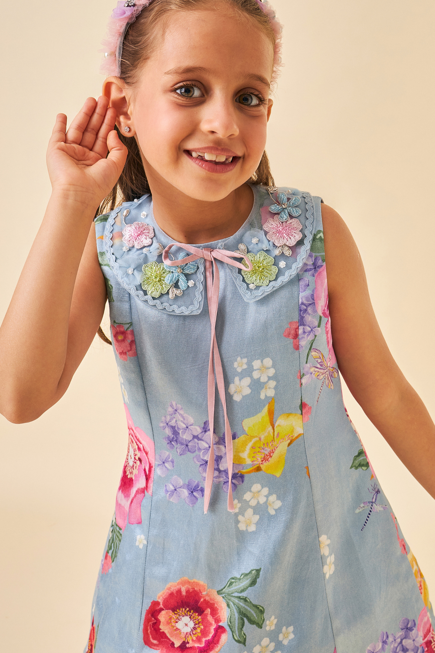 The Zehra Blue Girls Collar Dress features a beautifully hand-painted floral print set against a soft blue base, creating a charming and dreamy look. This knee-length silhouette is cinched at the waist and finished with soft mesh gathers that add a gentle flare at the bottom. It comes with a stunning detachable embroidered mesh collar adorned with organza and embroidered flowers—making it a versatile, elegant choice for gatherings, festive outings and special celebrations.