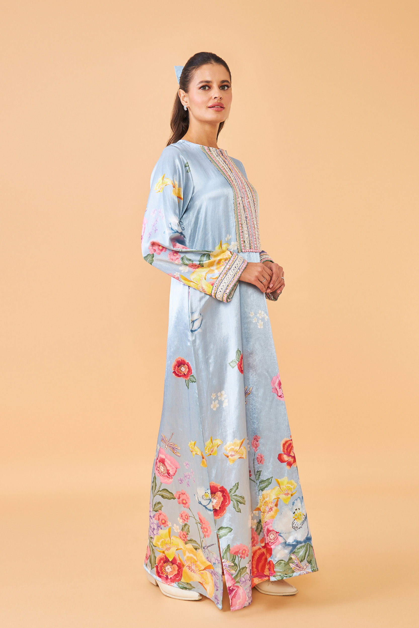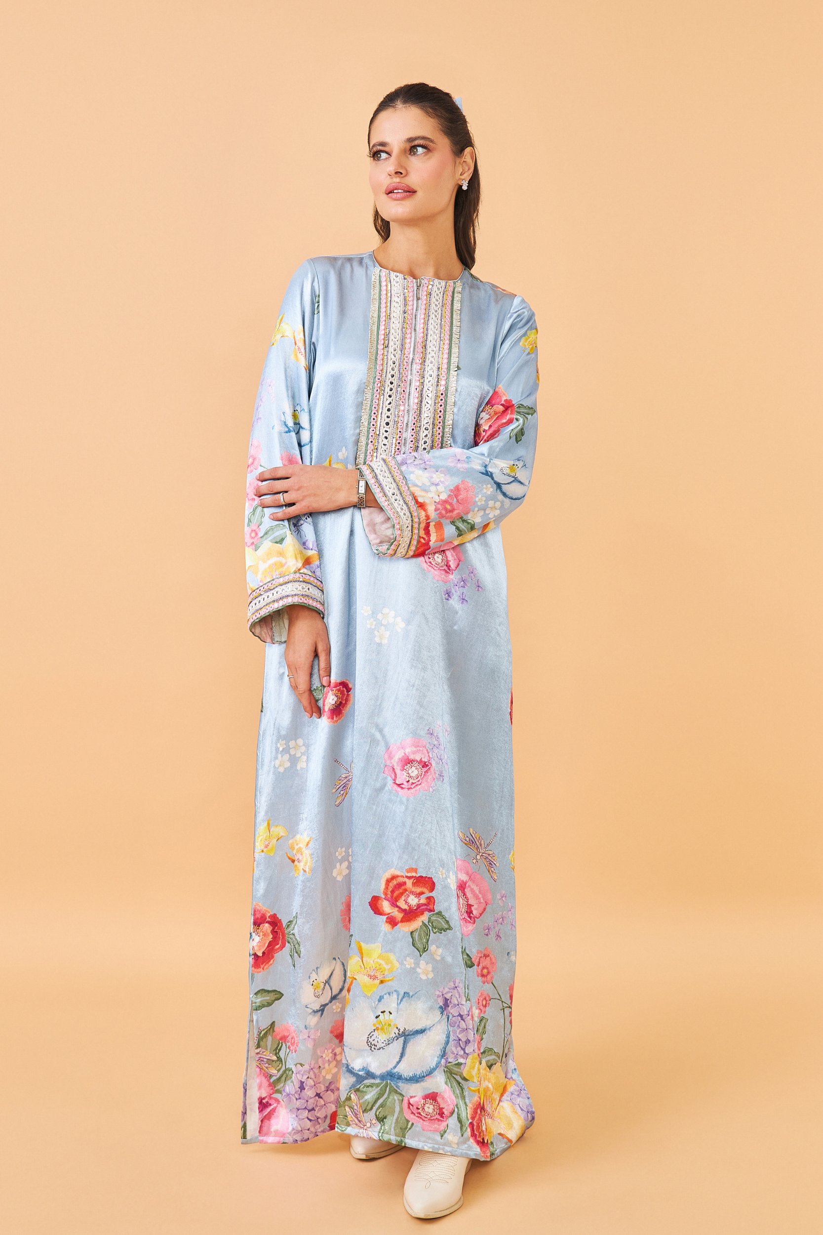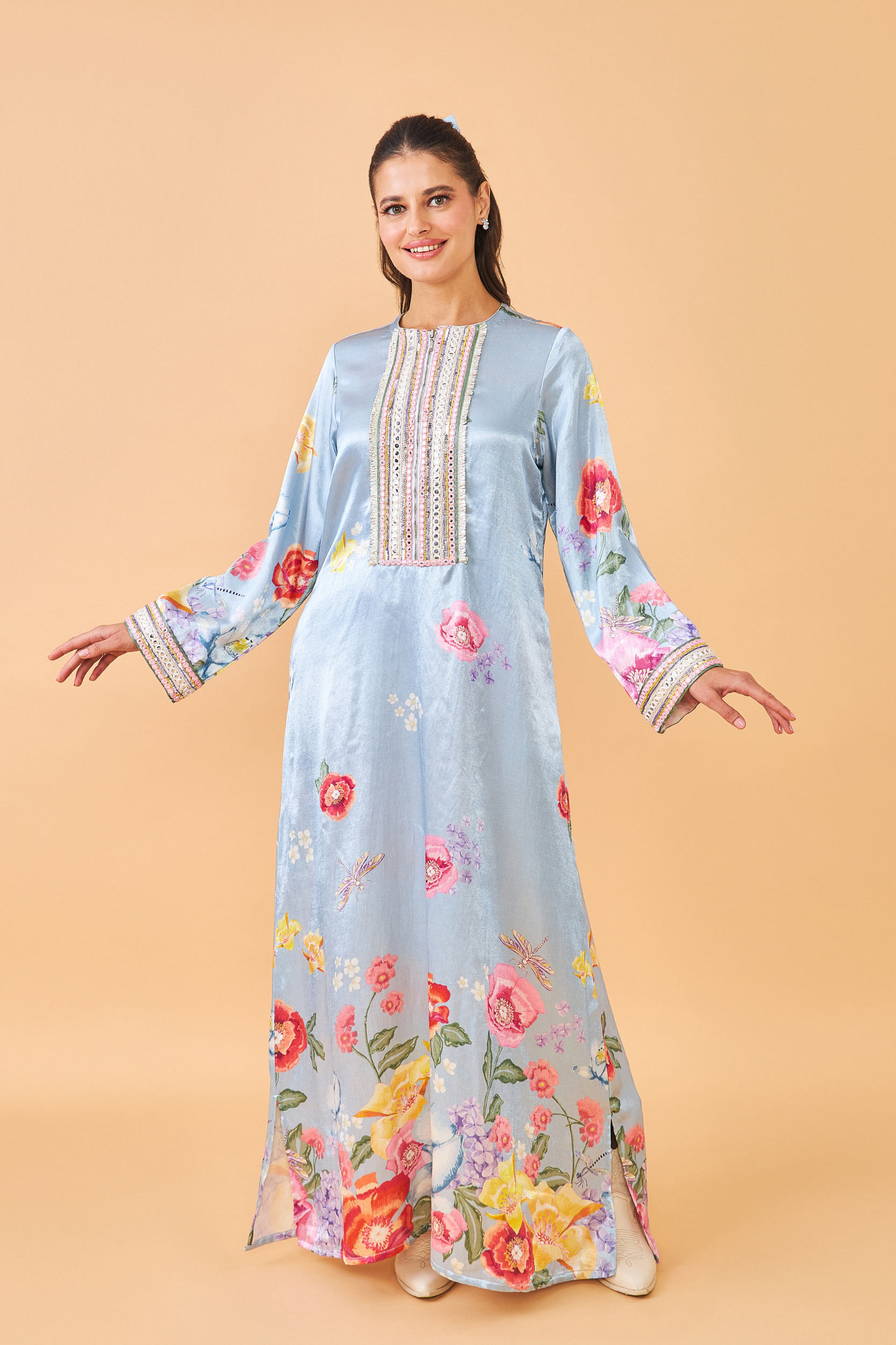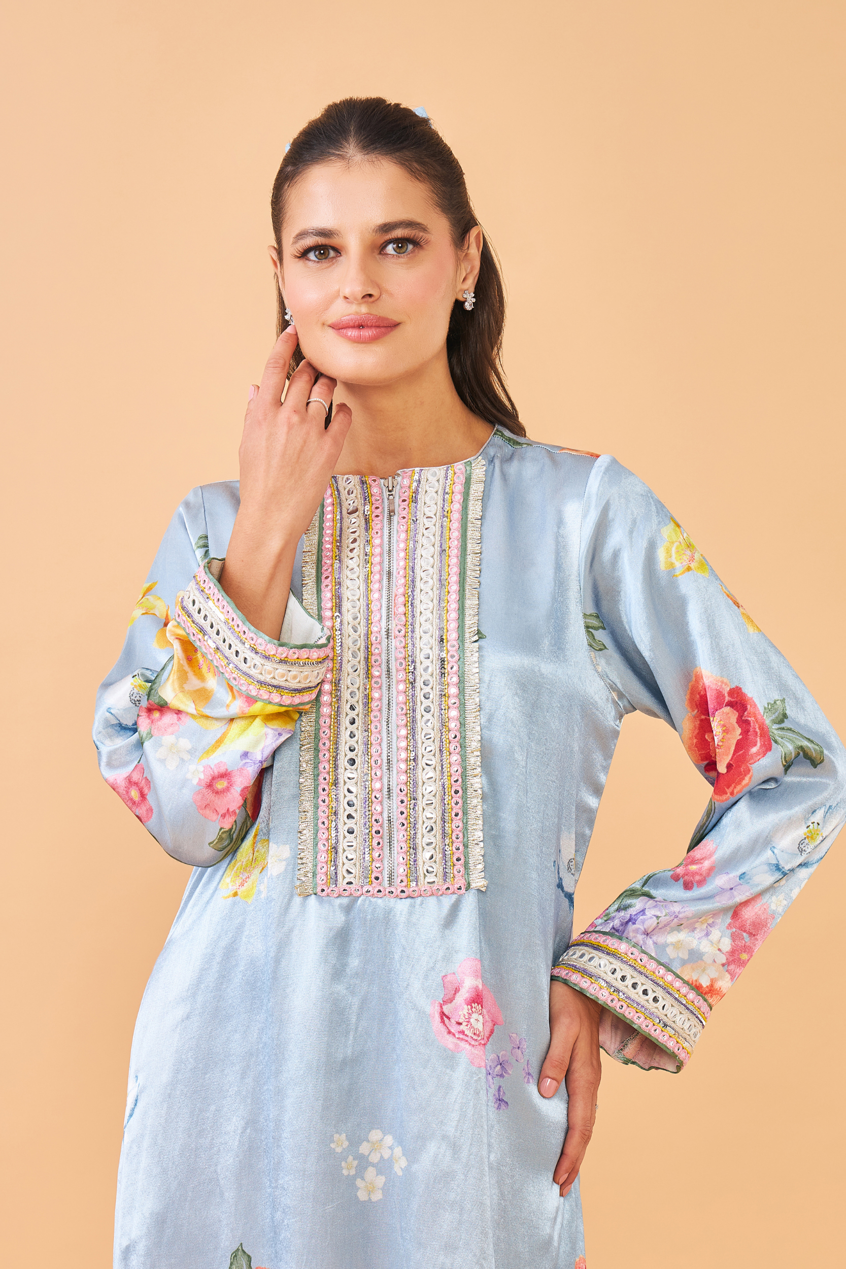 - Dress embroidered around the neck with mirror, thread & sequin embellishment